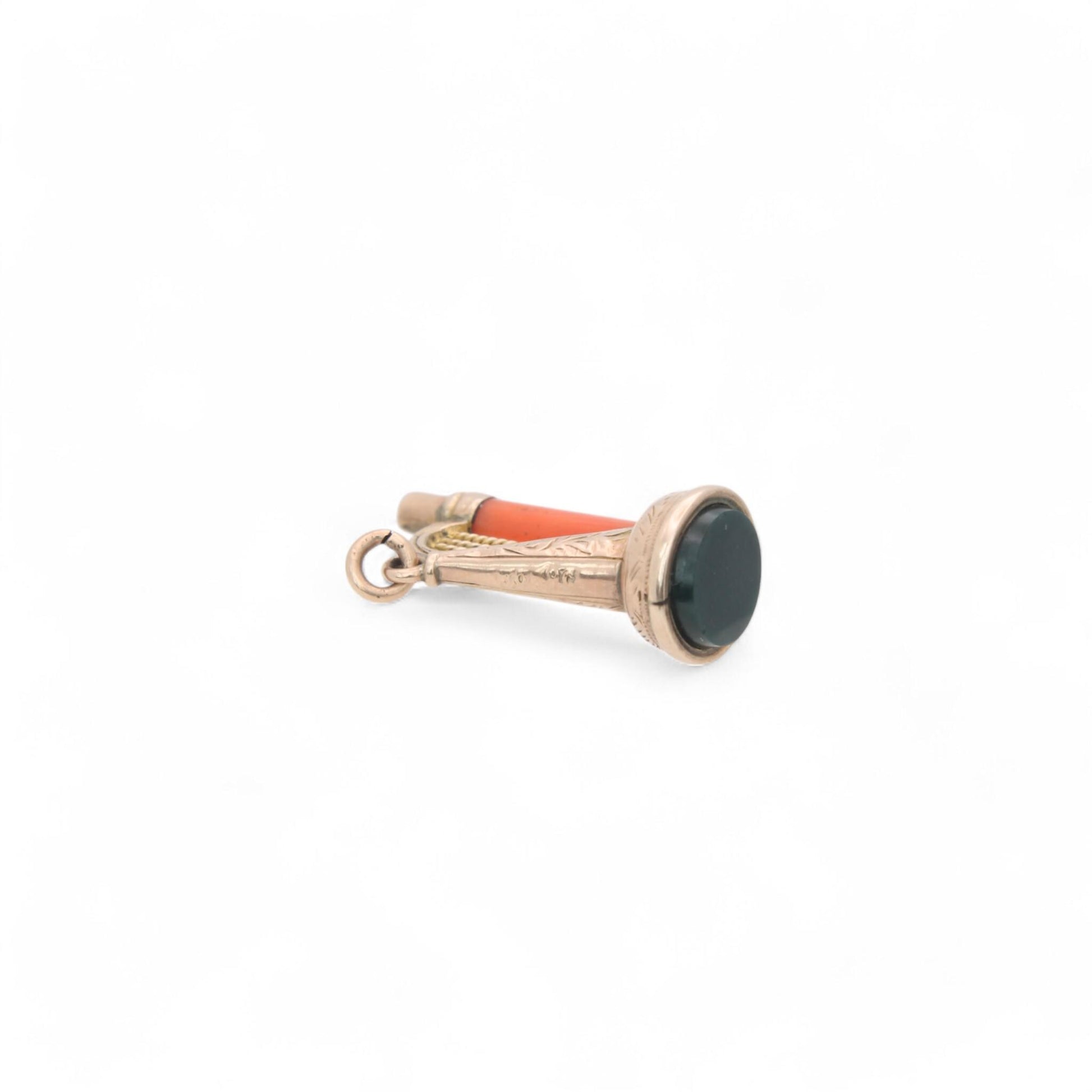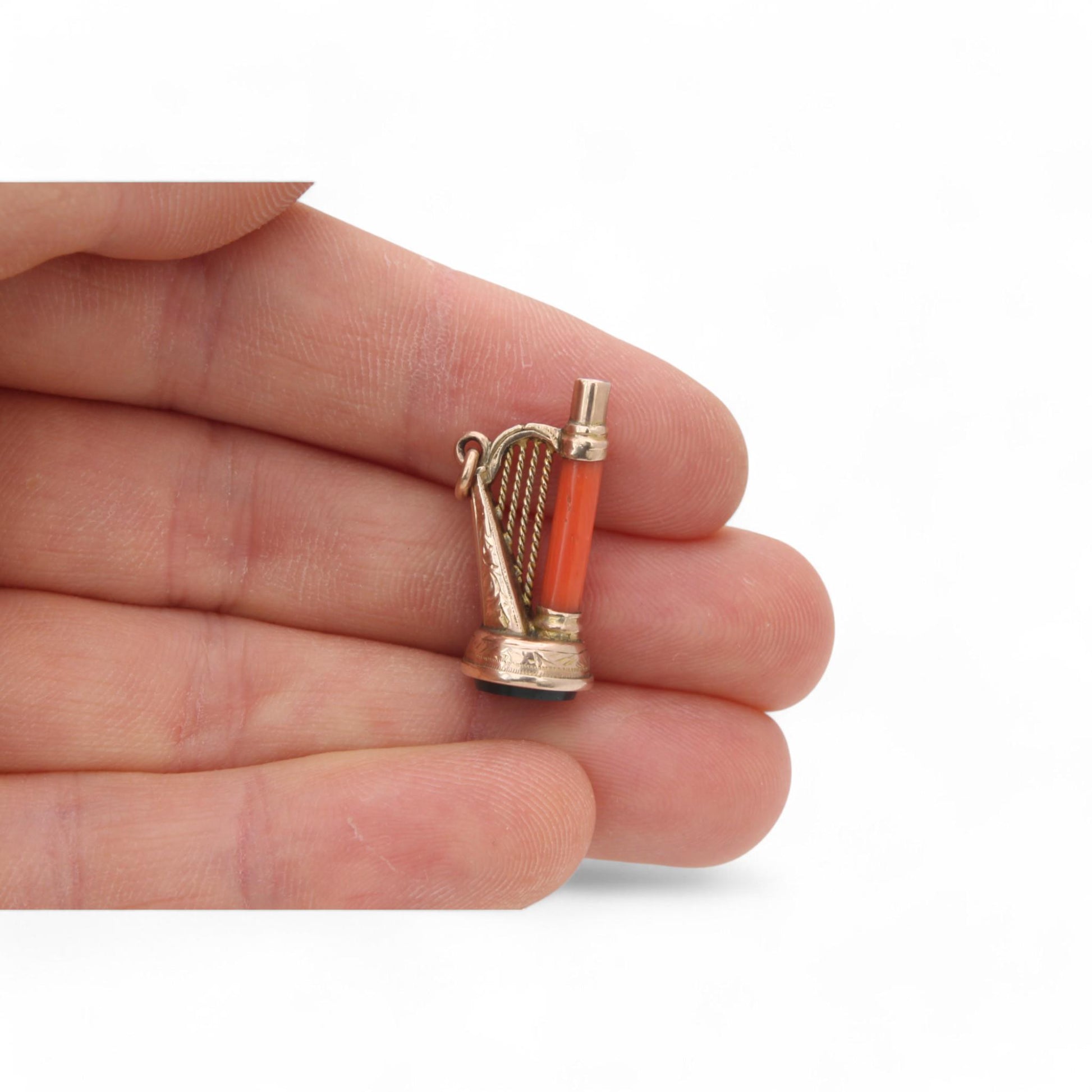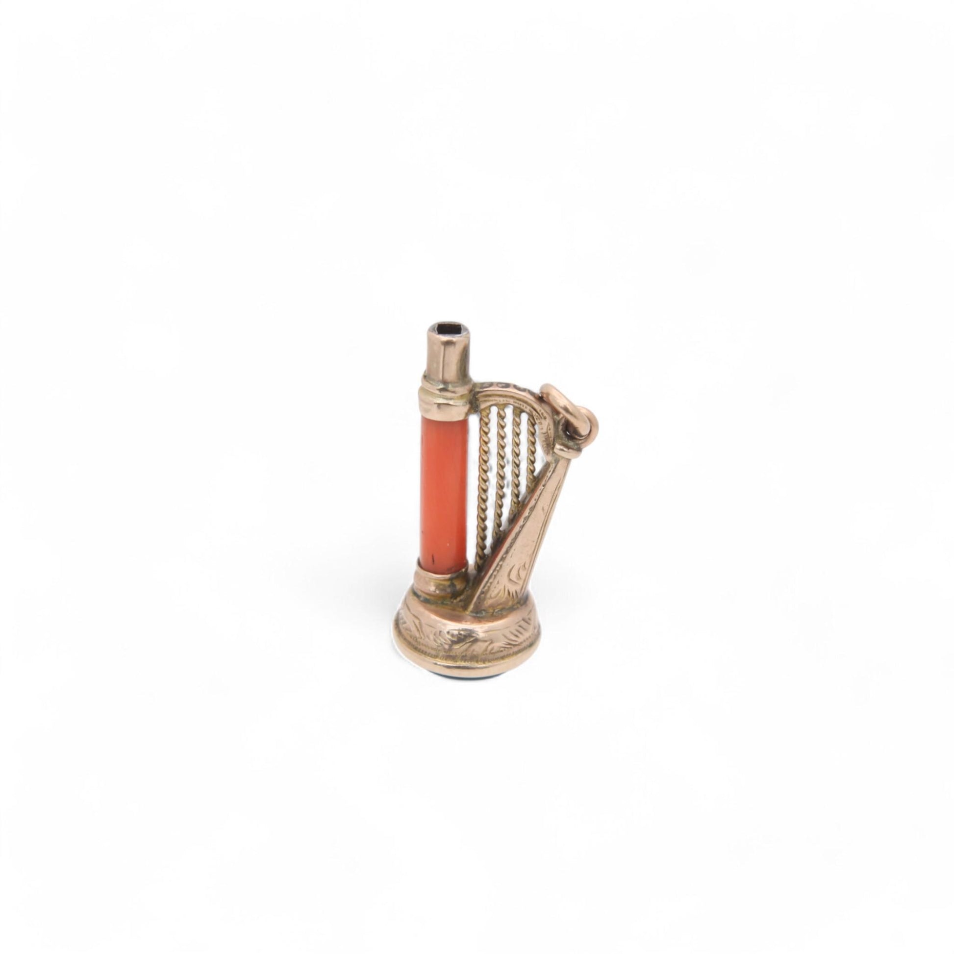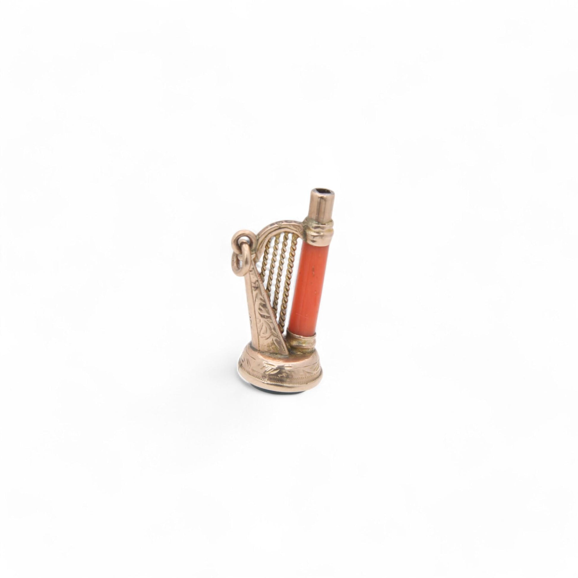 This enchanting antique 9ct gold charm is beautifully crafted in the shape of a harp, exuding timeless elegance. A delicate coral tube forms part of the harp’s structure, adding a warm and organic touch to the design. The base features a rich bloodstone agate, its deep green hue flecked with red offering a striking contrast against the warm gold tones.