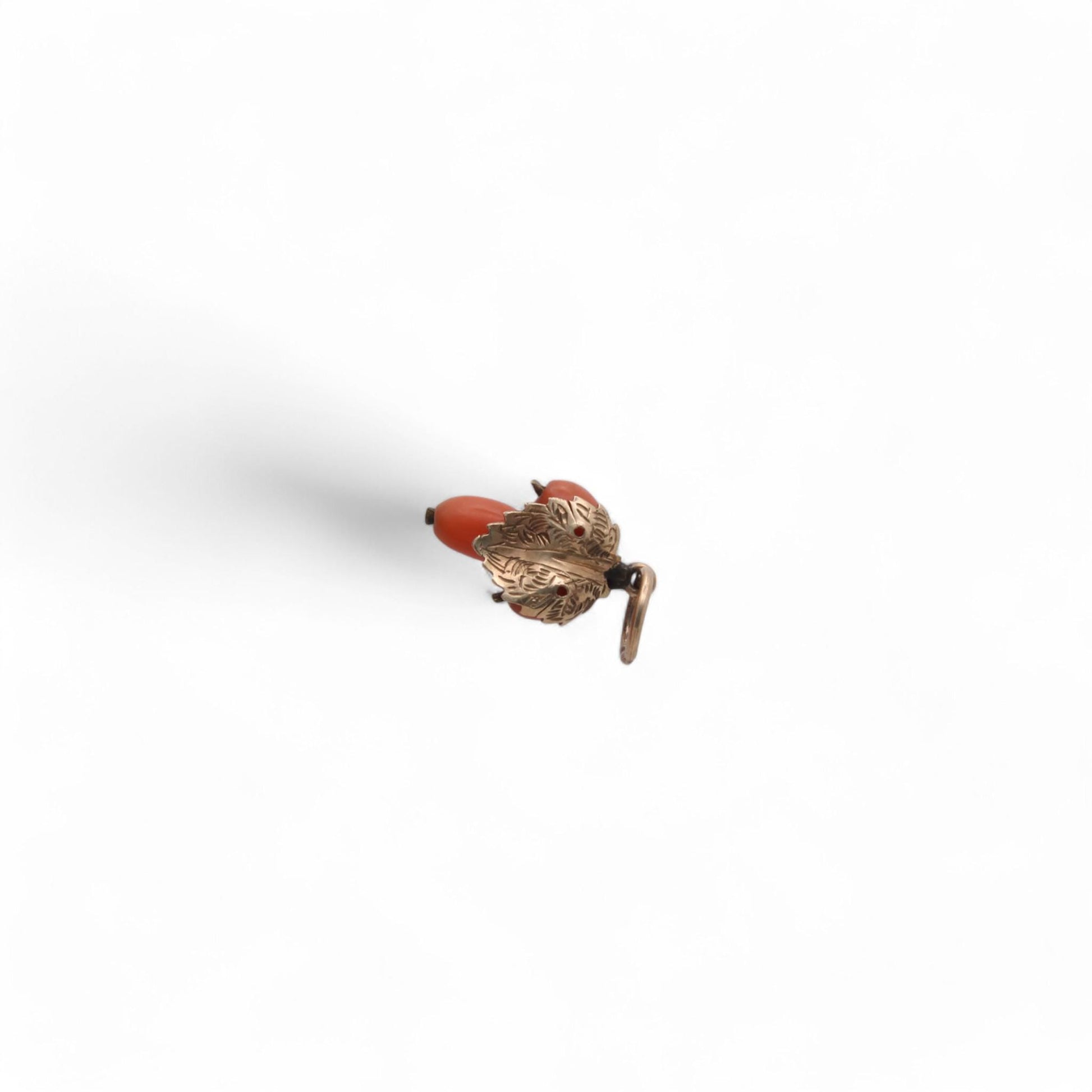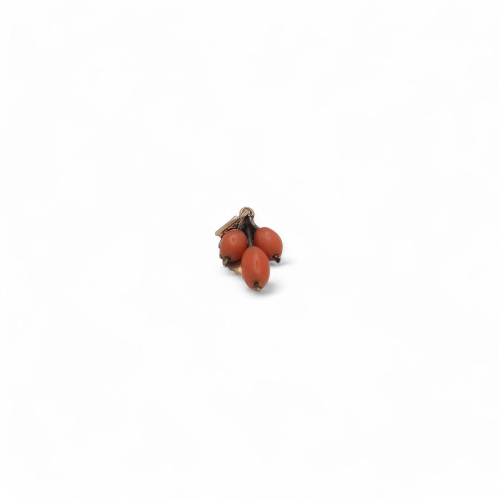 A charming antique 9ct gold charm crafted in the shape of a grape bunch, dating to circa 1900. This delightful piece features detailed gold leaves and coral beads forming the grape clusters, creating a striking and naturalistic contrast of colour and texture. Beautifully made with fine attention to detail, it’s a wonderful example of turn-of-the-century craftsmanship. Perfect as a pendant, charm or addition to a collector's bracelet.