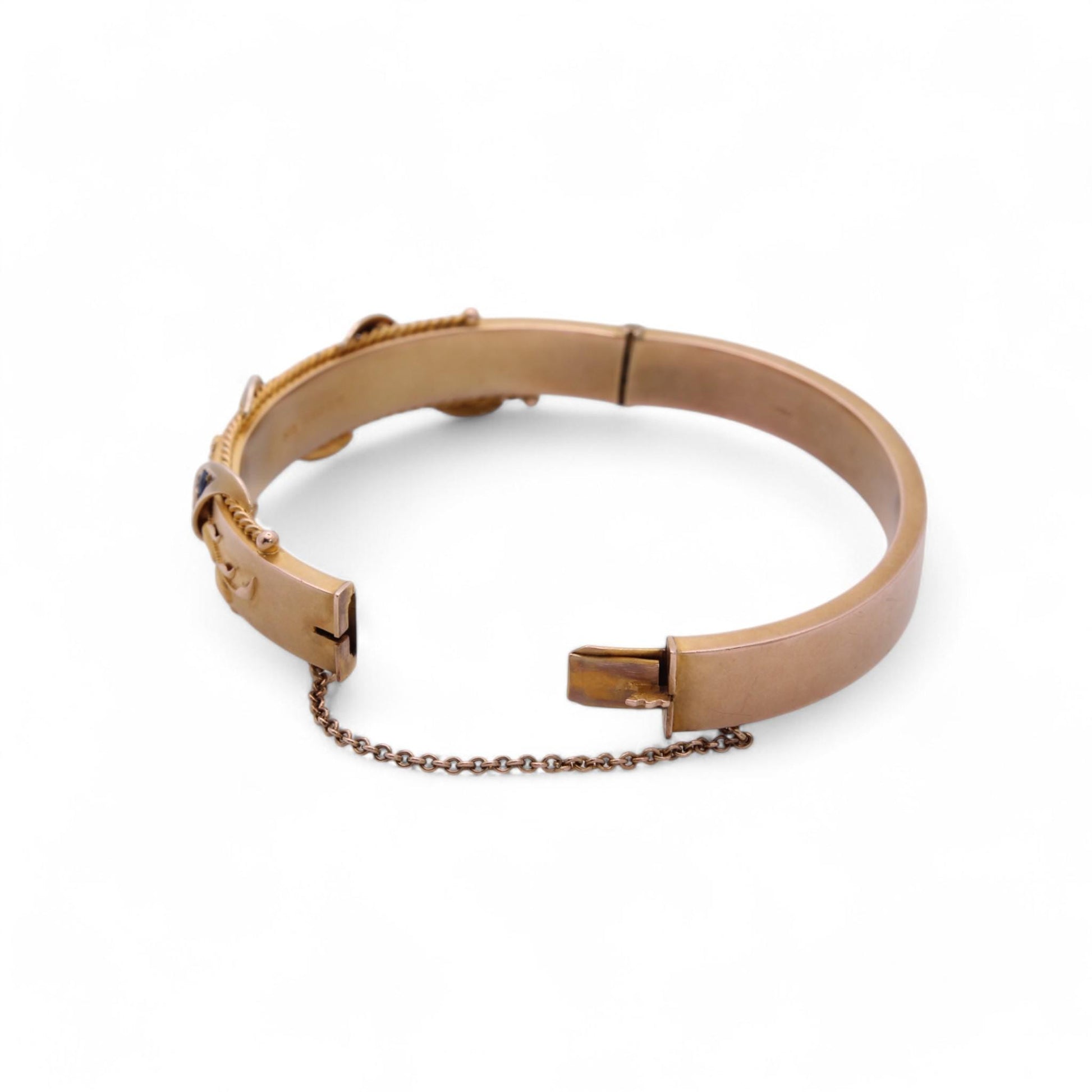 The bangle features a strong clasp and is equipped with a safety chain, ensuring both security and ease of wear.
