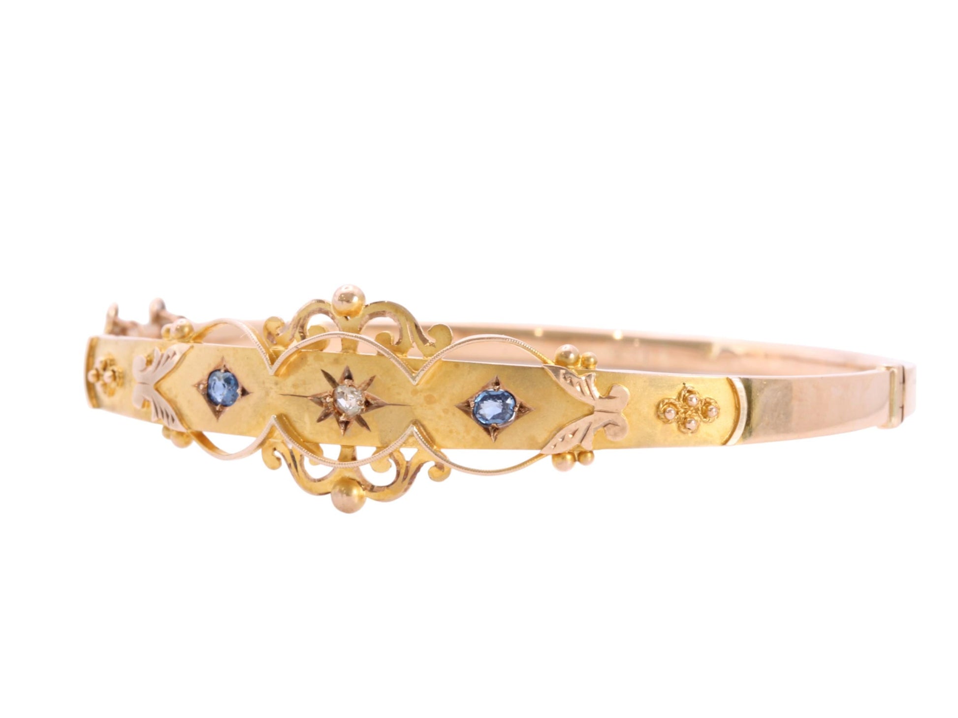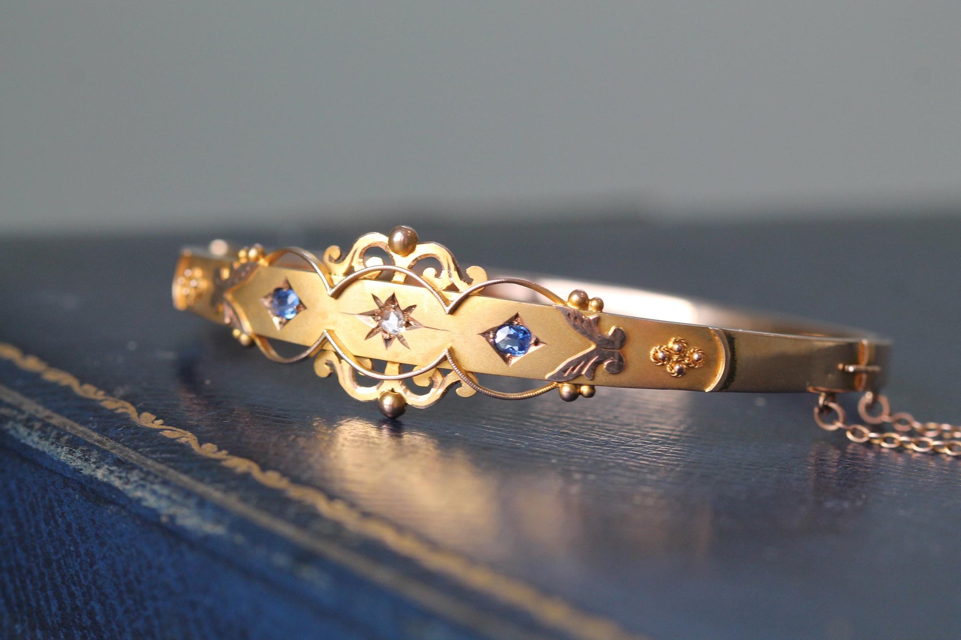 A stunning antique 9ct yellow gold bangle set with two vibrant old-cut sapphires and a central old-cut diamond, all arranged in a classic star-set design. The craftsmanship is exceptional throughout, with elegant pierced detailing and graceful scrollwork that perfectly frames the gemstones.