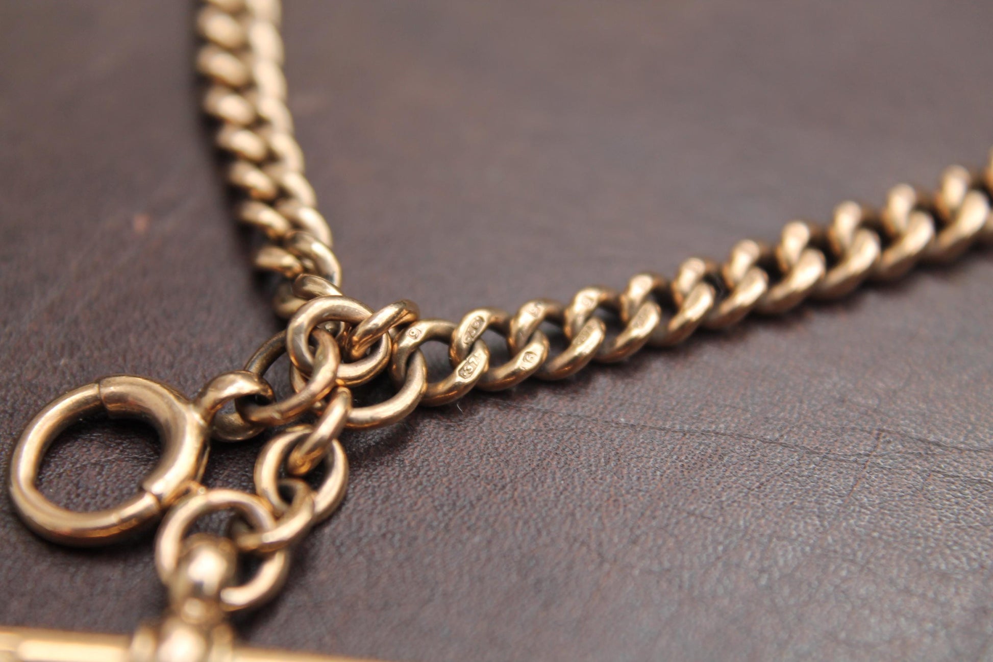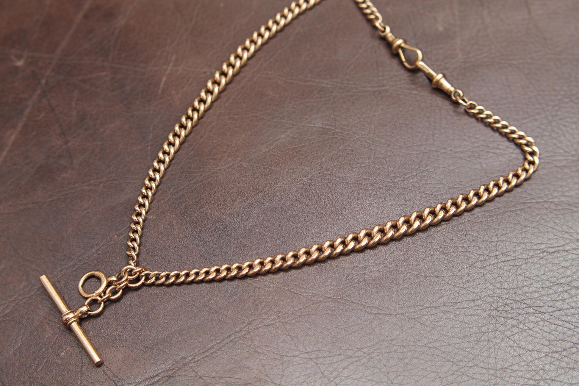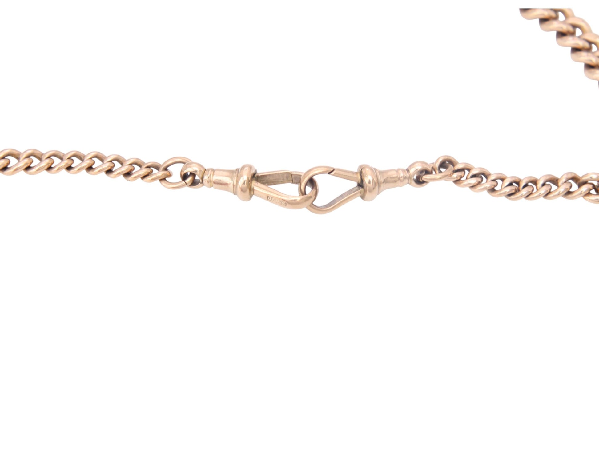 An antique 9ct rose gold double Albert chain, dating to 1914. The solid gold links graduate in size, giving the chain a bold yet refined look. At each end are sturdy, fully functioning dog clips, while the centre features a T-bar suspended from a larger jump ring alongside an additional bolt clasp — perfect for attaching a fob, pendant, or charm.