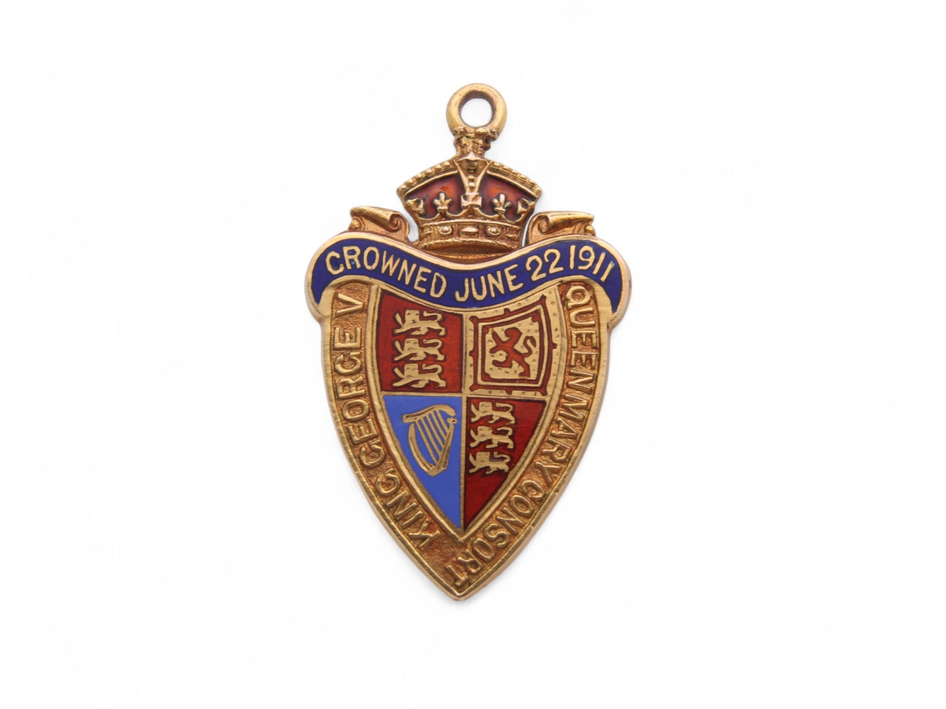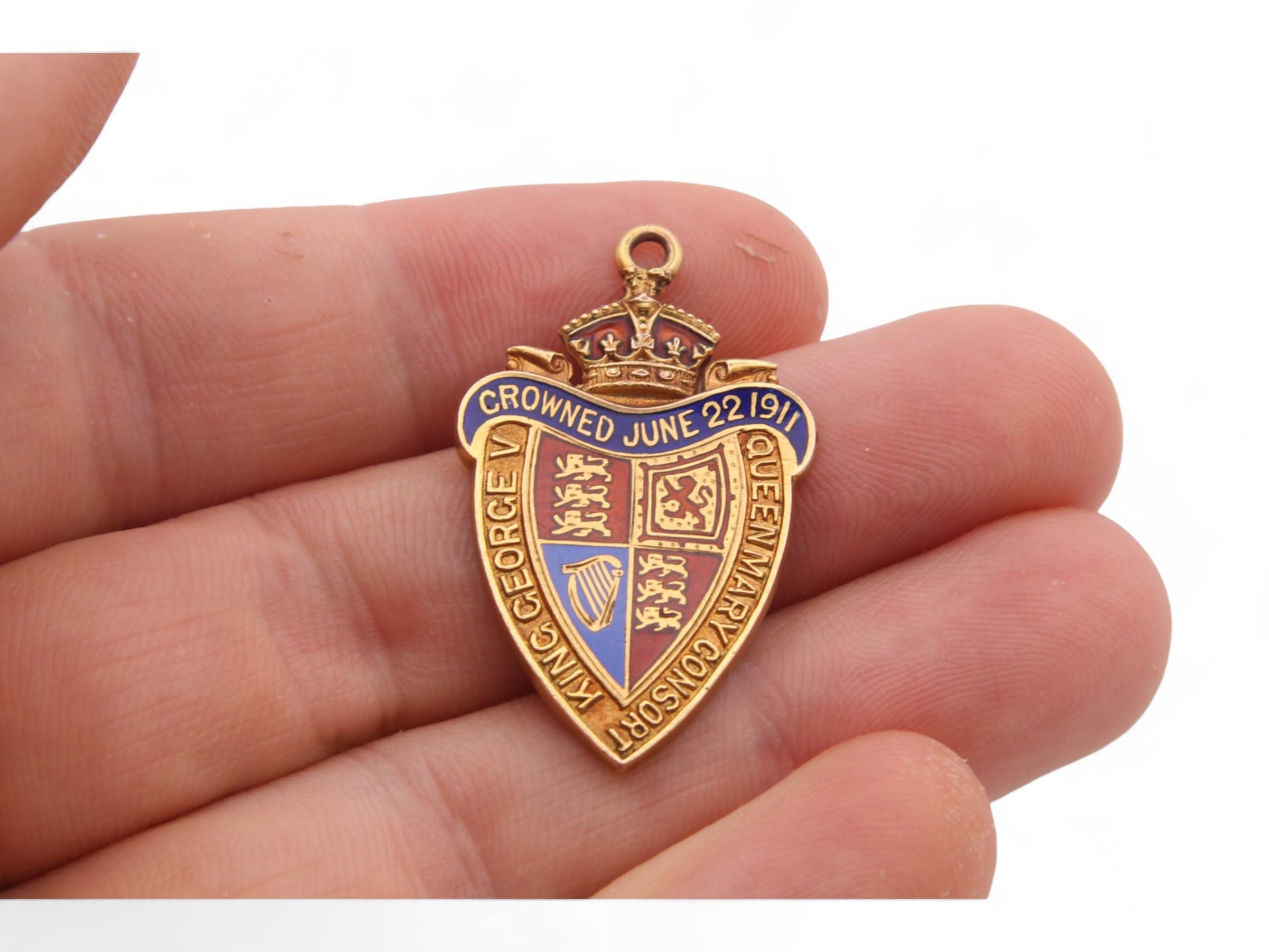 Celebrate a piece of royal history with this exquisite antique 9ct gold shield-shaped pendant, adorned with vibrant red and blue enamel work. Topped with a regal crown motif, this pendant commemorates the coronation of King George V and Queen Mary on June 22, 1911. The front displays the text, “CROWNED JUNE 22 1911," "KING GEORGE V," and "QUEEN MARY CONSORT," making it a meaningful collector's piece. This charming pendant carries not only beauty but a profound connection to a pivotal moment in British history—perfect for those who appreciate elegance and legacy.