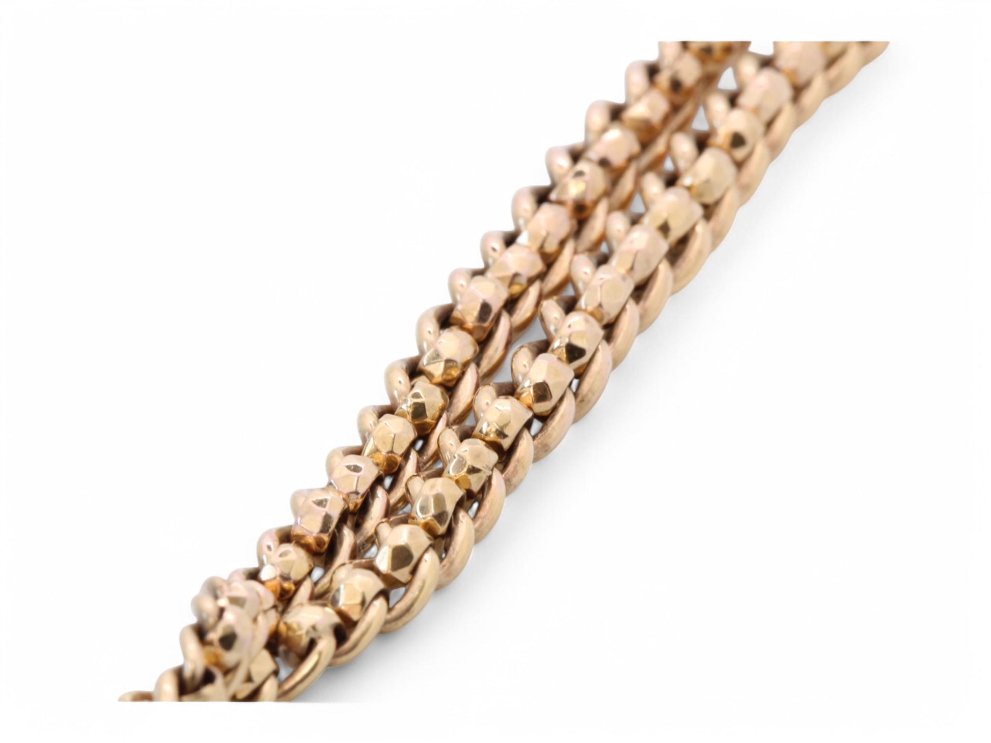 An exceptional antique 9ct yellow gold double Albert chain dating to c.1890. This beautiful piece features a unique graduating faceted roller ball link—uncommon and eye-catching.