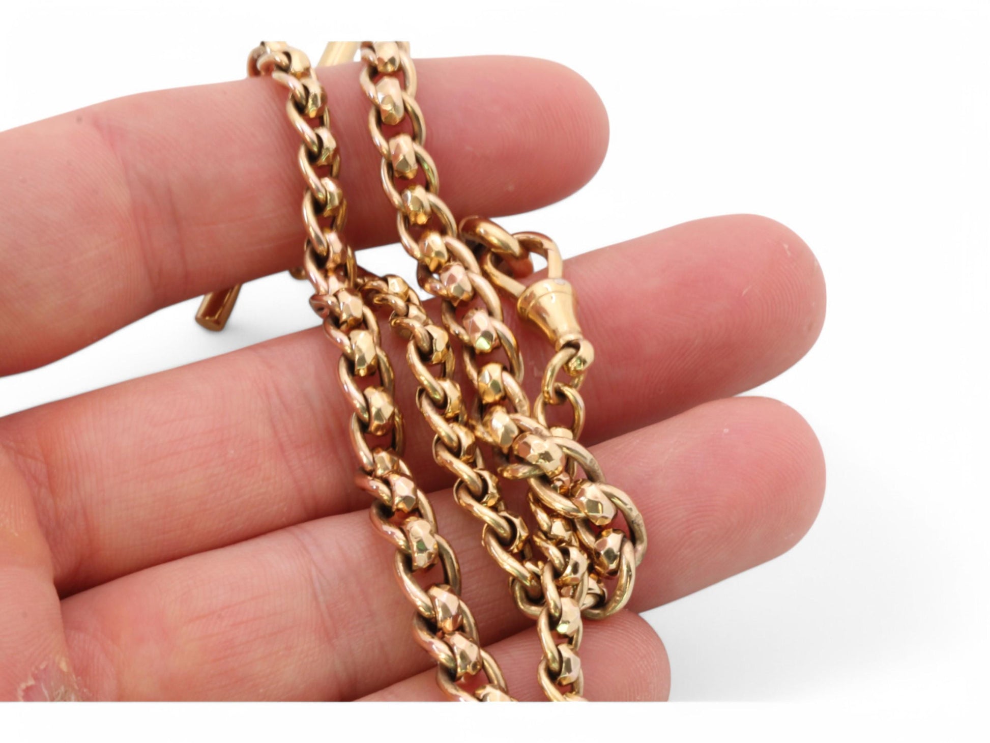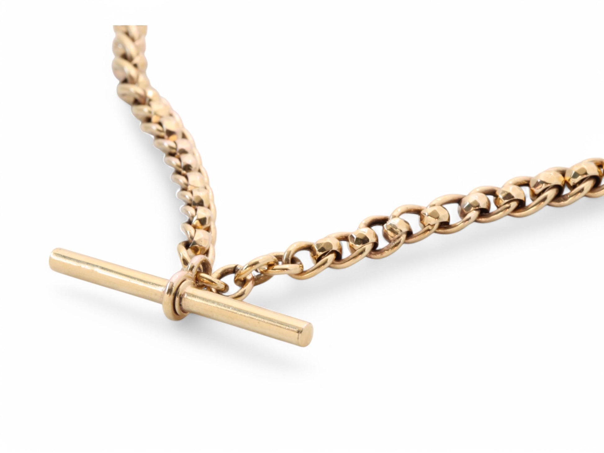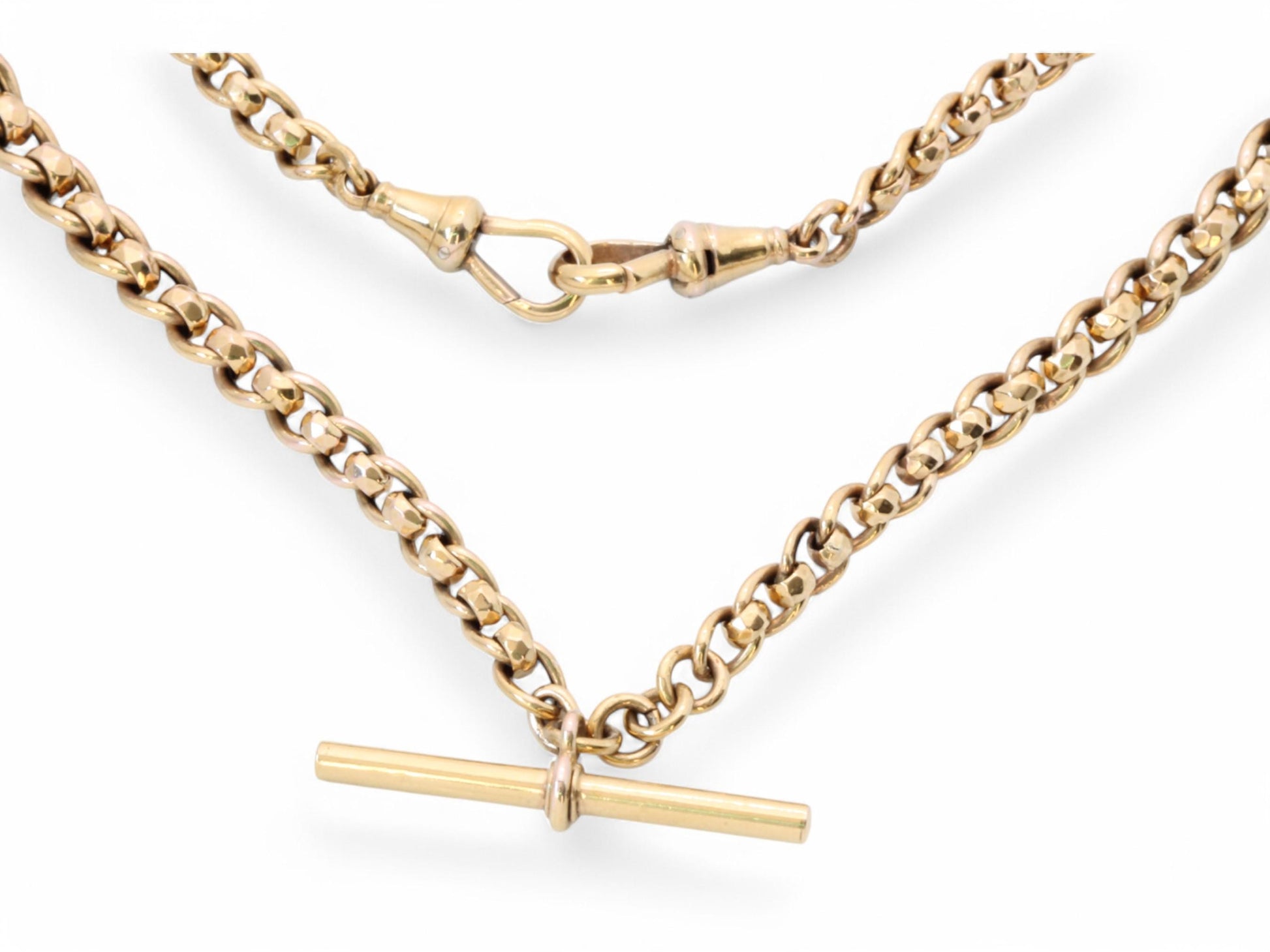 Crafted in rich yellow gold, the chain is substantial and well-made, fitted with its original dog clips and T-bar. Though originally intended as a watch chain, its elegant design and versatile length make it perfect to wear as a necklace today.