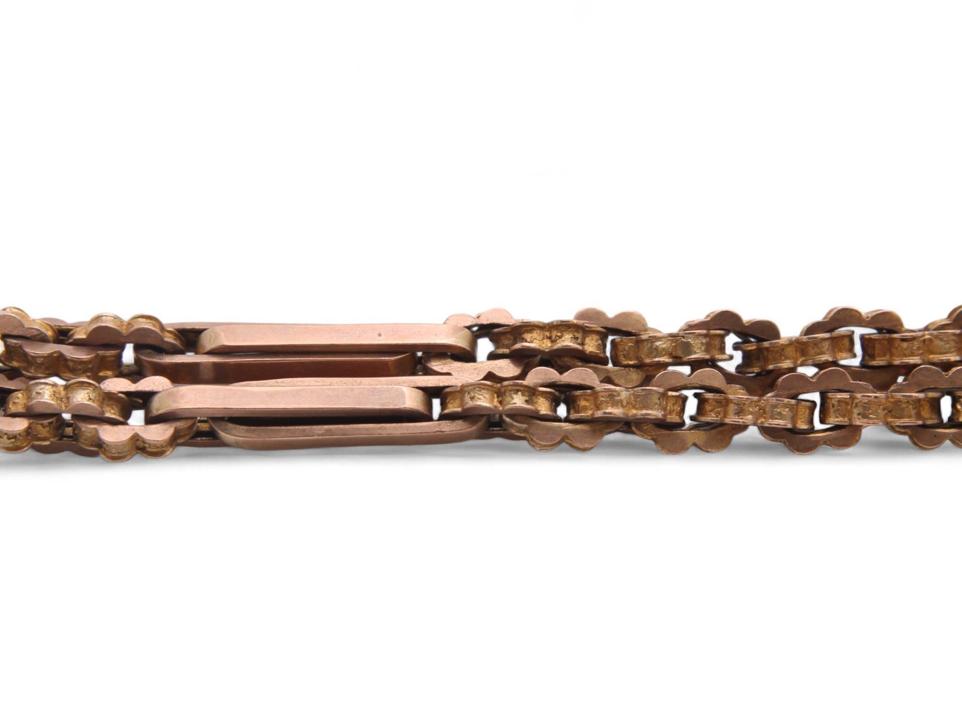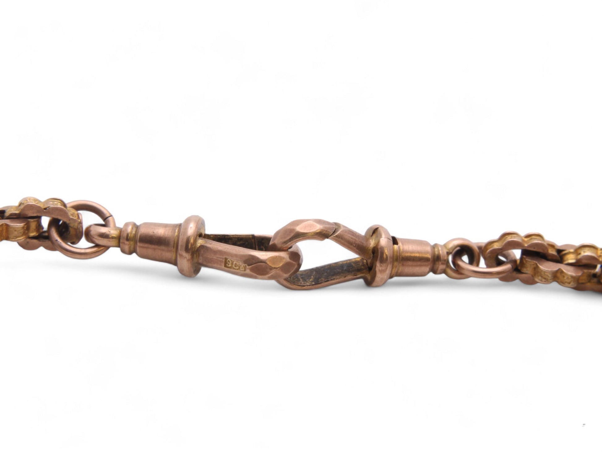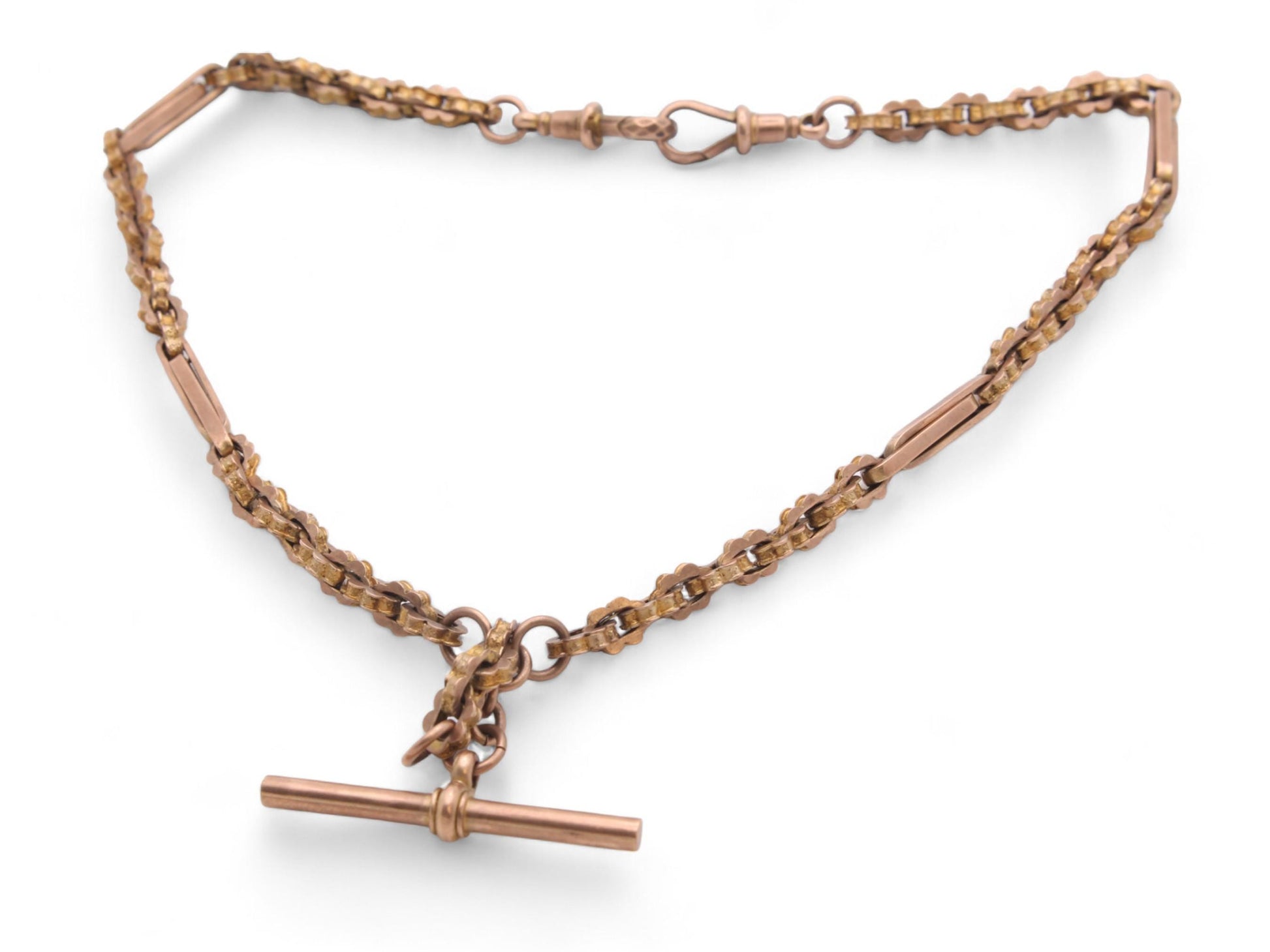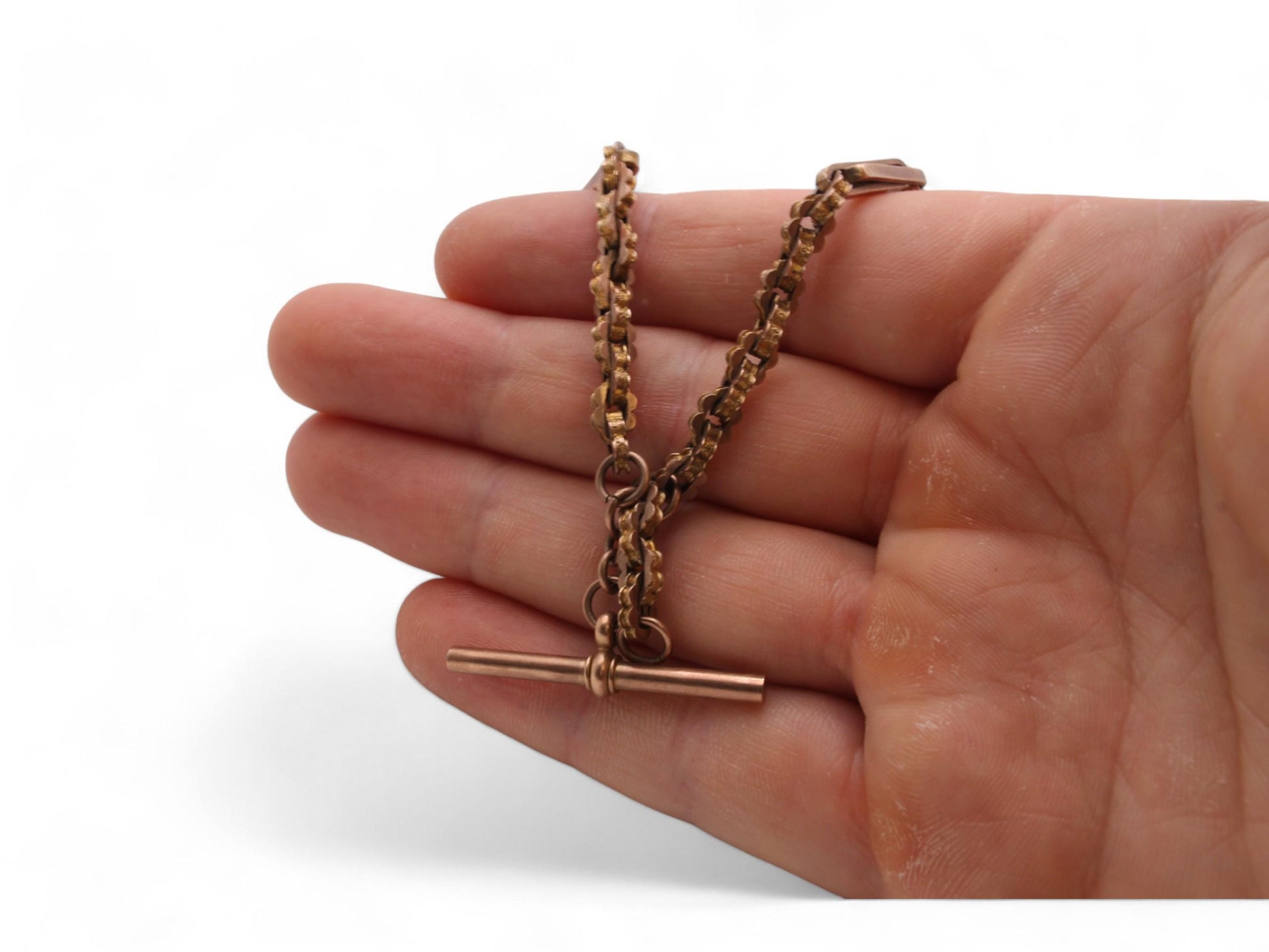 A delightful antique 9ct rose gold double albert chain with divine detailing throughout.