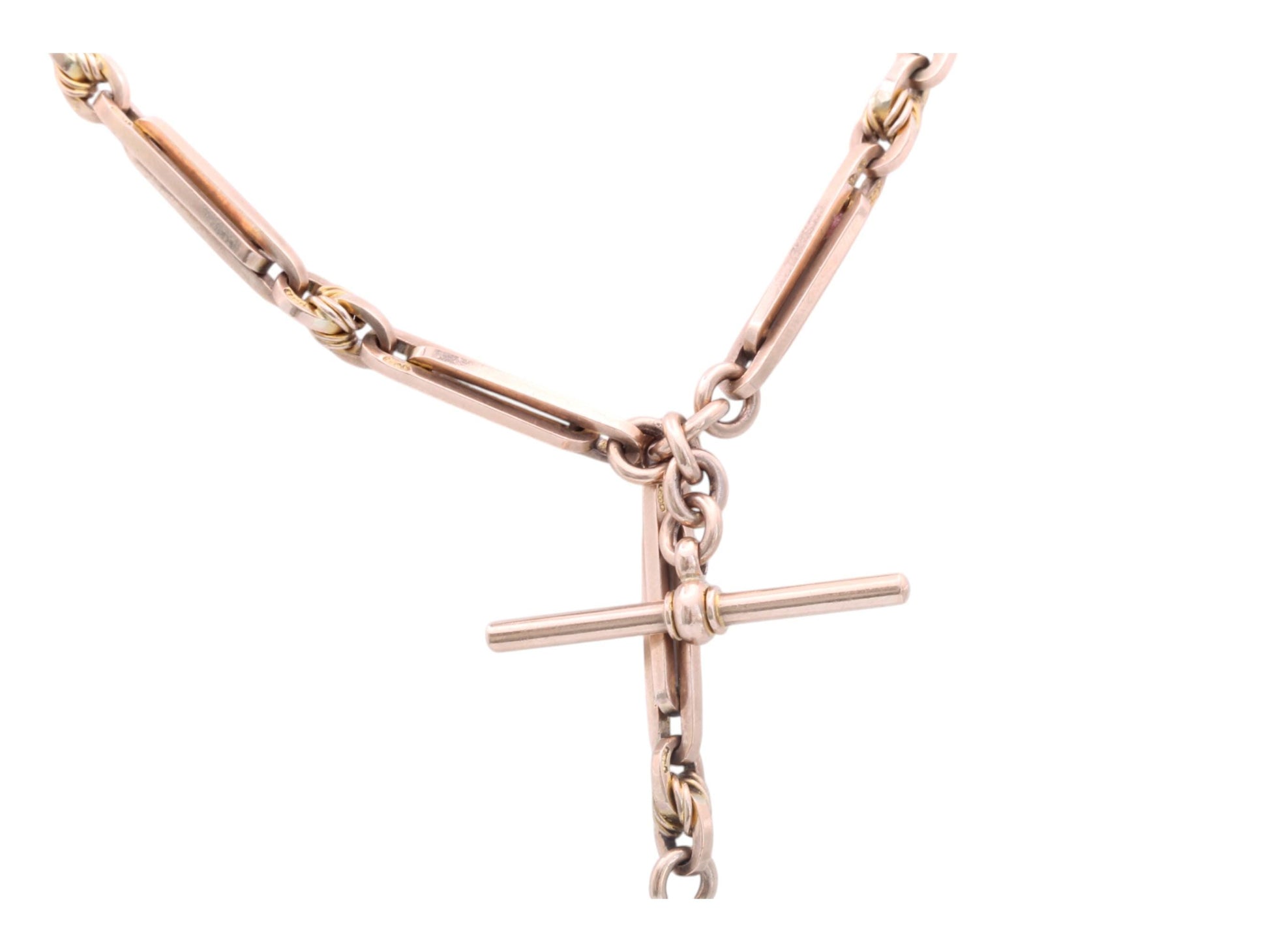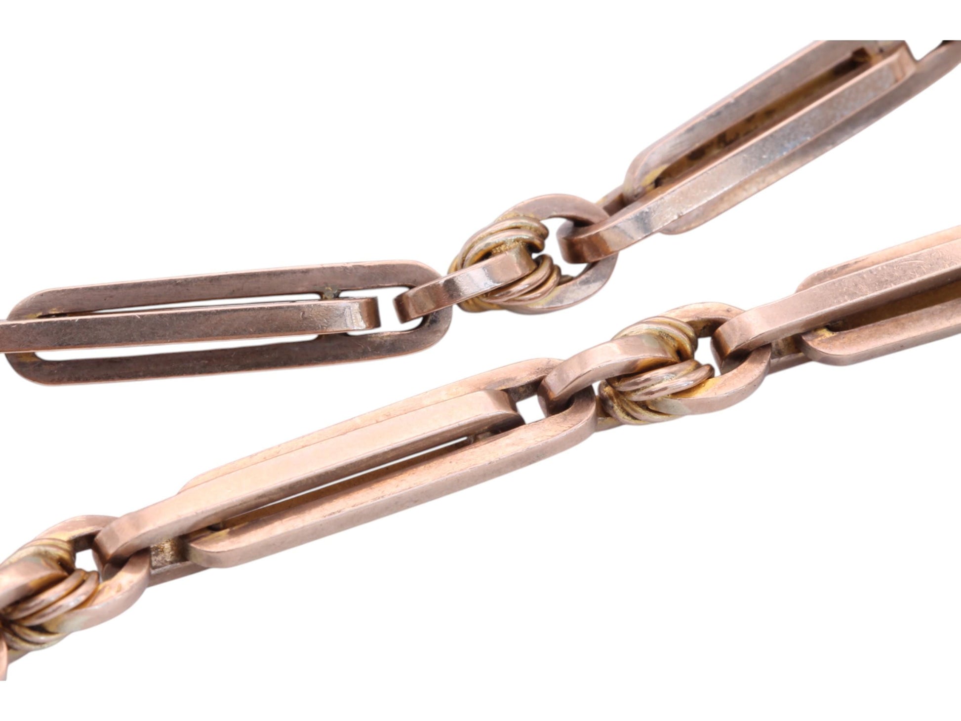 An exceptional antique 9ct rose gold double Albert chain dating to 1913. This impressive piece features alternating fetter and lover’s knot links—symbolic of eternal love and unity—making it both a functional and sentimental treasure. With a substantial weight and minimal wear to any of the links, it remains in outstanding condition for its age.