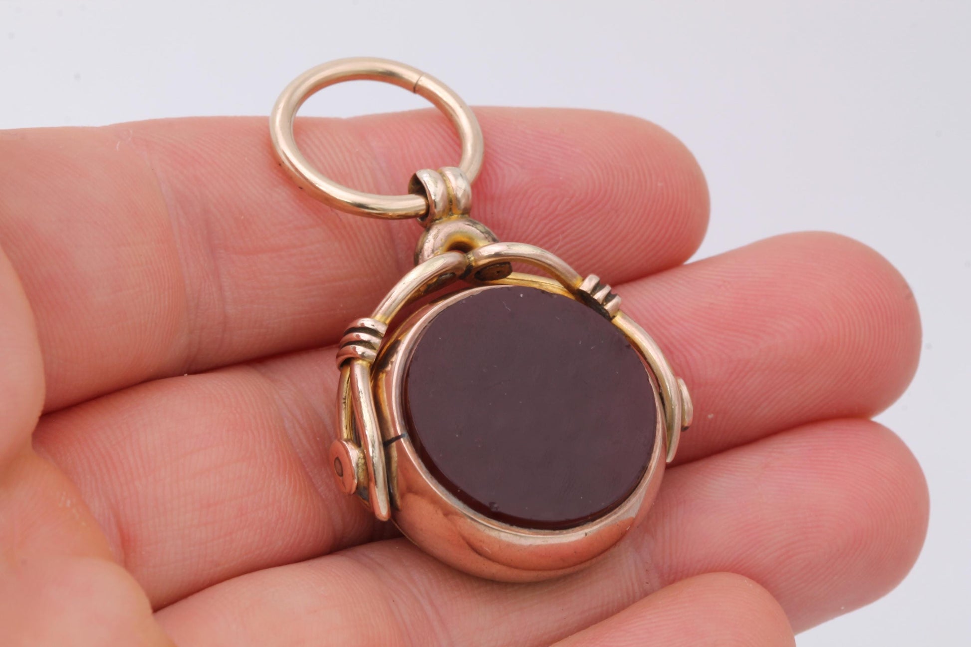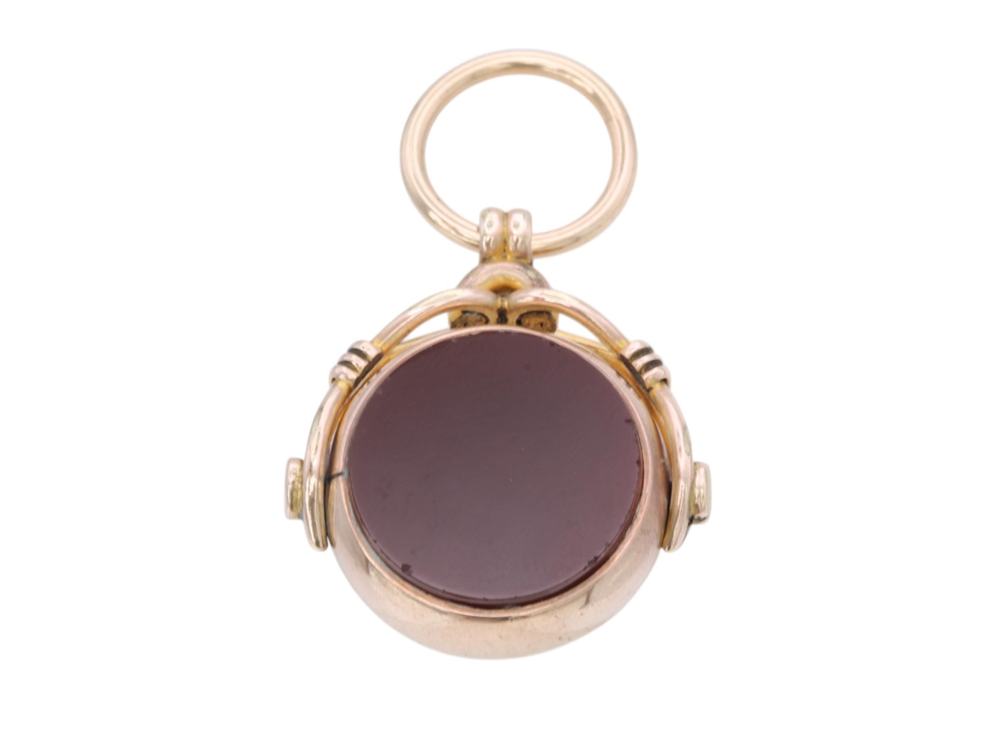A fascinating late Victorian novelty spinner pendant, crafted in 9ct gold, dating to c.1890. The piece features a clear glass front enclosing three miniature gambling dice that can be shaken and moved inside; a playful and unusual feature. The reverse is set with a deep carnelian agate, showing just a couple of tiny nibbles to the edge. The main body spins and rotates freely, much like traditional watch fobs of the era. A rare and charming example of Victorian whimsy, perfect for collectors of antique curiosities or jewellery with a playful twist.