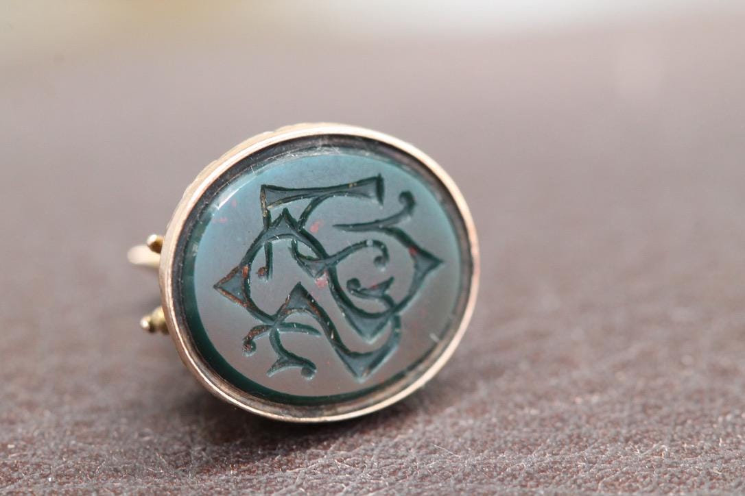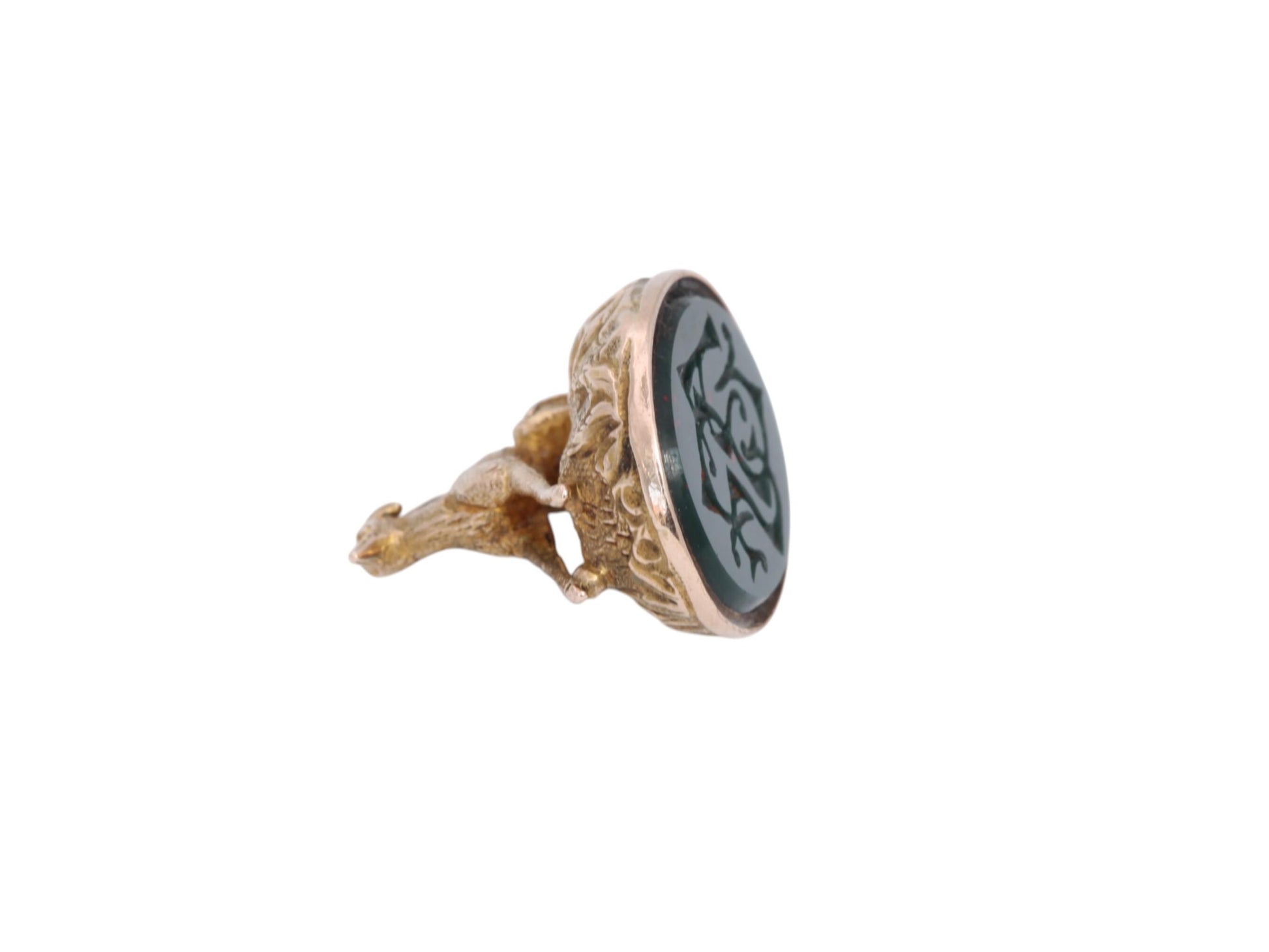 An exceptional antique 9ct gold pendant dating to the late Victorian era, featuring a finely modelled, playful greyhound poised atop an intricately chased mount. The base holds a rich bloodstone agate, expertly carved with an intaglio monogram reading "SNS." A rare and characterful piece showcasing both elegance and whimsy, steeped in the refined artistry of the period.