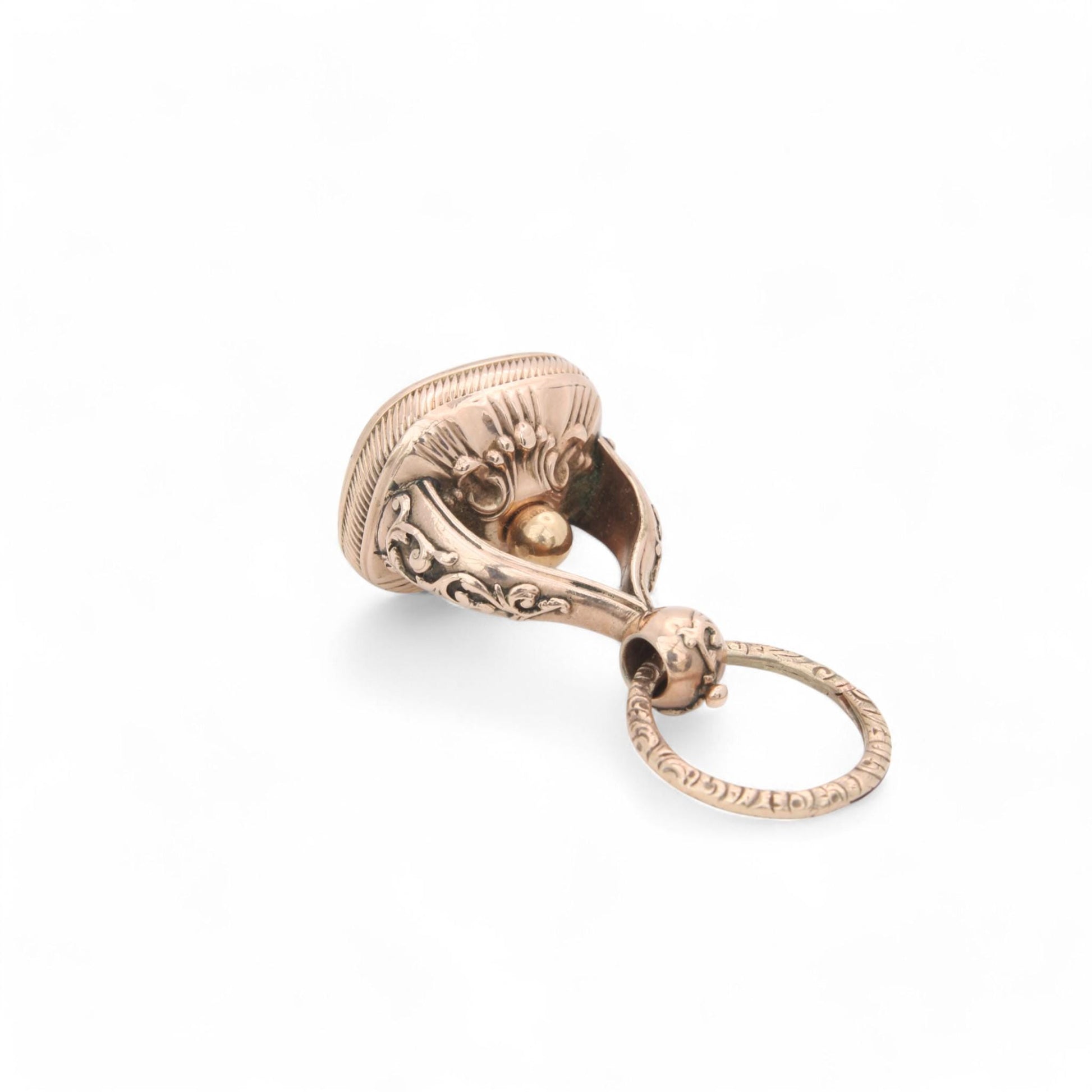 This exquisite antique 9ct rose gold seal is a fine example of detailed craftsmanship of the Victorian era. The surface is adorned with intricate floral work, adding a delicate touch to its design.