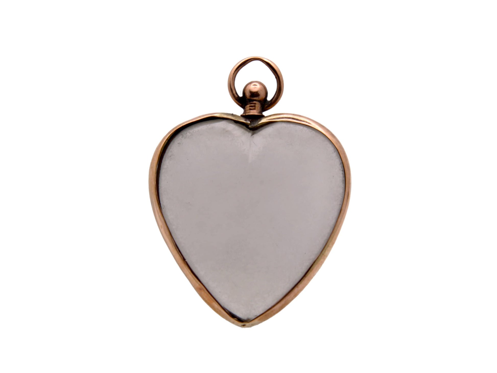 A delightful antique Edwardian 9ct rose gold open glass locket in the shape of a heart. The domed, frosted glass gives it a truly divine aesthetic.
