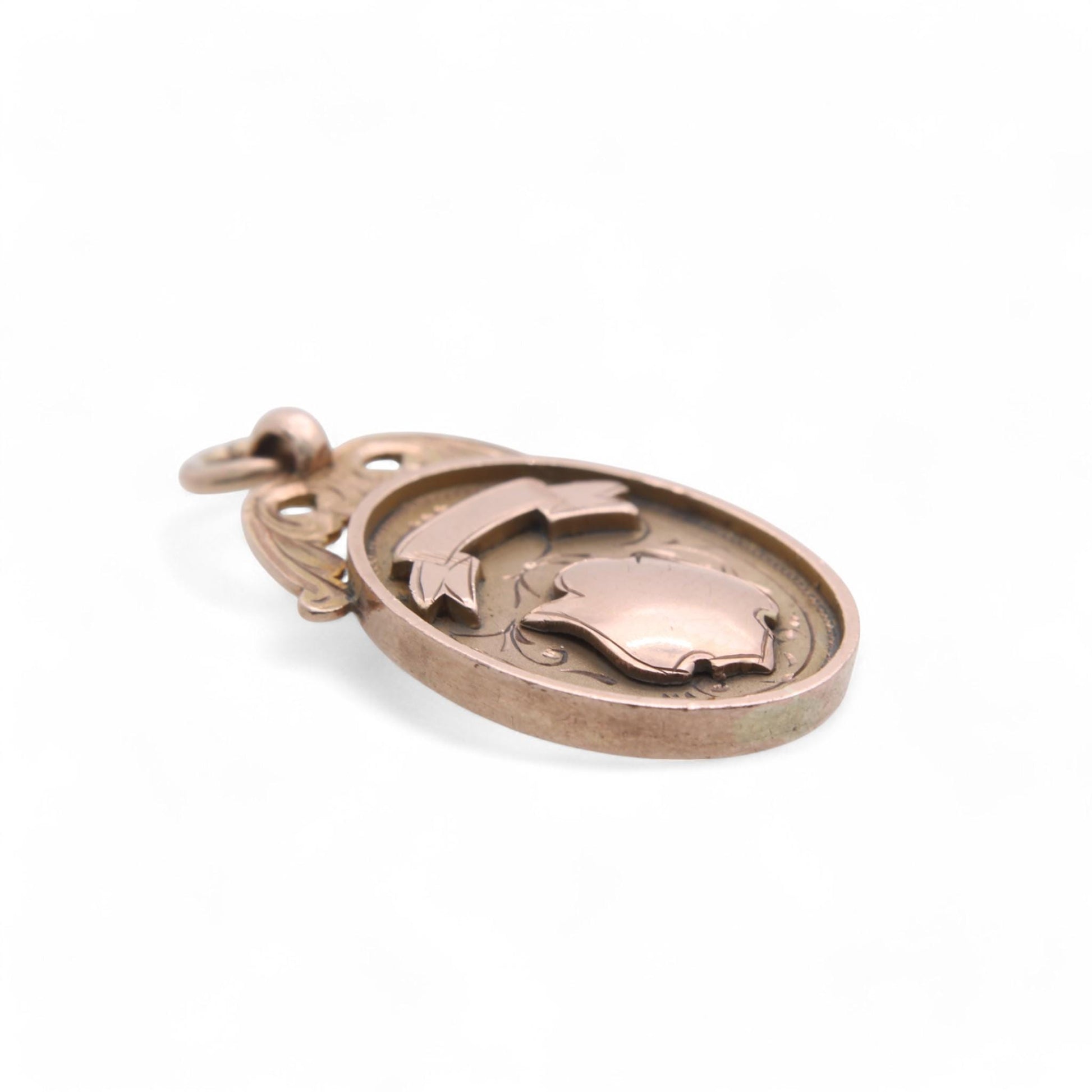 A fabulous antique 9ct rose gold pendant dating back to 1922. It has a wonderful scroll mount to the top and a blank ribbon cartouche as well as a shield.