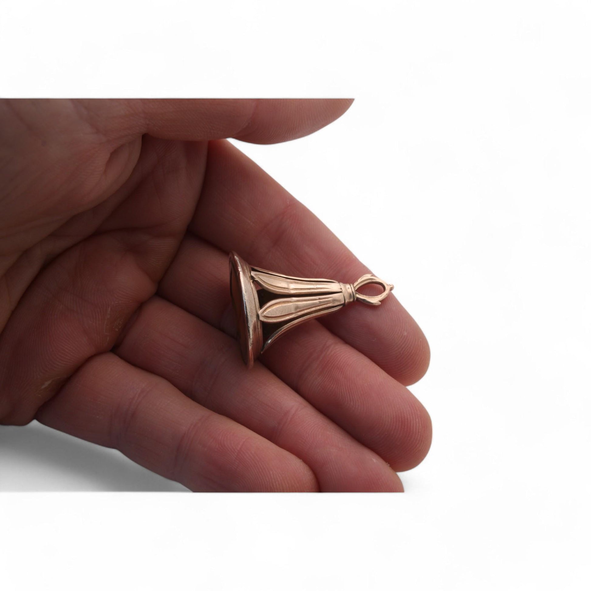 This antique 9ct gold pendant, dating to the Victorian era, c.1860 is an exquisite piece. At its base sits a beautifully carved carnelian intaglio, depicting a serpent holding a branch with leaves, a powerful symbol of wisdom and renewal. The rich, deep tones of the carnelian contrast beautifully with the warm 9ct gold mount, making it a striking and meaningful addition to any antique jewellery collection.