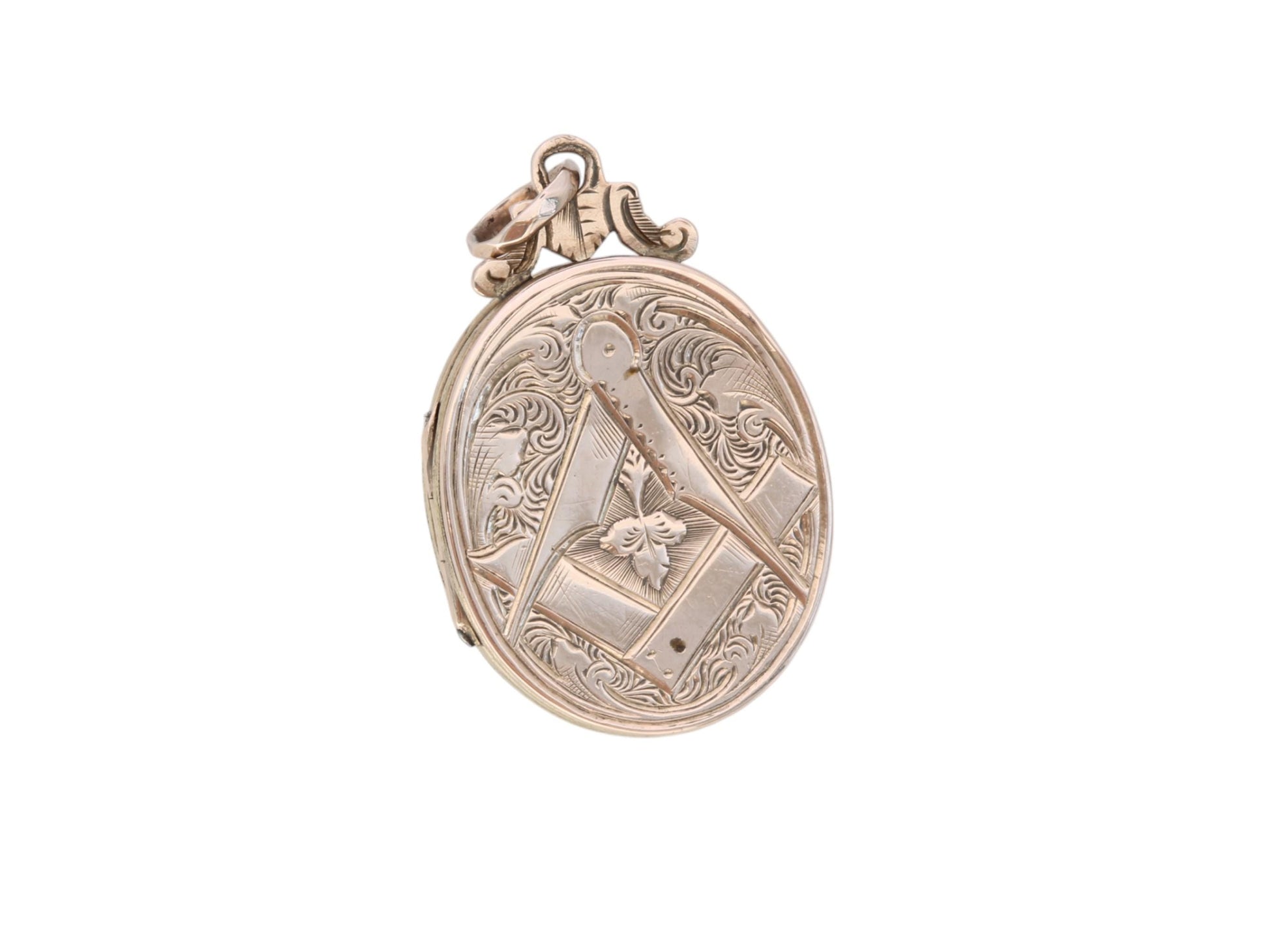 A distinctive antique 9ct gold locket dating to the late Victorian era, c.1900, featuring finely chased Masonic symbols to the front—rich with meaning and historic significance. The reverse is adorned with elegant floral engravings, showcasing the craftsmanship of the late Victorian era. Inside, the locket holds space for a cherished photo or keepsake, making it both personal and symbolic. A meaningful piece for collectors of Masonic memorabilia or antique gold jewellery.