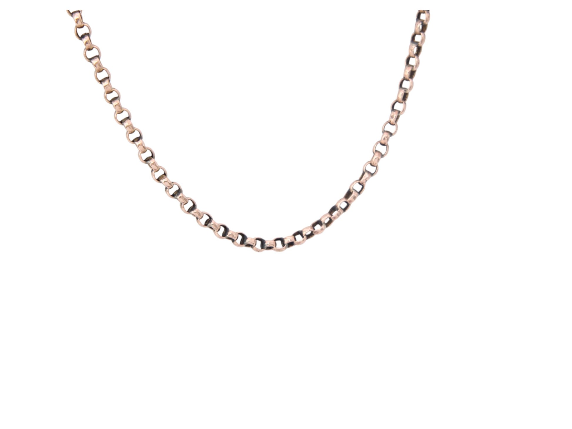 An antique Edwardian 9ct rose gold necklace, dating to c.1901. The chain is composed of classic belcher links interspersed with elegant interlocking fetter links, creating a stylish and distinctive design. The necklace retains its original barrel clasp, adding to its authenticity and charm.
