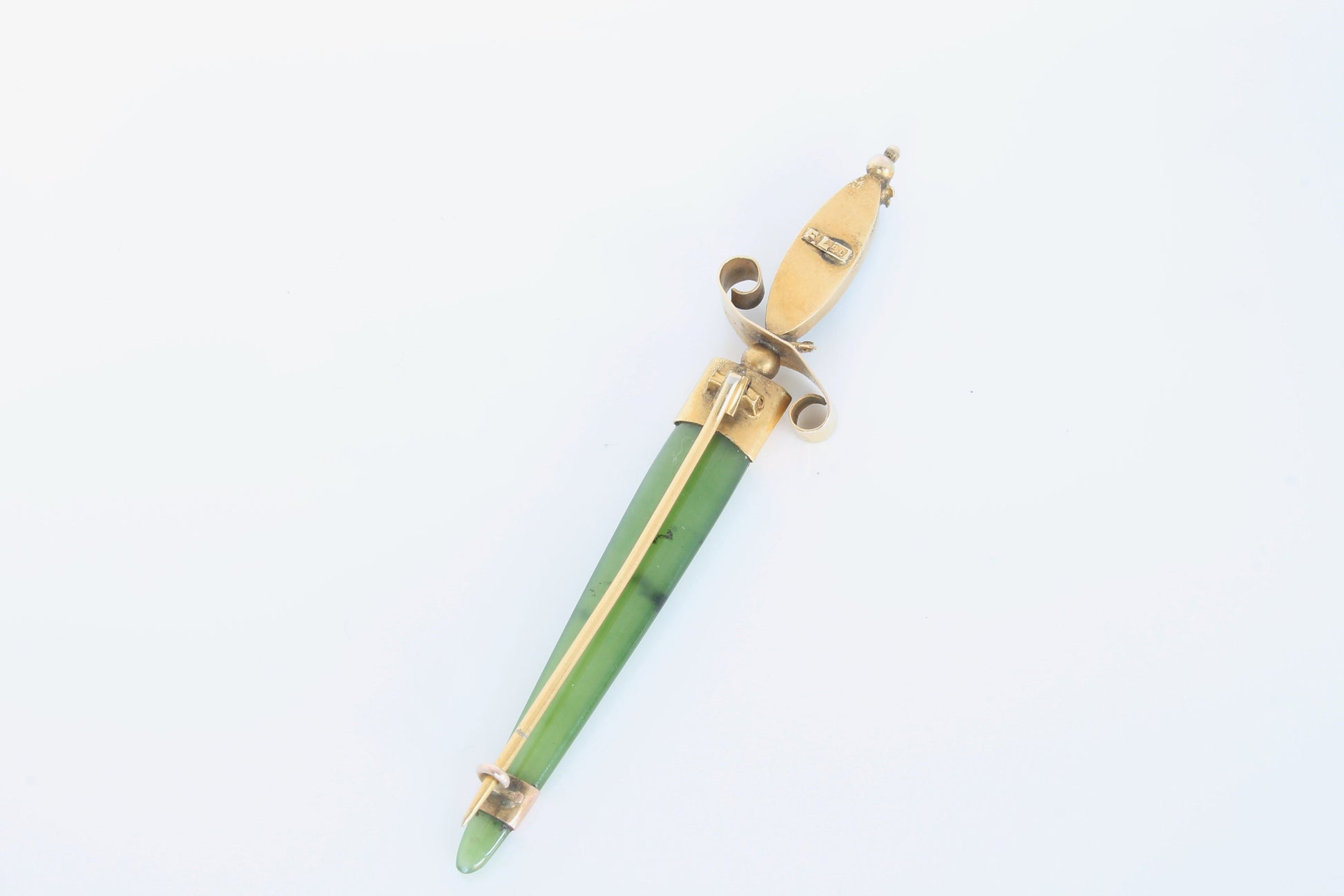 This lovely brooch is crafted in 9ct gold with polished nephrite, made in c.1900. An unusual piece with great detail throughout.