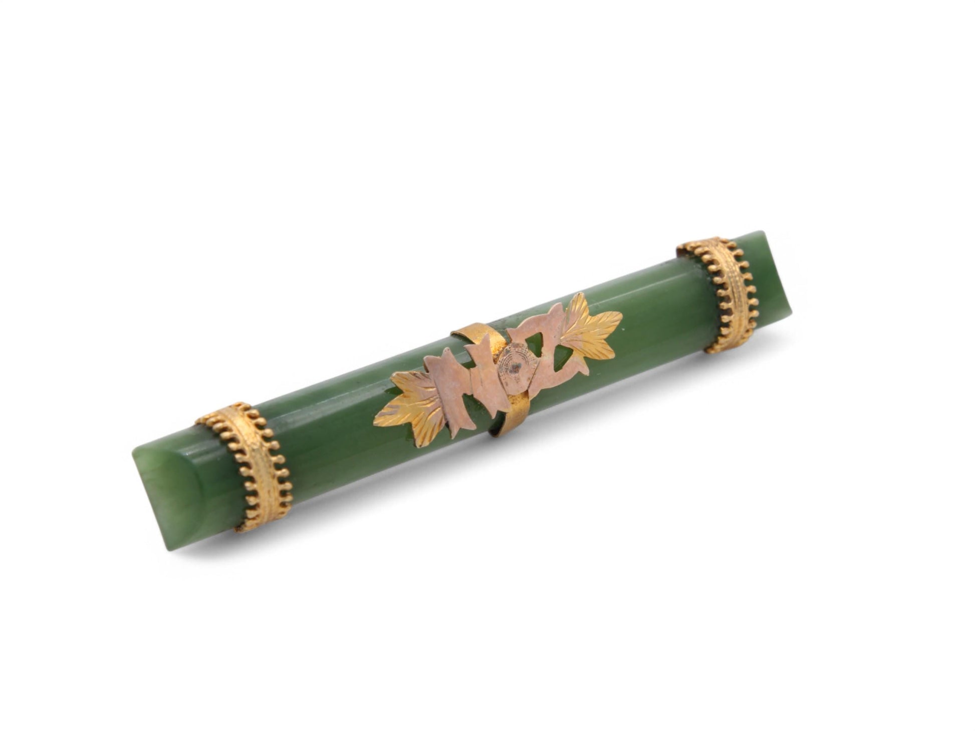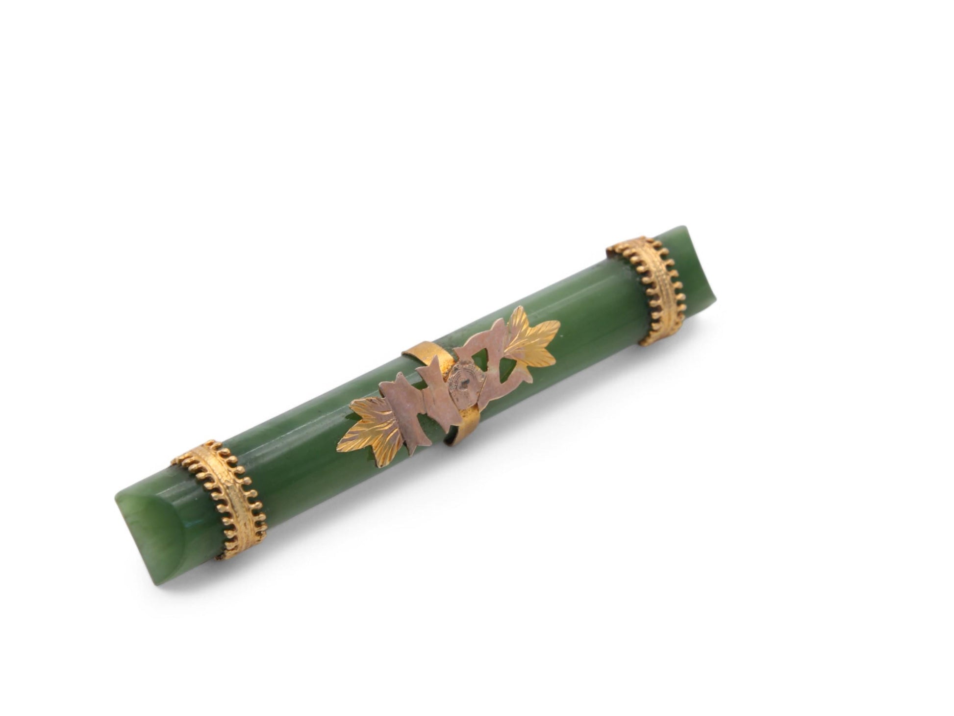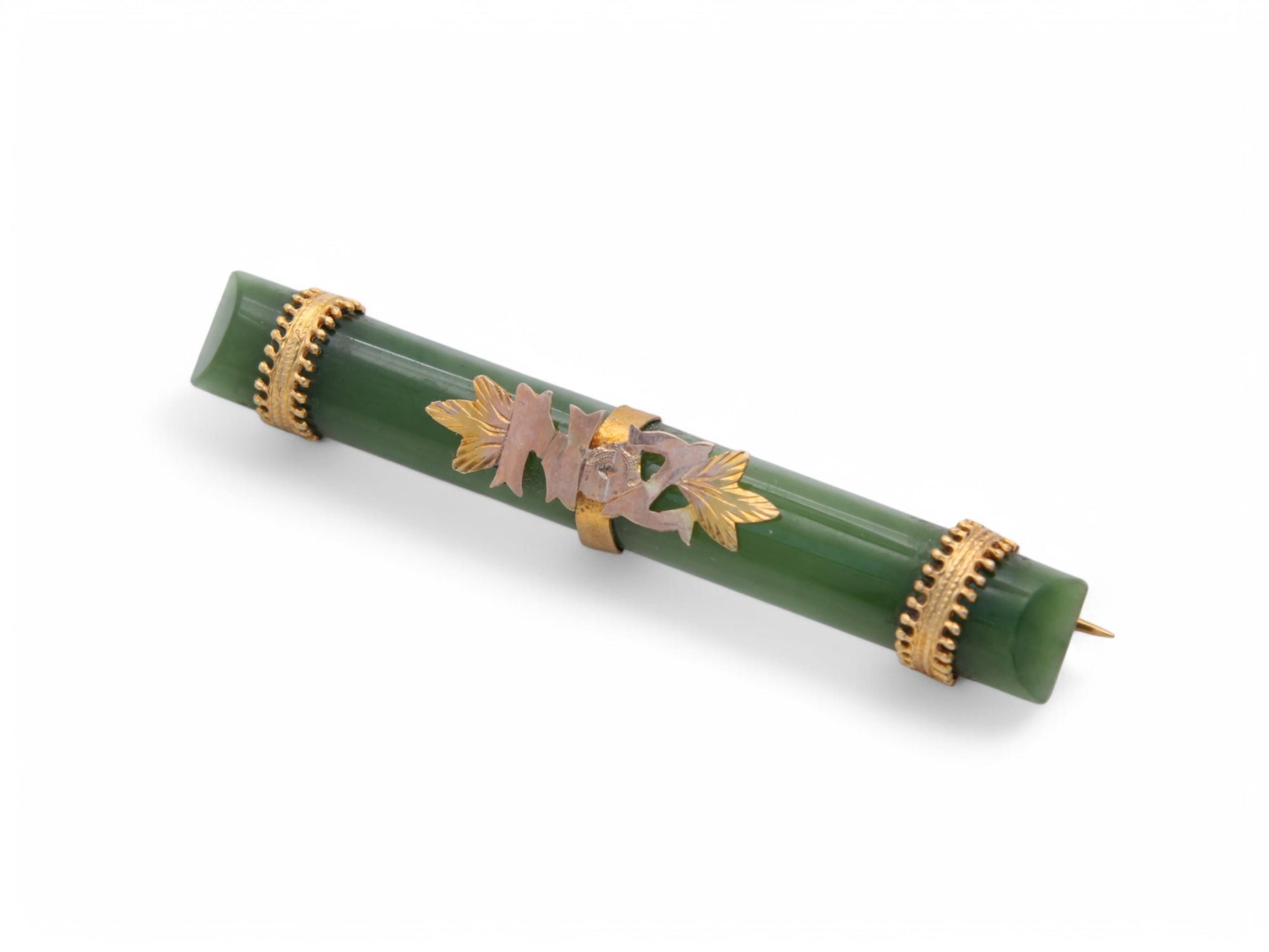 A fabulous antique 9ct gold New Zealand Nephrite brooch dating to the Victorian era, c.1890. This sweet little treasure boasts a beautiful piece of polished Nephrite stone carved into a bar brooch. The 9ct yellow gold mount adds a wonderful contrast in colour.