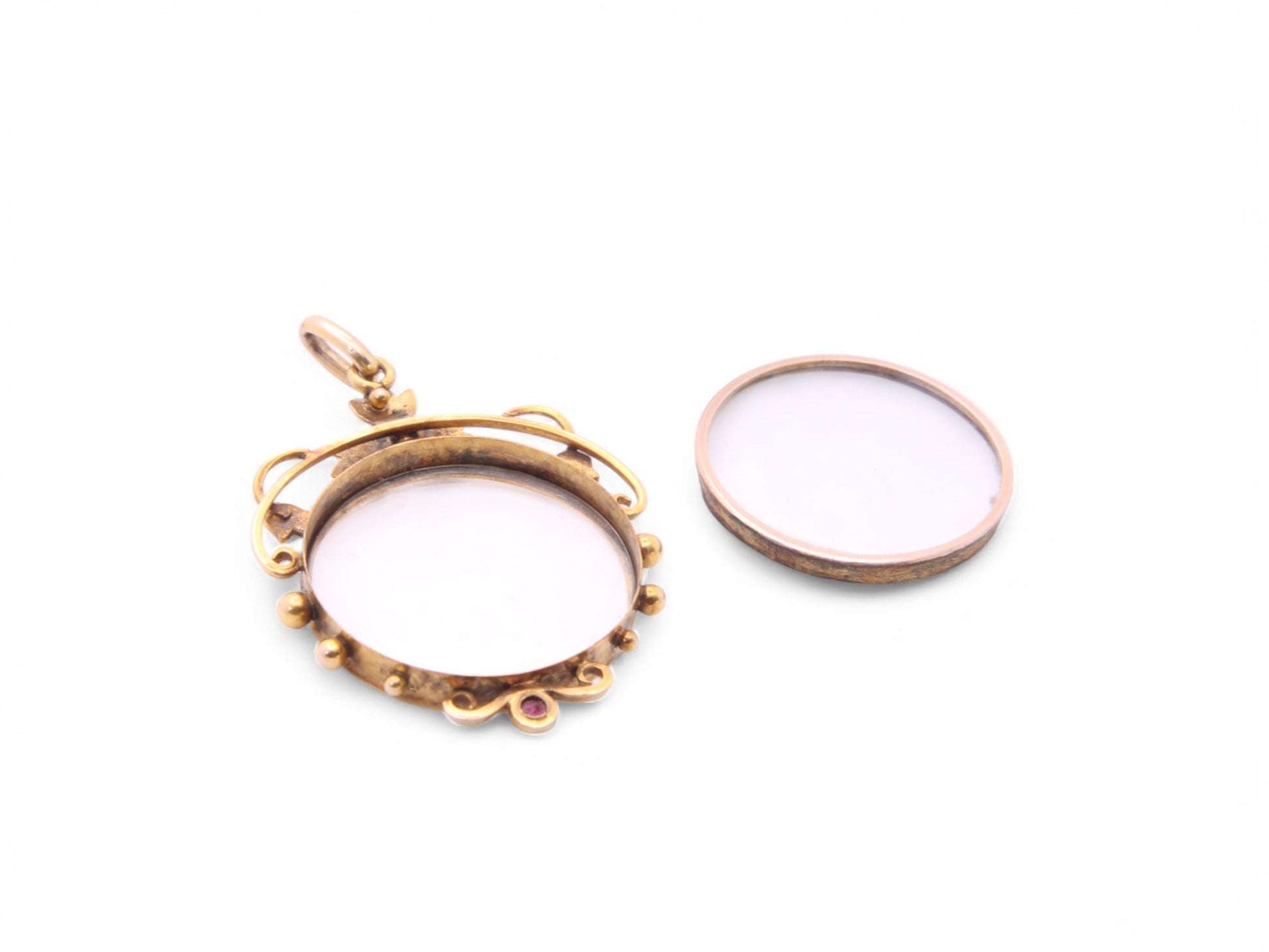 An exquisite antique 9ct gold open-face pendant, beautifully crafted with intricate floral detailing. This elegant piece features a clear glass panel on both sides, allowing a keepsake to be displayed securely within. At the top, a delicate flower is adorned, flanked by two gracefully designed lily of the valley motifs. A striking ruby is set at the base, adding a touch of rich colour.