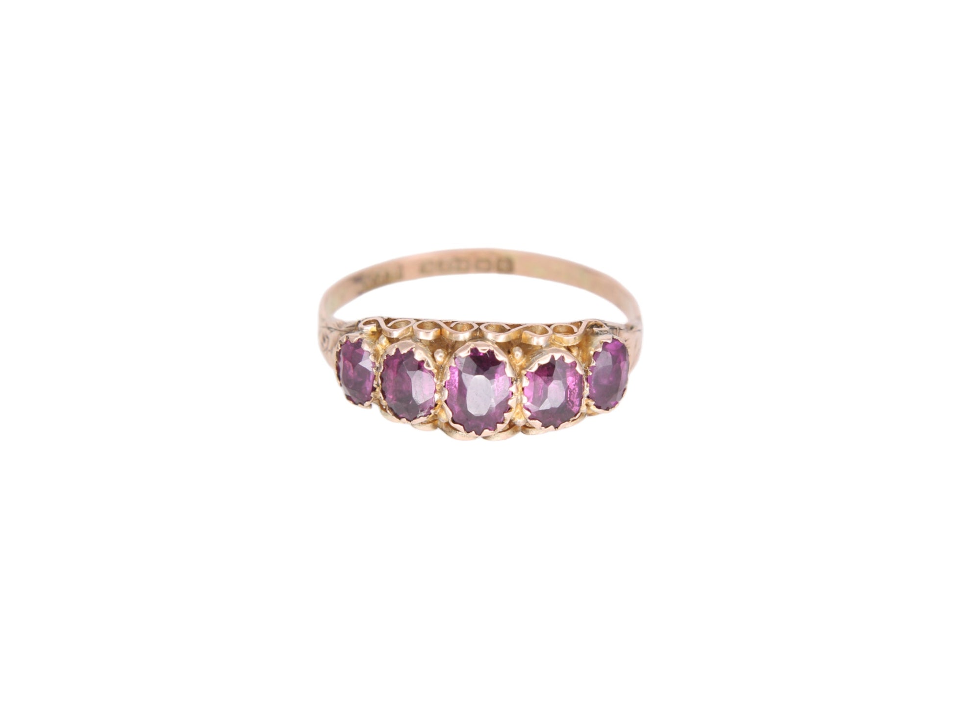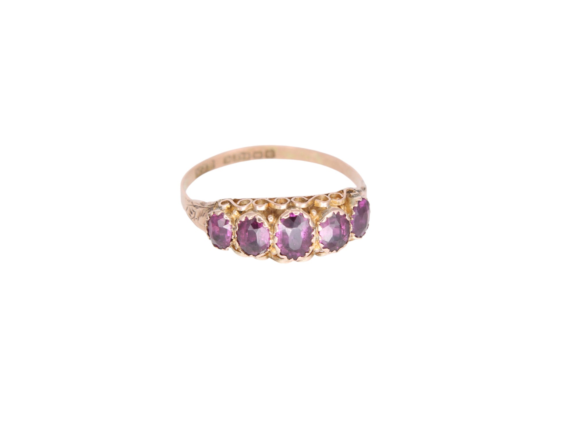 Embrace the allure of the past with our antique Edwardian 9ct gold 5 stone almandine garnet ring, a captivating ring that echoes the elegance of a bygone era.