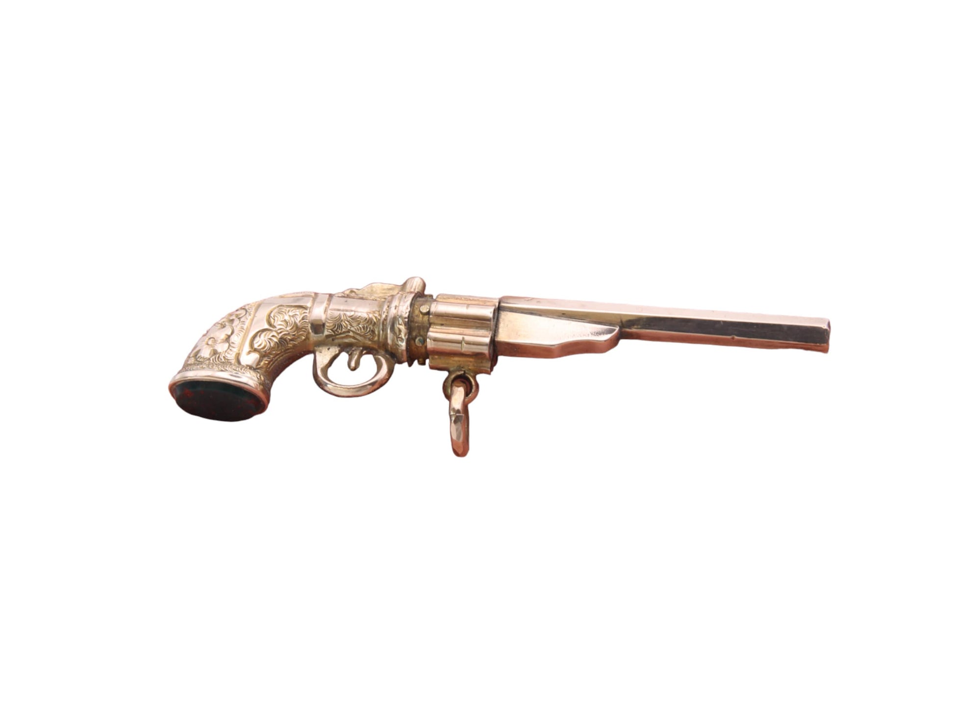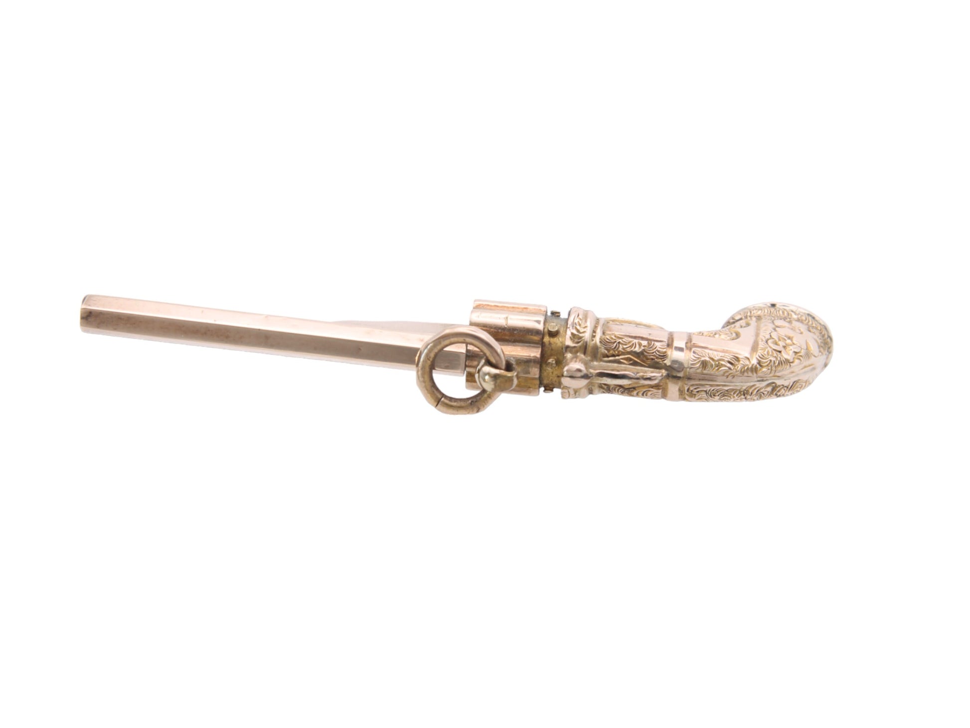 An extraordinary antique 9ct yellow gold watch key pendant, which is a true testament to the unique blend of artistry and history. Crafted in the shape of a revolver, this pendant is a conversation starter and a statement of individuality. The meticulous craftsmanship is evident in the spinning chamber, adding an element of surprise and intrigue to this antique piece.