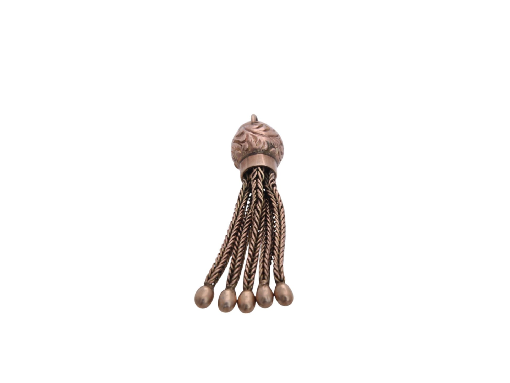 A beautiful antique tassel pendant crafted in rich 9ct rose gold and dating to circa 1880. This elegant Victorian piece features intricate chased detailing to the main body, showcasing the craftsmanship of the era. Hanging gracefully from the base are five articulated foxtail-link tassels that sway delicately with movement, adding a lovely dynamic element. Once likely part of a watch chain or chatelaine, it now makes a distinctive and charming pendant.