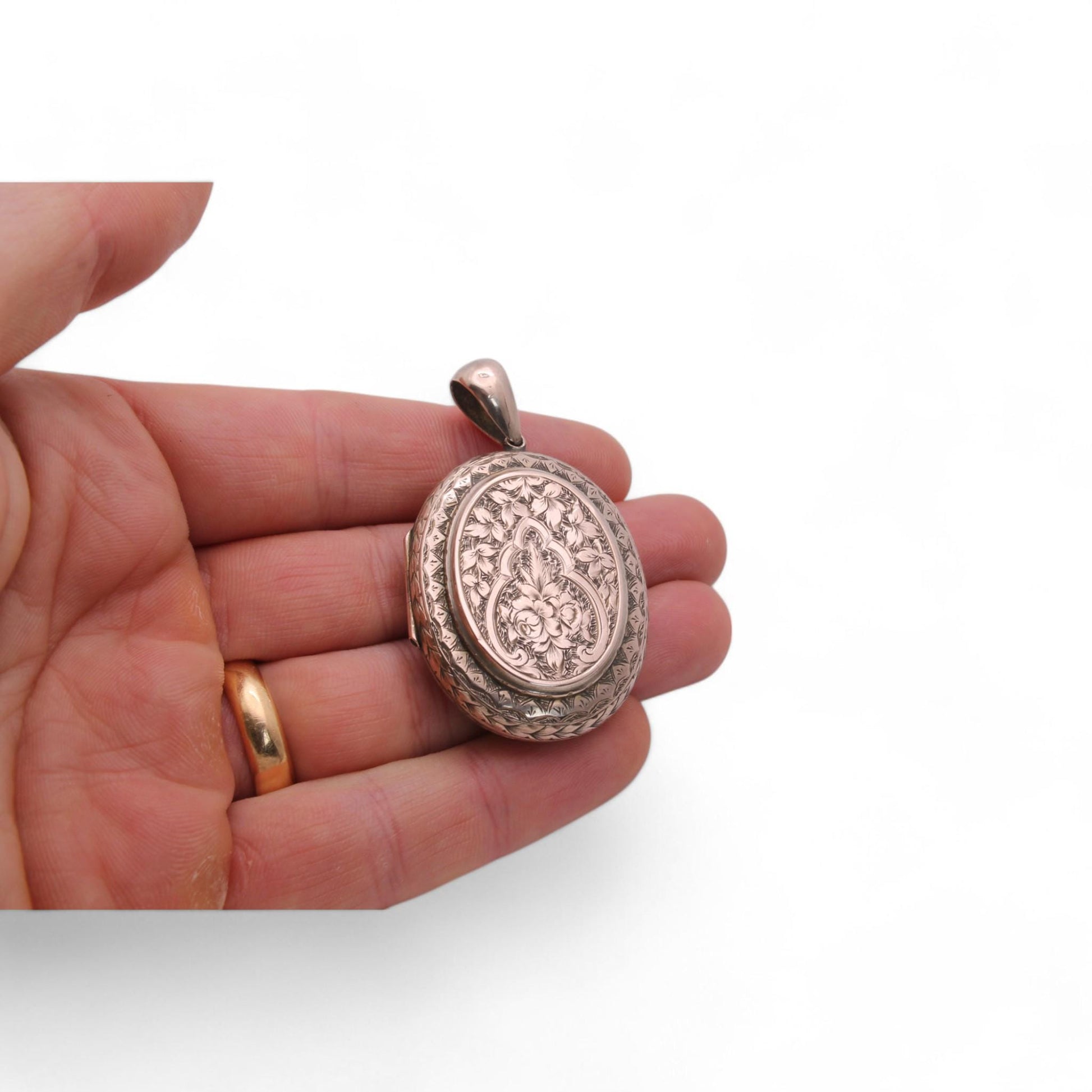 This exquisite antique 9ct rose gold locket is a stunning example of Victorian craftsmanship. The locket is beautifully adorned with intricate engravings throughout, showcasing detailed ivy chasing that symbolizes fidelity and eternity. At the center, delicate engravings of opening rosebuds add a touch of romantic charm and natural beauty, perfectly capturing the essence of the Victorian era.
