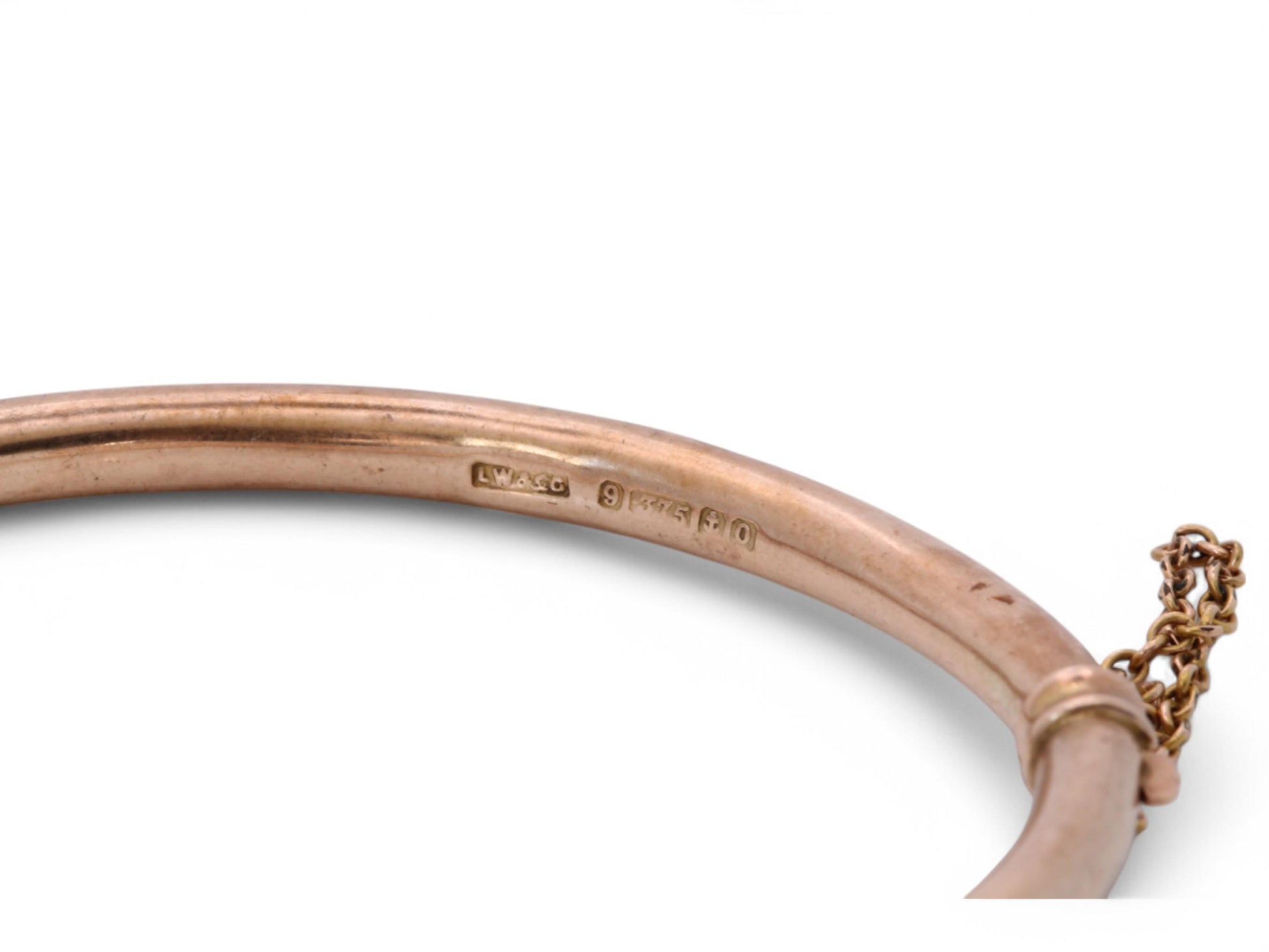 A beautiful antique 9ct rose gold bangle dating to 1913, featuring timeless Edwardian elegance. At the centre sits a rich ruby, flanked on each side by five graduating creamy pearls. Theses are set within a rope-effect border that frames the piece with delicate texture and charm. The warm rose gold tones pair perfectly with the soft lustre of the pearls and the vibrant ruby.