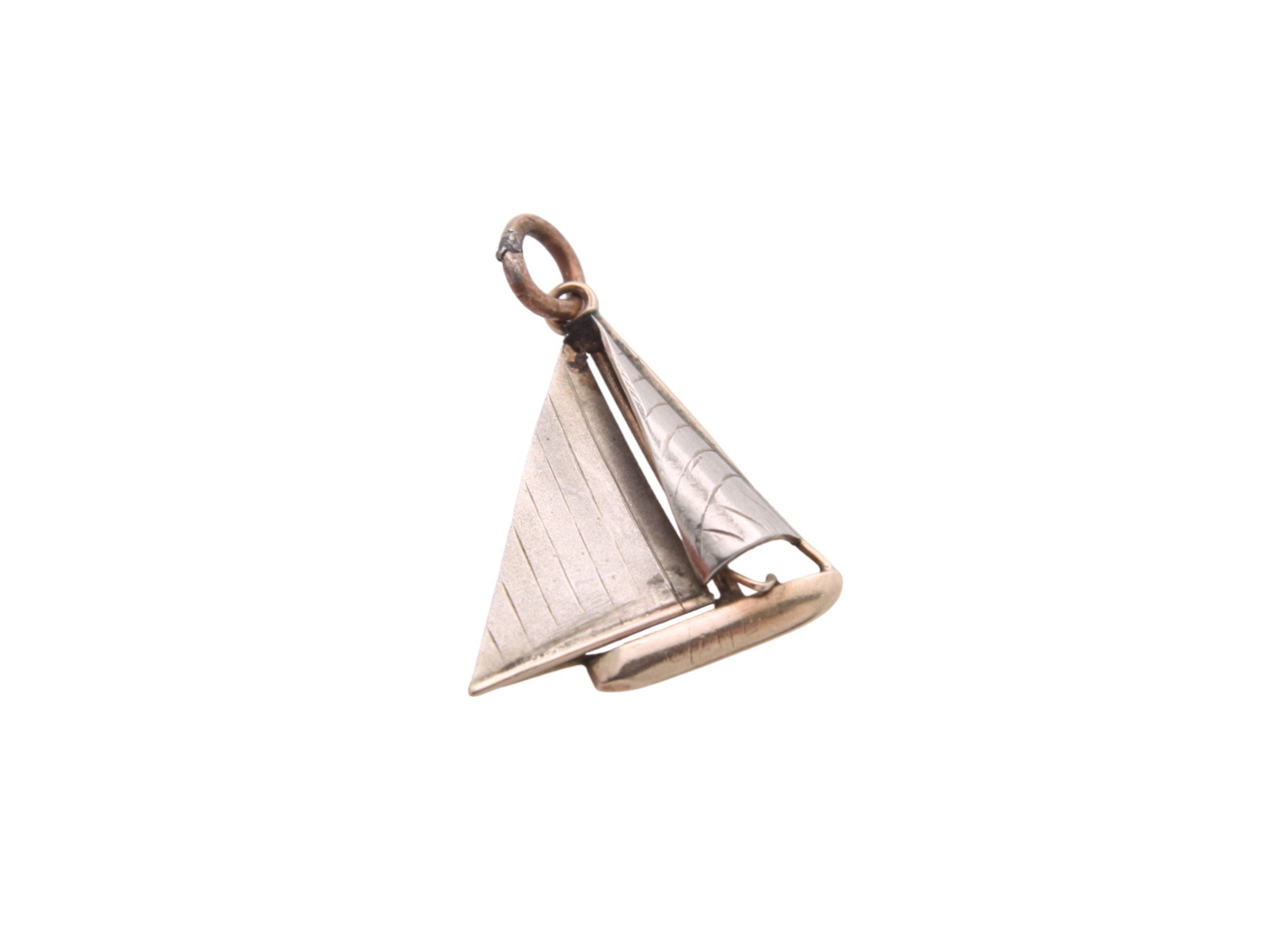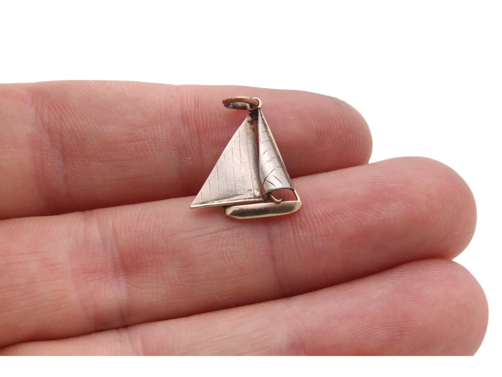 An exquisite antique 9ct gold sailing boat charm, a unique treasure that beautifully captures the essence of nautical adventure. This finely crafted charm is modeled in two-tone gold, featuring a stunning combination of white and rose gold. The delicate contrast between the two tones enhances the charm's intricate details.