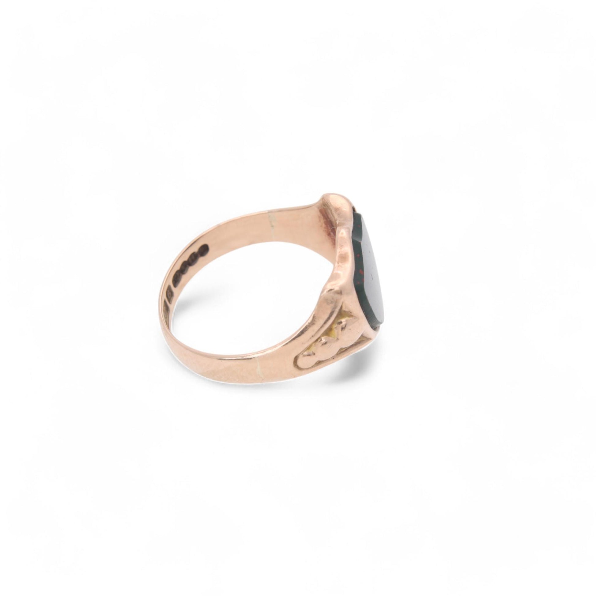 This antique 9ct rose gold signet ring exudes timeless elegance and charm. Featuring a shield-shaped bloodstone set into its face, the deep green stone is flecked with subtle red accents, making it a striking focal point. The warm hue of the rose gold band complements the bloodstone beautifully.