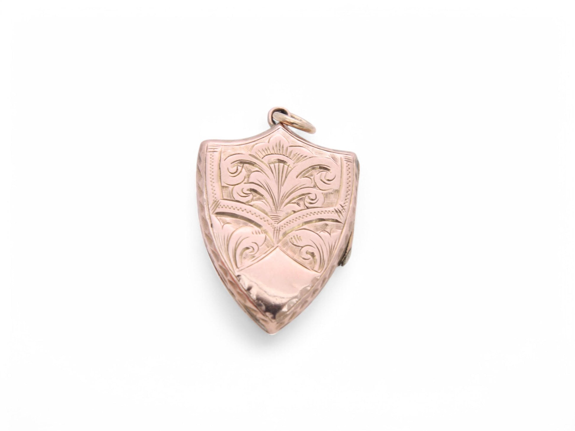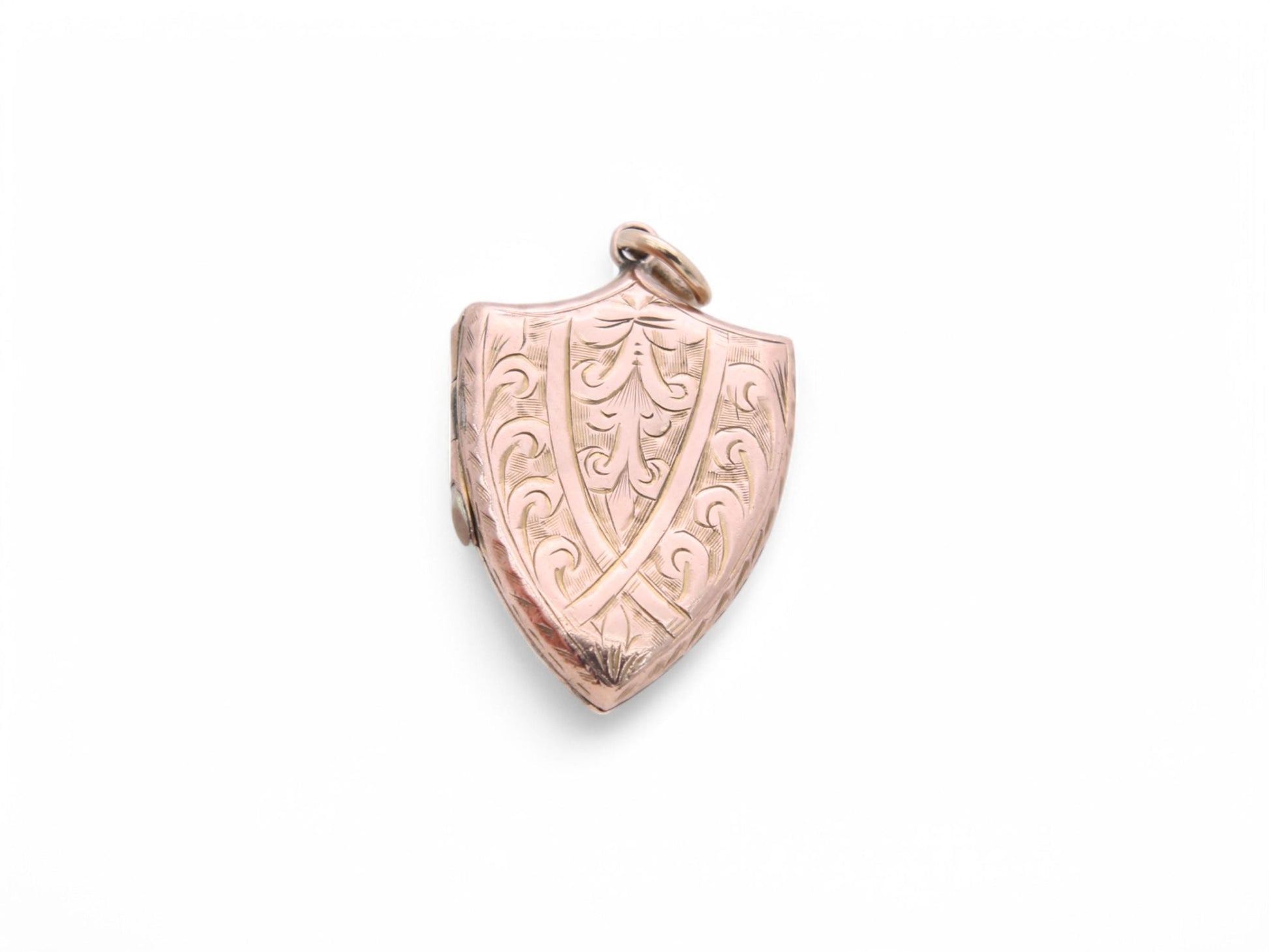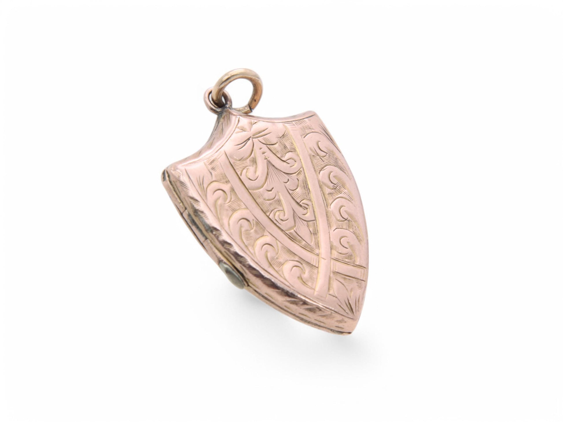 This antique 9ct rose gold back & front shield locket, dating to c.1880, is a beautifully crafted piece with intricate chased detailing on both the front and back. The elegant shield shape adds a distinctive and timeless charm, making it a standout piece of Victorian jewellery.