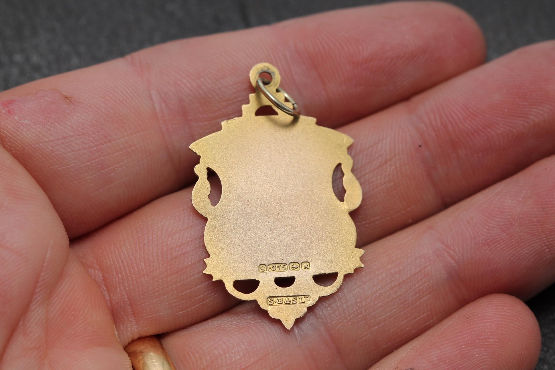 Antique 9ct gold pendant crafted in the shape of a shield, dating to 1909. The front features a central blank cartouche. A classic Edwardian piece with timeless appeal, this pendant is perfect for wearing alone or layered with others.
