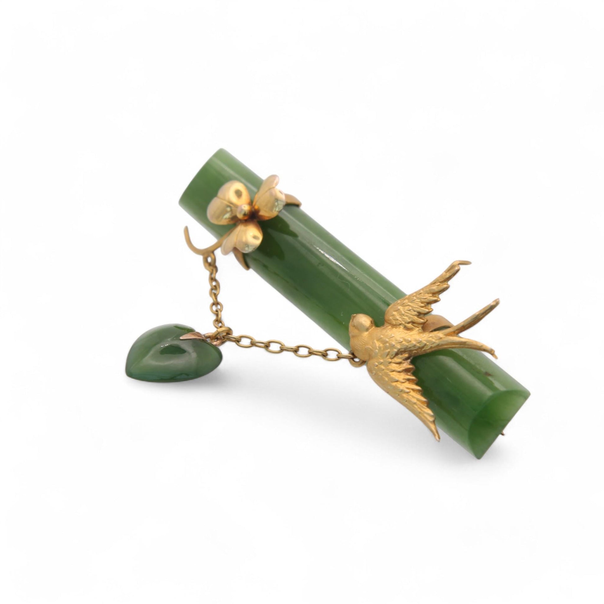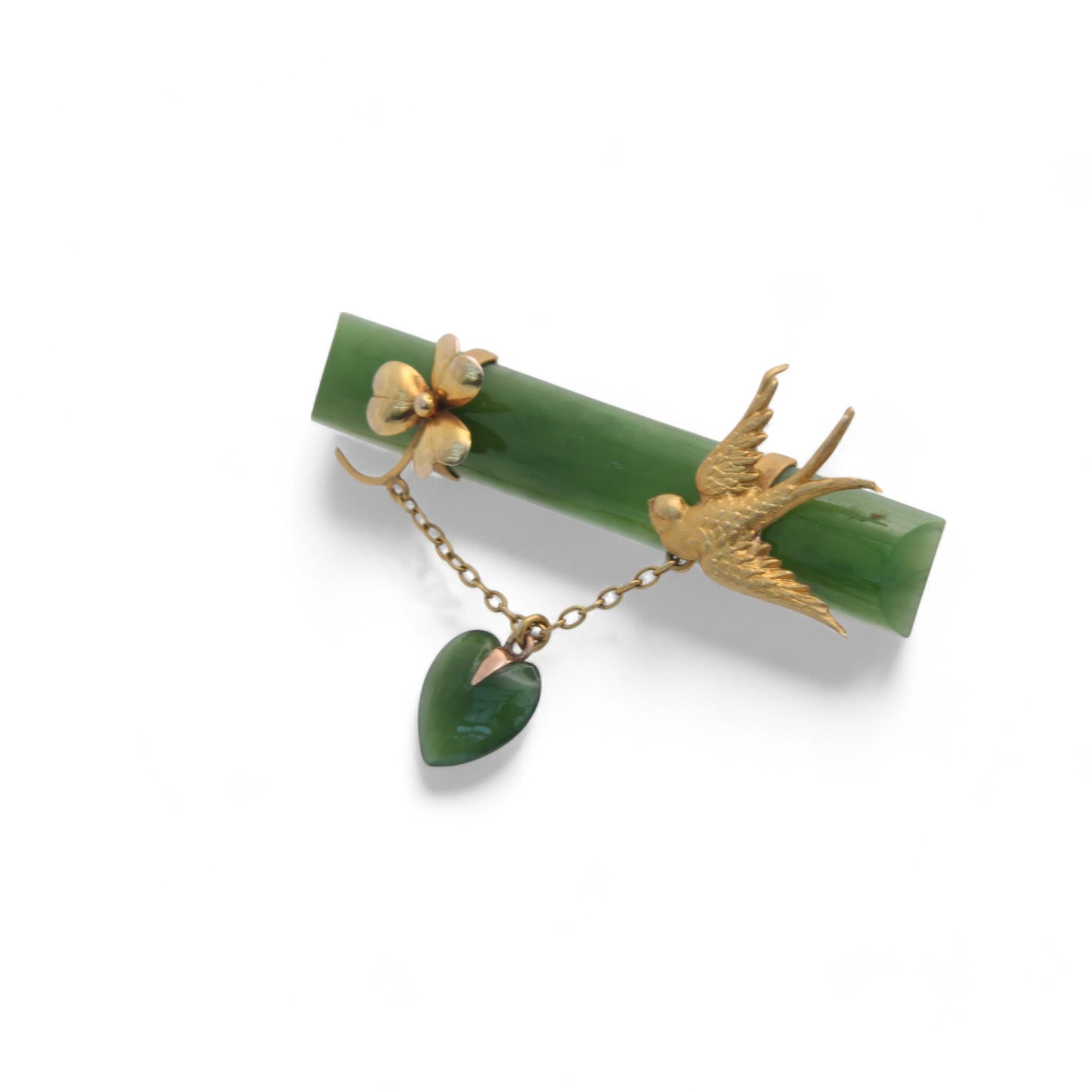 This exquisite antique brooch showcases the timeless beauty of New Zealand nephrite which is elegantly crafted. The brooch features a delicately applied 9ct gold swallow and a charming floral motif, both symbols of love and freedom