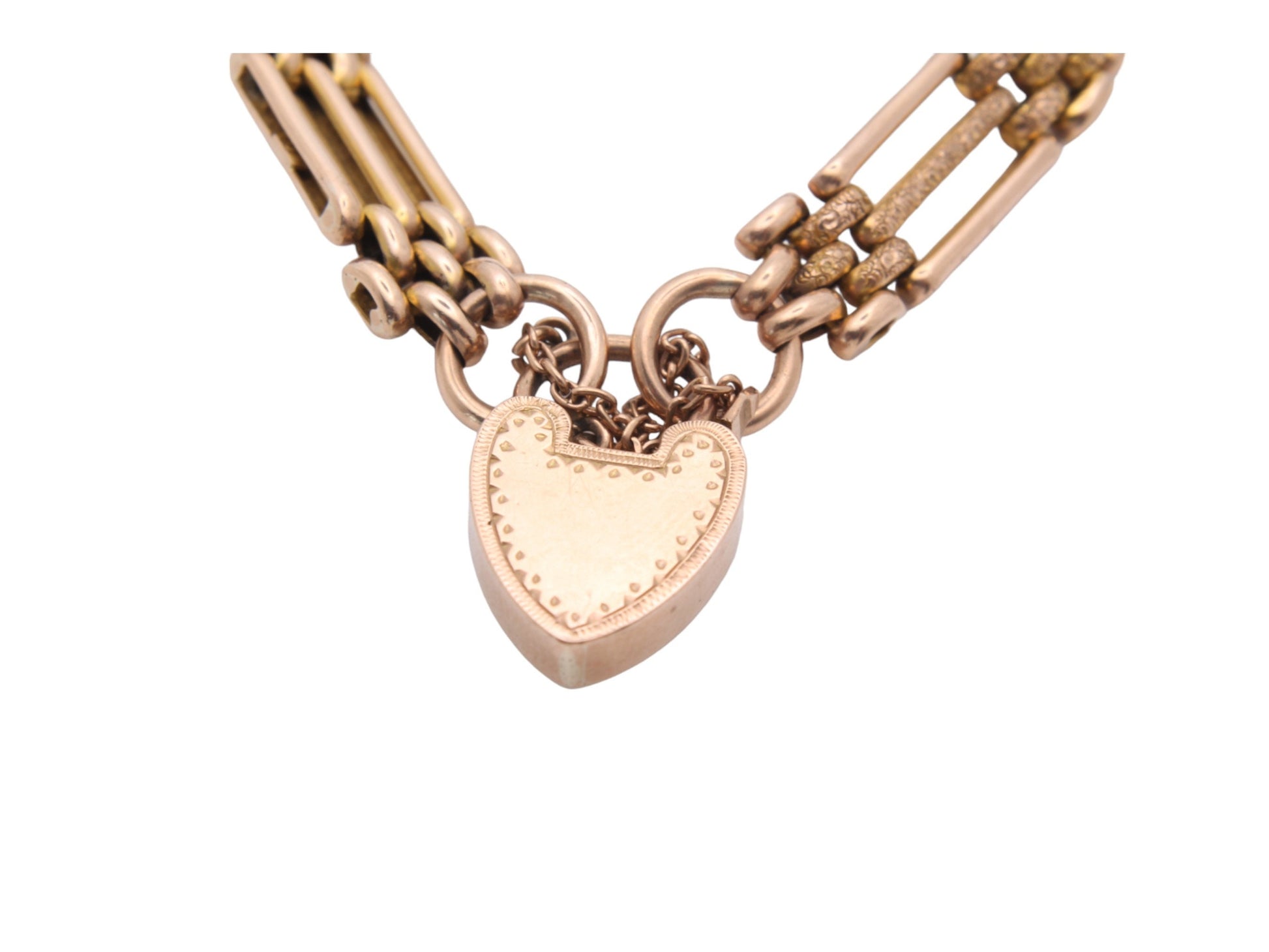 An enchanting antique Edwardian 9ct gold gate bracelet. This charming antique has divine textured links which are beautifully complimented by the engraved heart padlock.