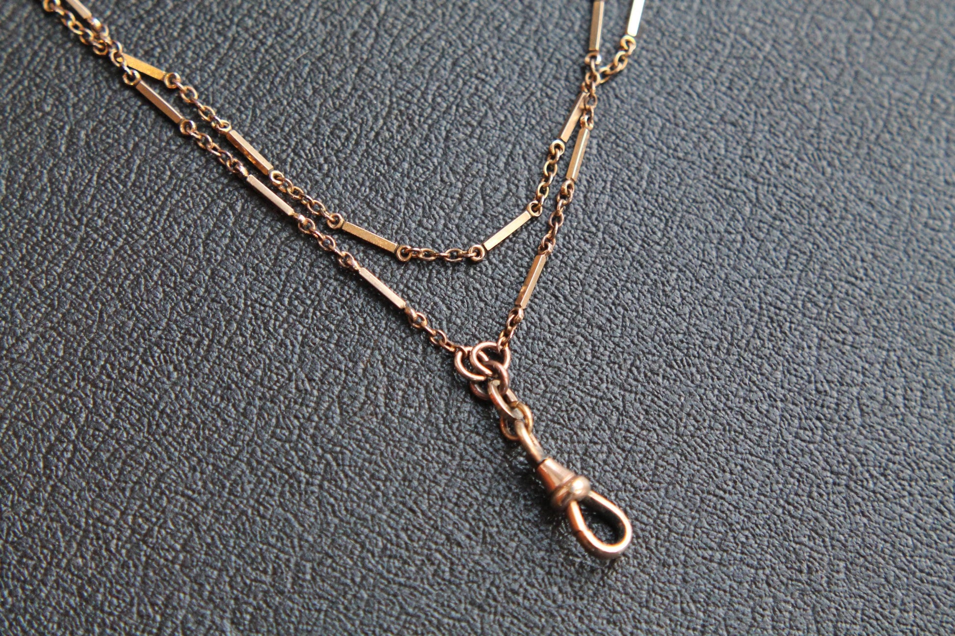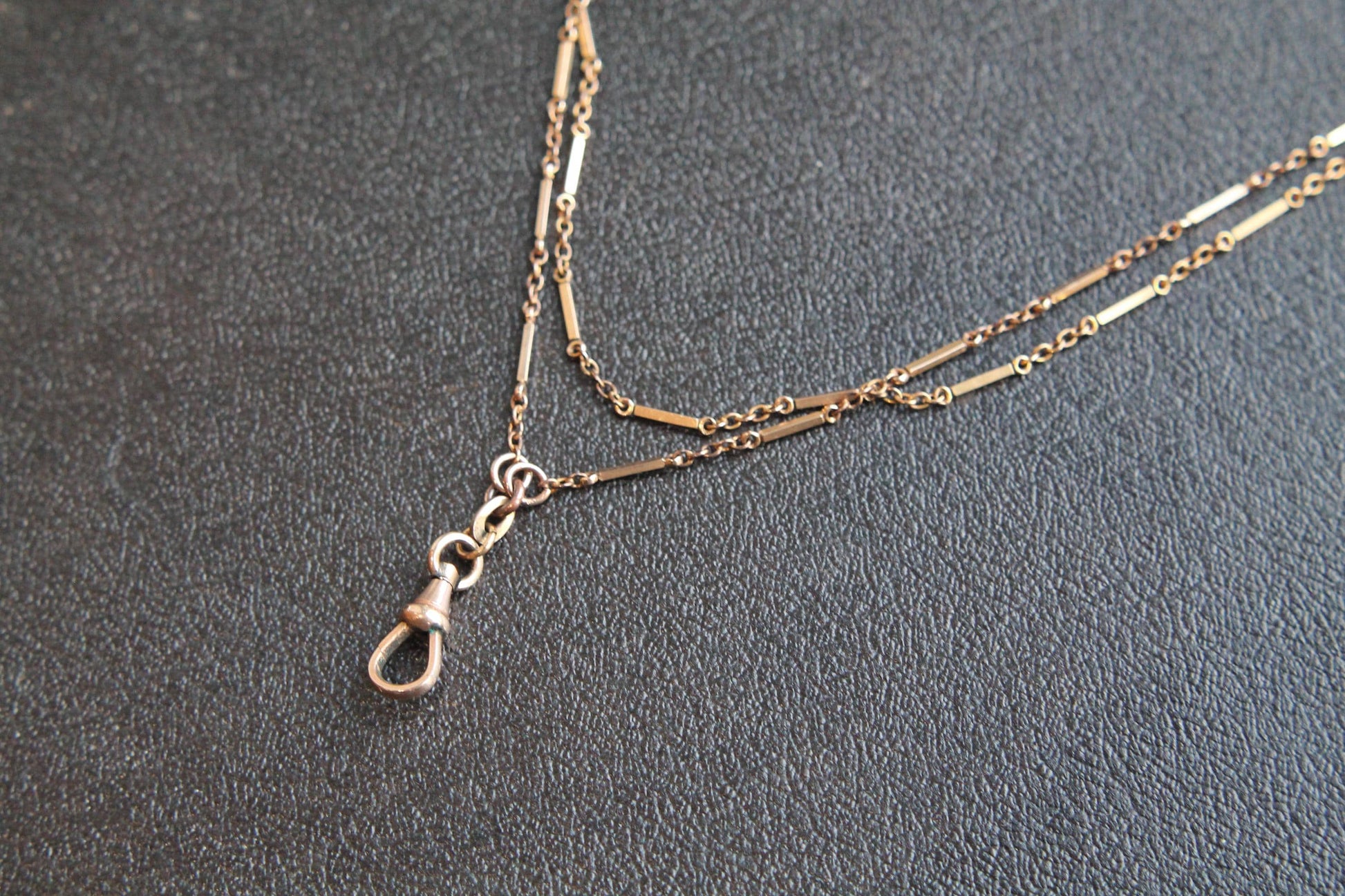An exceptional antique 9ct rolled gold long guard chain with a slight rosy hue, dating to c.1900, featuring a rare and striking link design. The chain alternates bar-tabbed links with classic belcher links, creating a dynamic, textured look that catches the eye. Complete with its original dog clip, it is ready to wear or display with a locket or pendant.