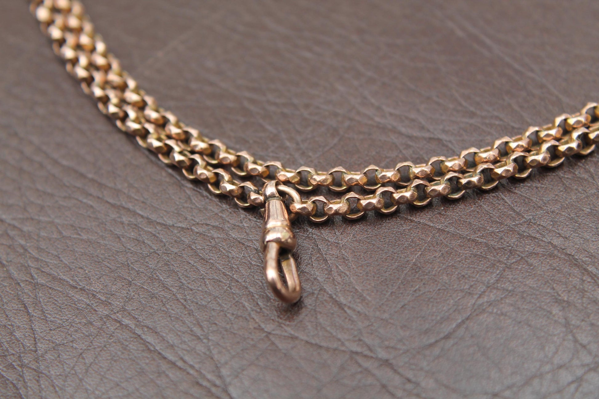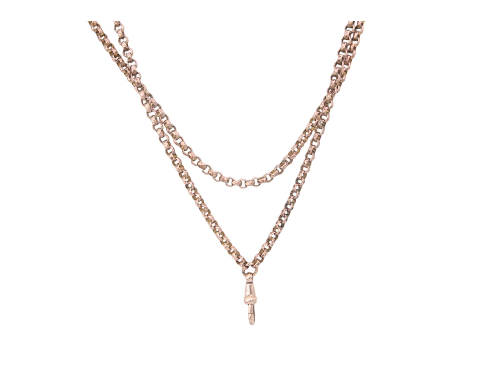 A divine Victorian long guard chain crafted in 9ct rose rolled gold and measuring 55". The links are faceted which catch the light beautifully. Fitted with a sturdy dog clip, the chain remains in lovely condition.