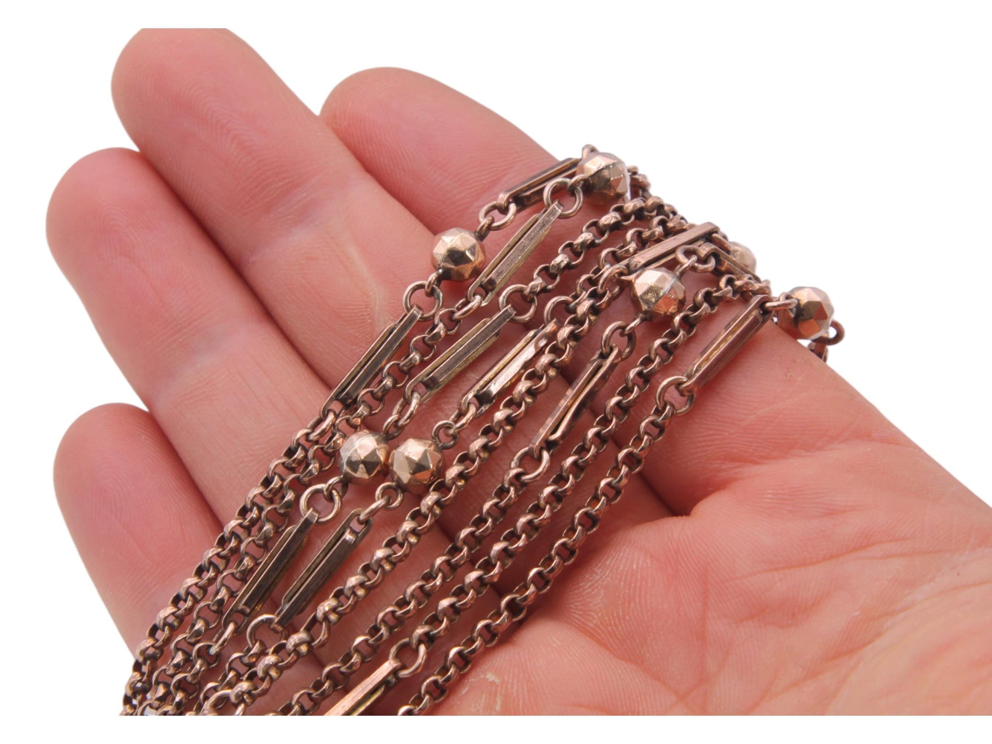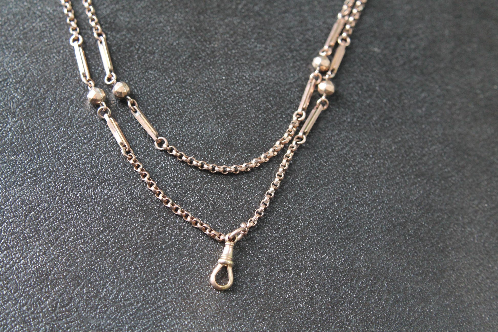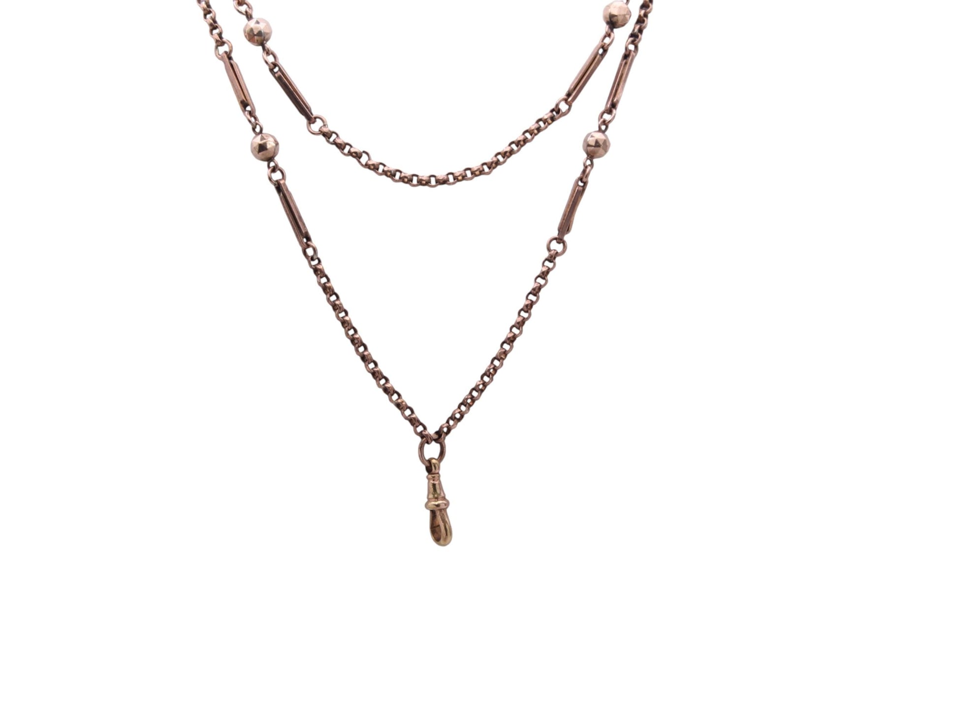 A lovely quality antique 9ct rolled rose gold long guard chain dating to c.1890. This example features an attractive and less commonly seen fancy fetter and ball link, giving the chain strong visual rhythm and period character. Finished with its original dog clip.