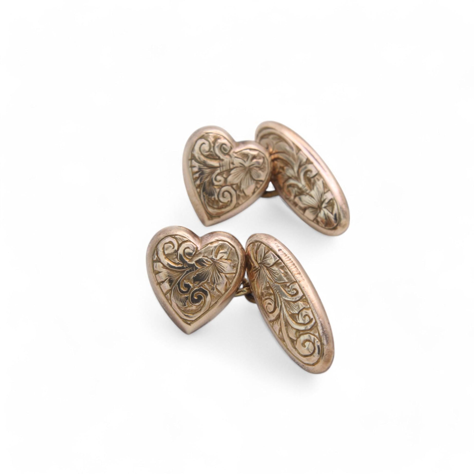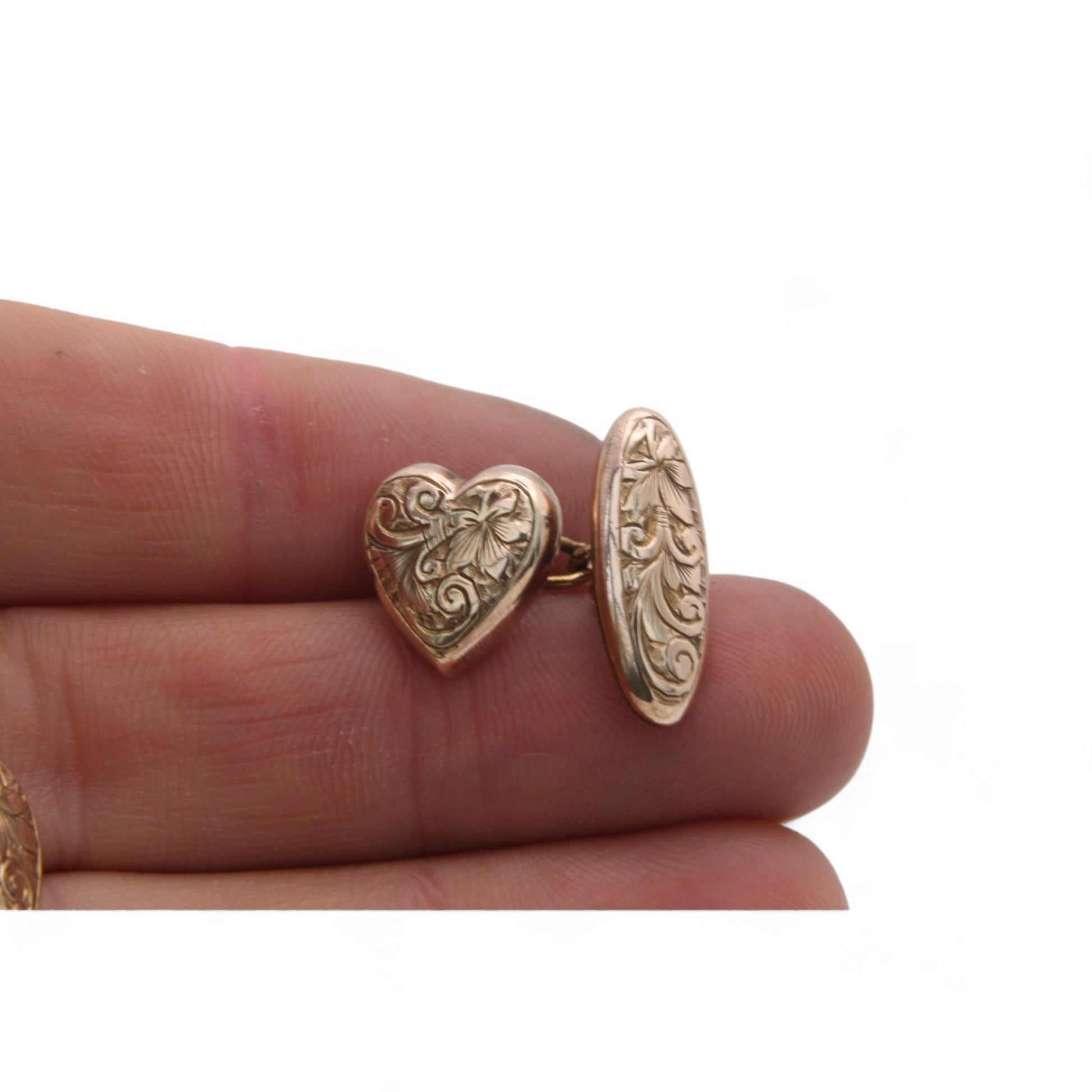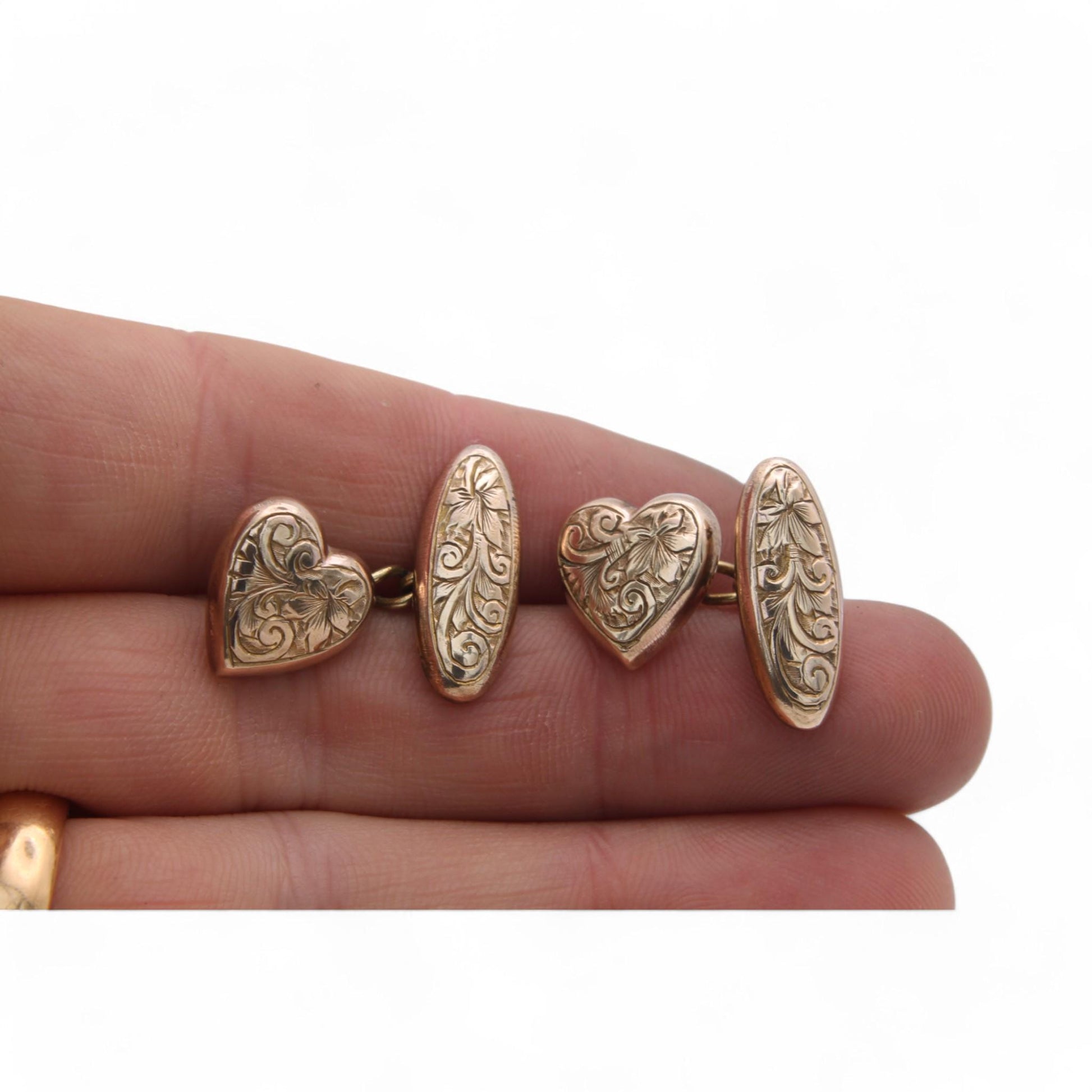 Each cufflink features a heart-shaped face, beautifully engraved with intricate detailing that reflects exceptional craftsmanship. The warm rolled gold finish enhances their timeless appeal, making them suitable for both formal occasions and as a thoughtful gift.