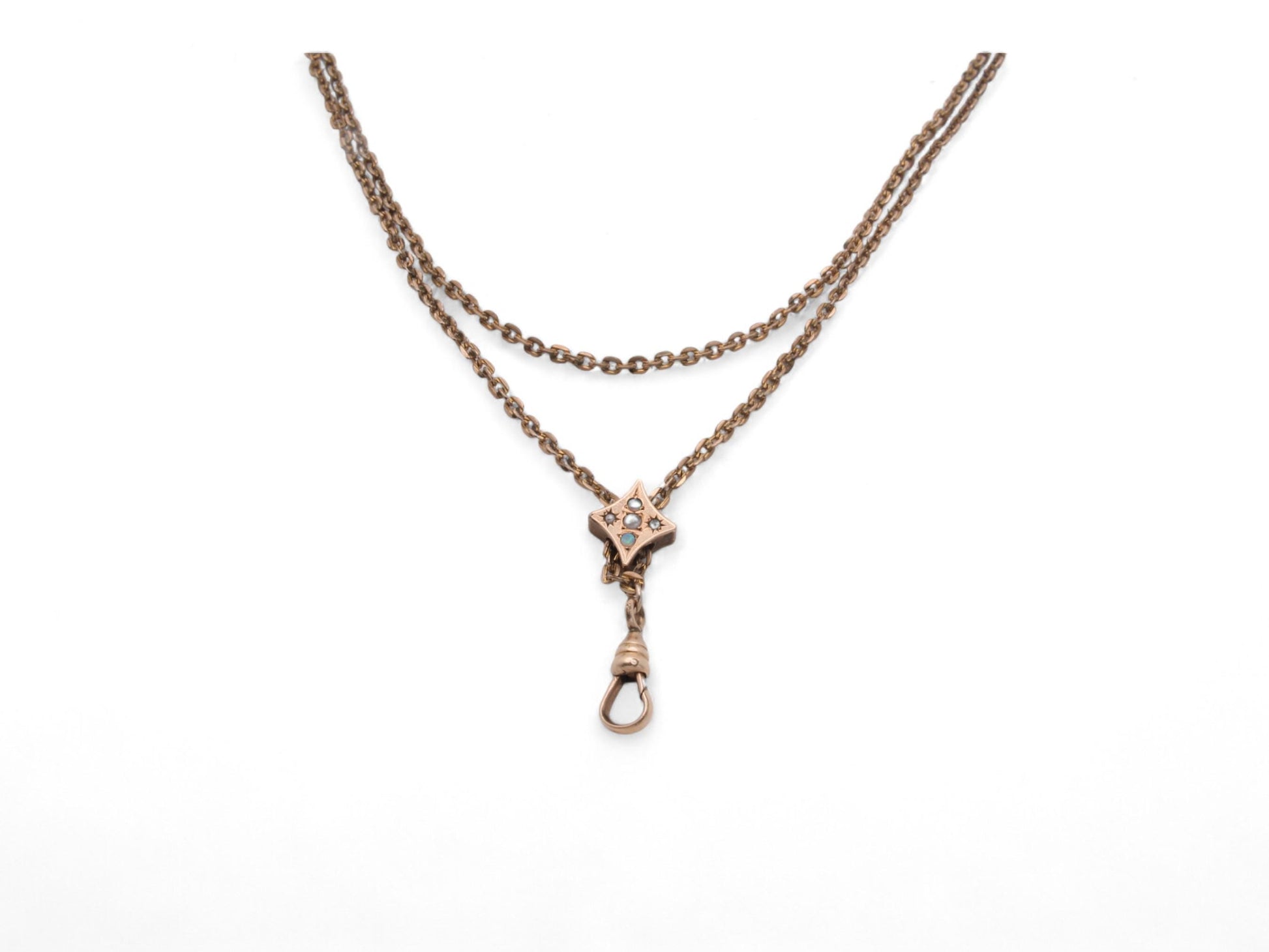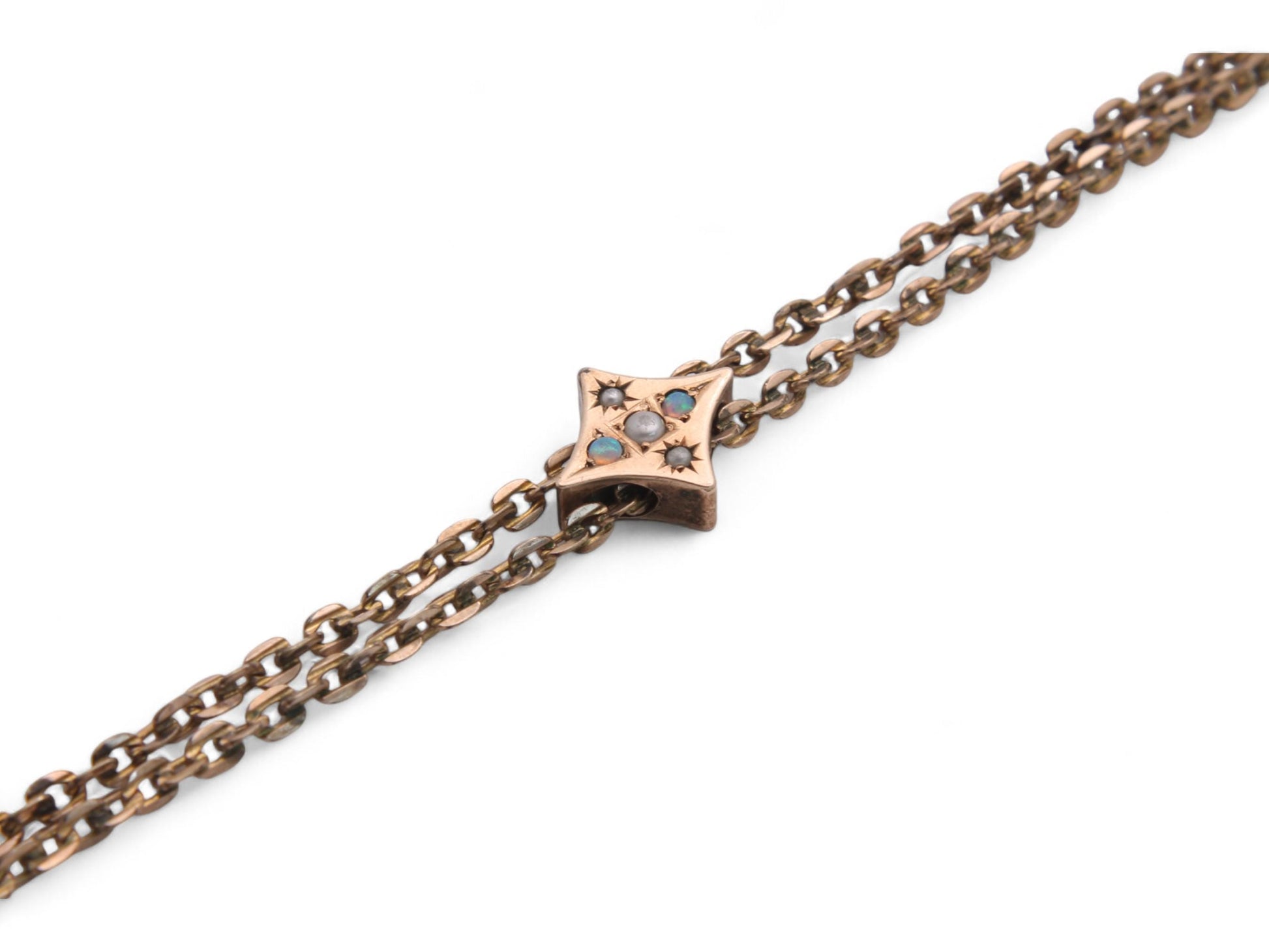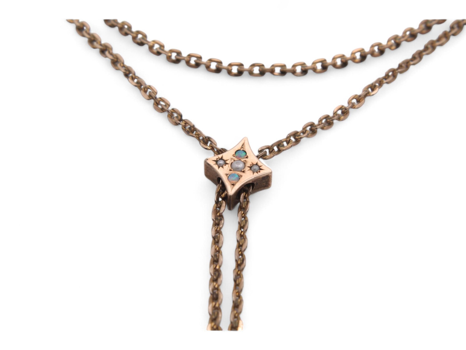 This exquisite antique 9ct rose rolled gold long guard chain is a timeless piece, featuring a beautifully designed 9ct gold front and back slider. The slider, adorned with two luminous opals and three delicate pearls, is intricately set within a star-etched design, adding a touch of elegance and sparkle.