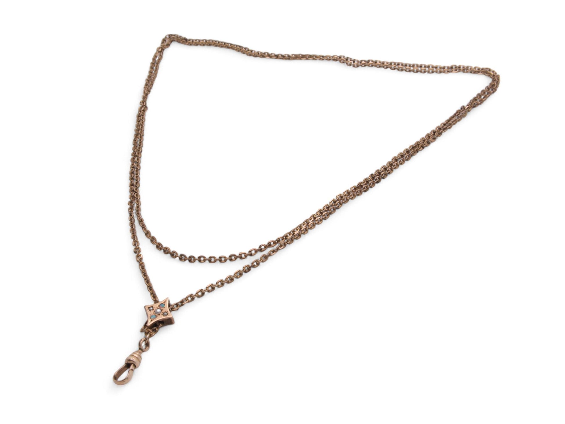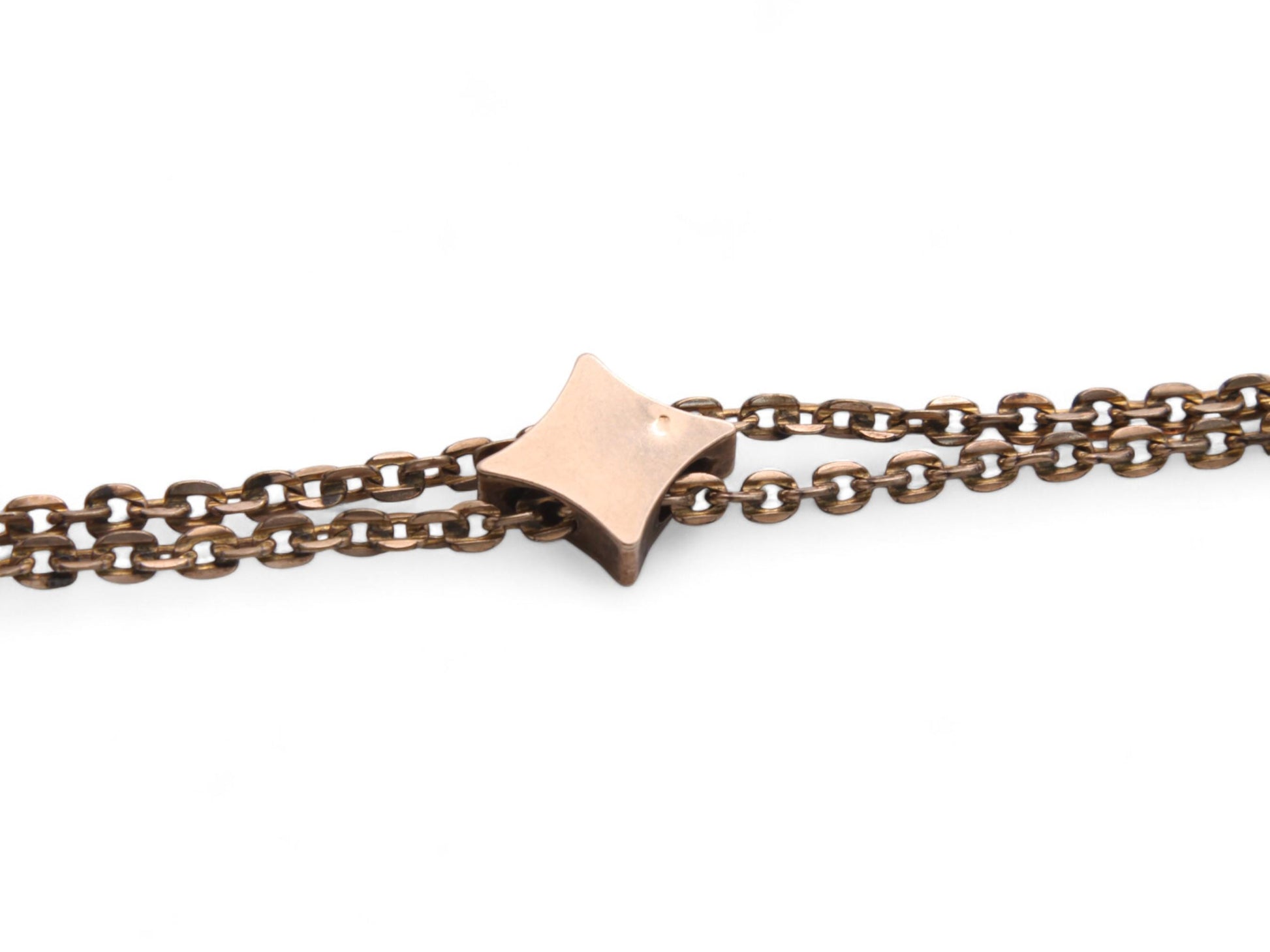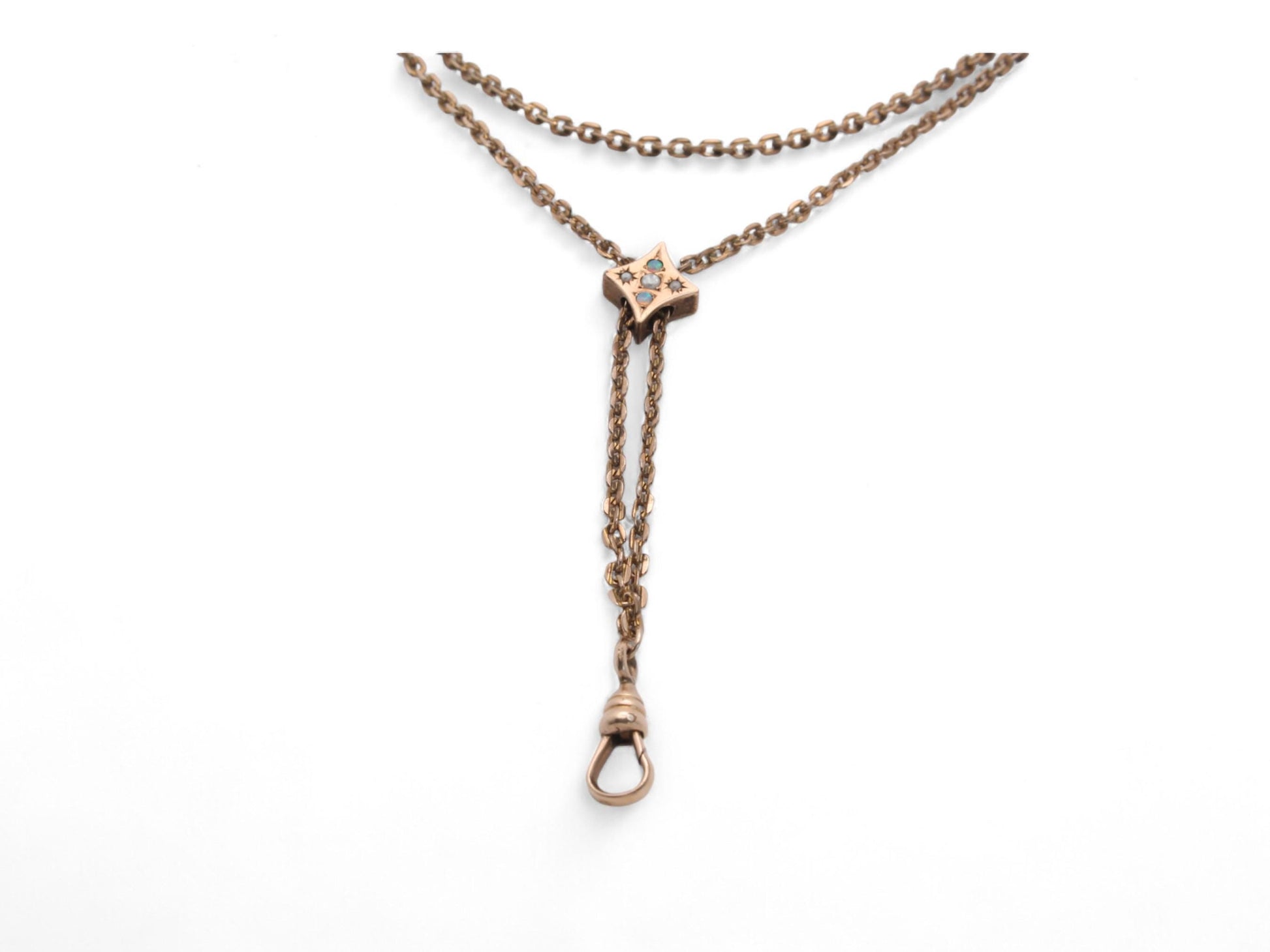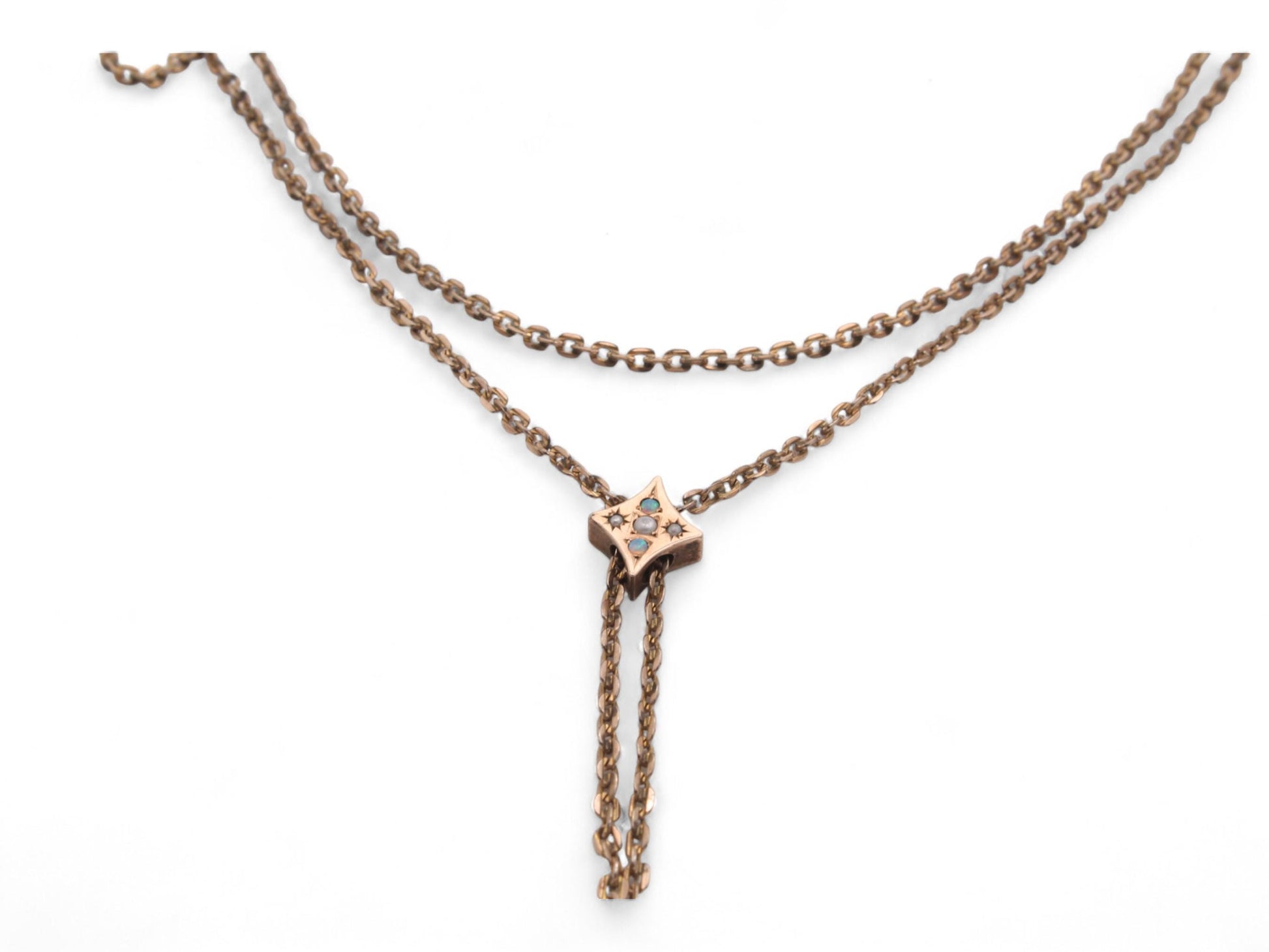 This exquisite antique 9ct rose rolled gold long guard chain is a timeless piece, featuring a beautifully designed 9ct gold front and back slider. The slider, adorned with two luminous opals and three delicate pearls, is intricately set within a star-etched design, adding a touch of elegance and sparkle.