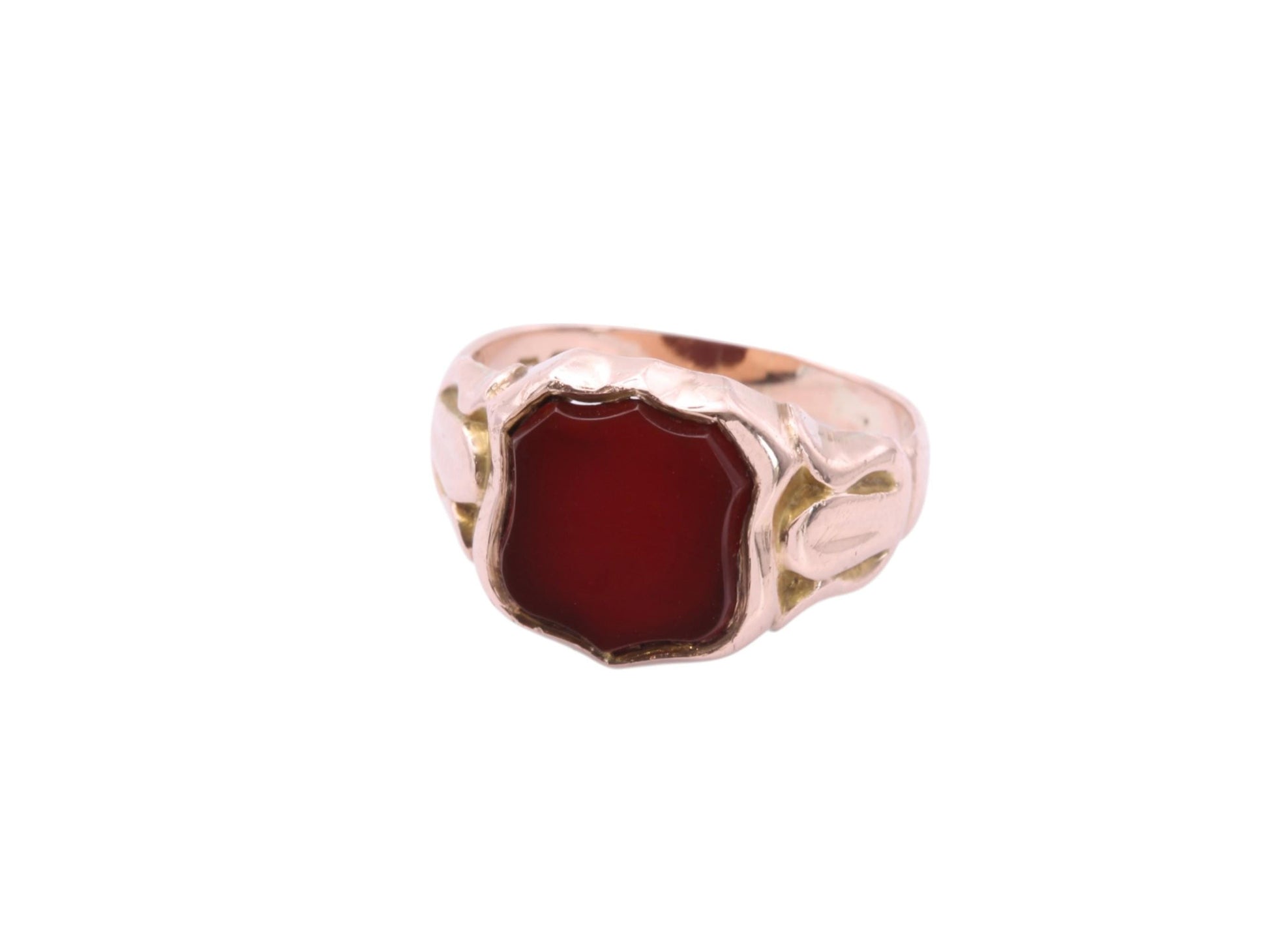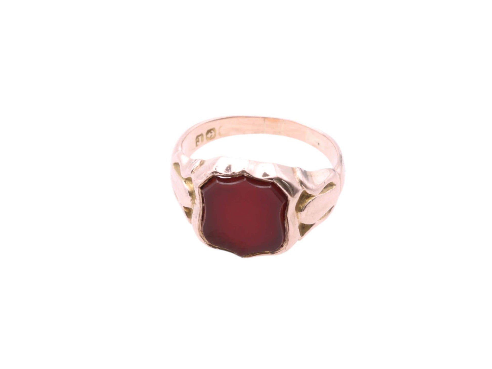 An antique 9ct rose gold signet ring dating to 1916, featuring a shield-shaped carnelian set into the face. The shoulders are finely detailed, adding subtle elegance and character to the piece.
