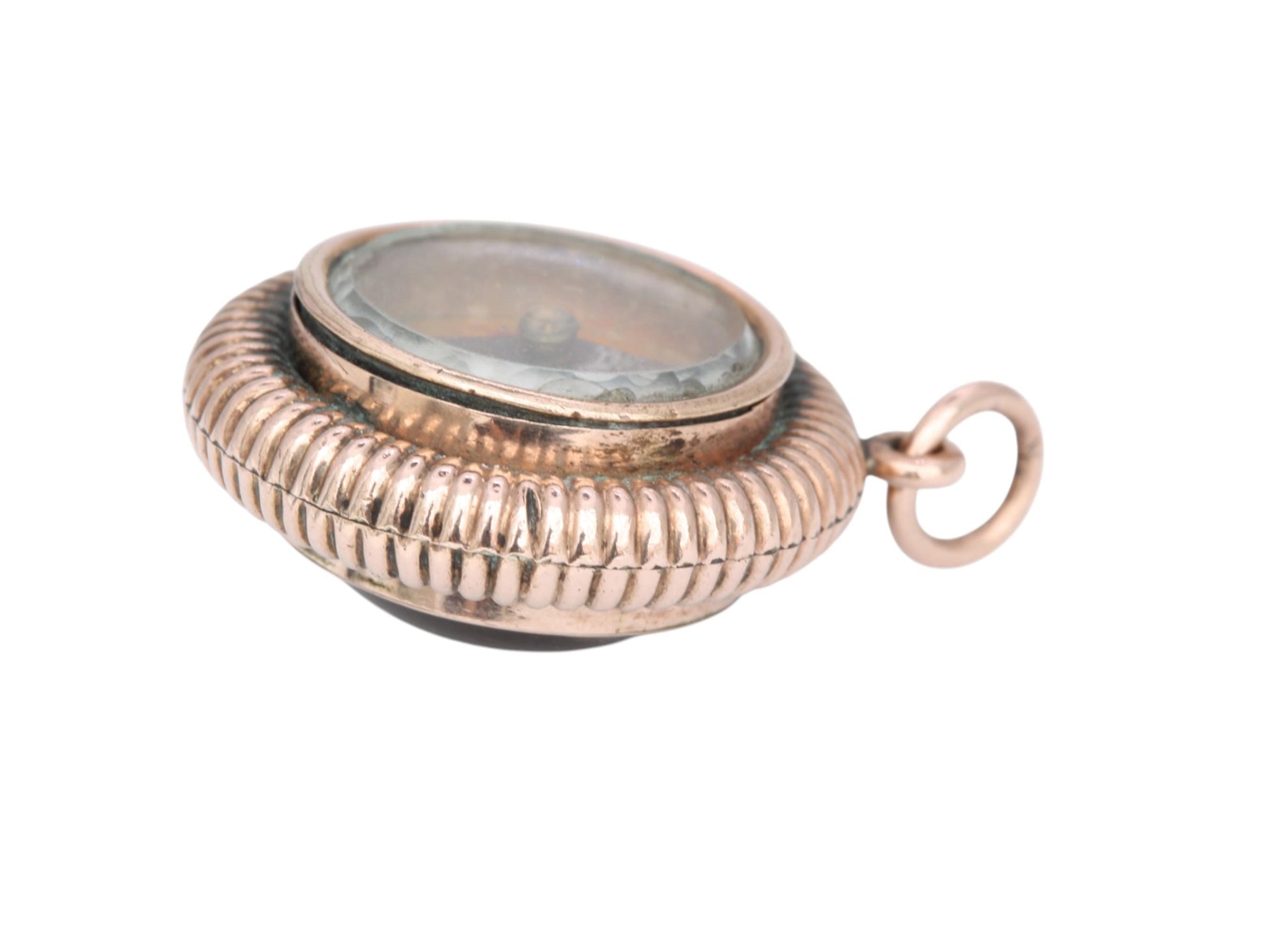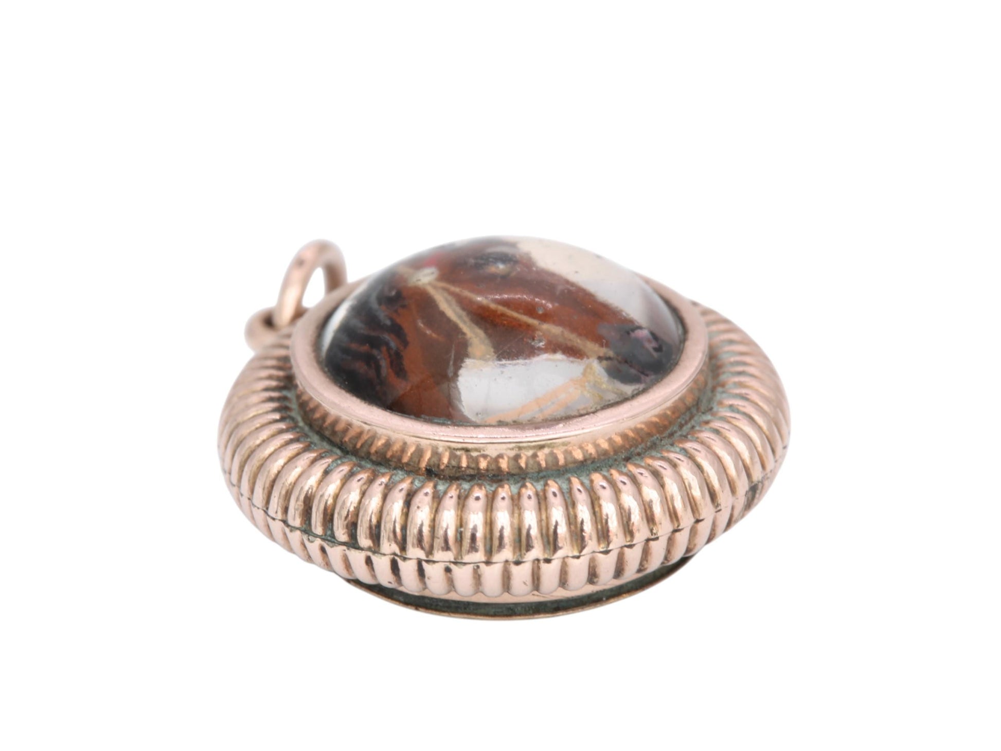The reverse side holds a fully functional compass. Crafted in 9ct rose gold fill, the pendant retains a warm antique patina and is in lovely condition for its age. An exceptional collector’s item for lovers of antique equestrian jewellery and Victorian novelties.