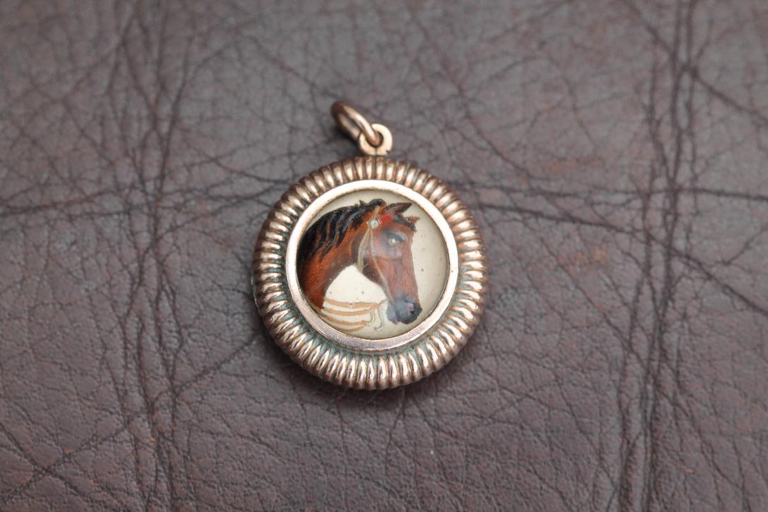 A rare and captivating late-Victorian Essex crystal pendant featuring a finely painted horse head beneath a domed crystal. The detailed equestrian scene is beautifully preserved, showcasing remarkable craftsmanship from the era.