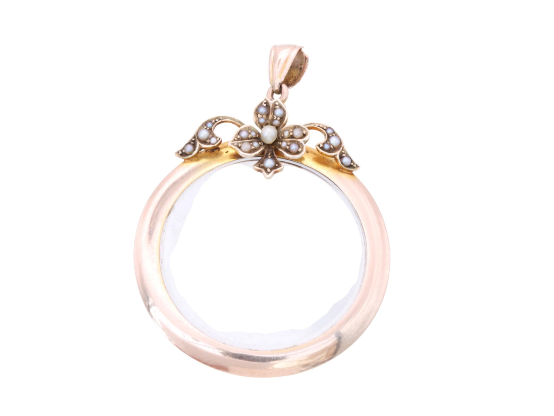 A beautiful antique 9ct rose gold open-face glass locket, dating to circa 1901, showcasing the delicate artistry of the Edwardian era. The warm rose gold mount is adorned with a cluster of pearl-set flowers at the top, their soft lustre adding a touch of refined elegance and sentiment.