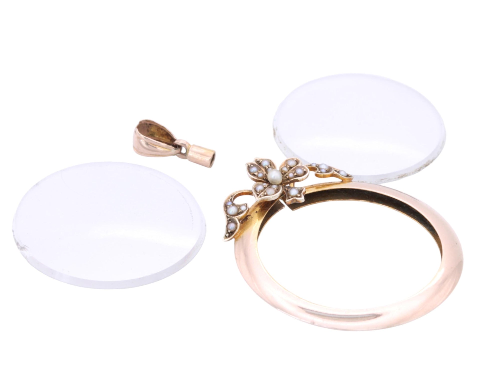 Antique 9ct Rose Gold Pearl Flower Open Glass Locket, Edwardian c.1901