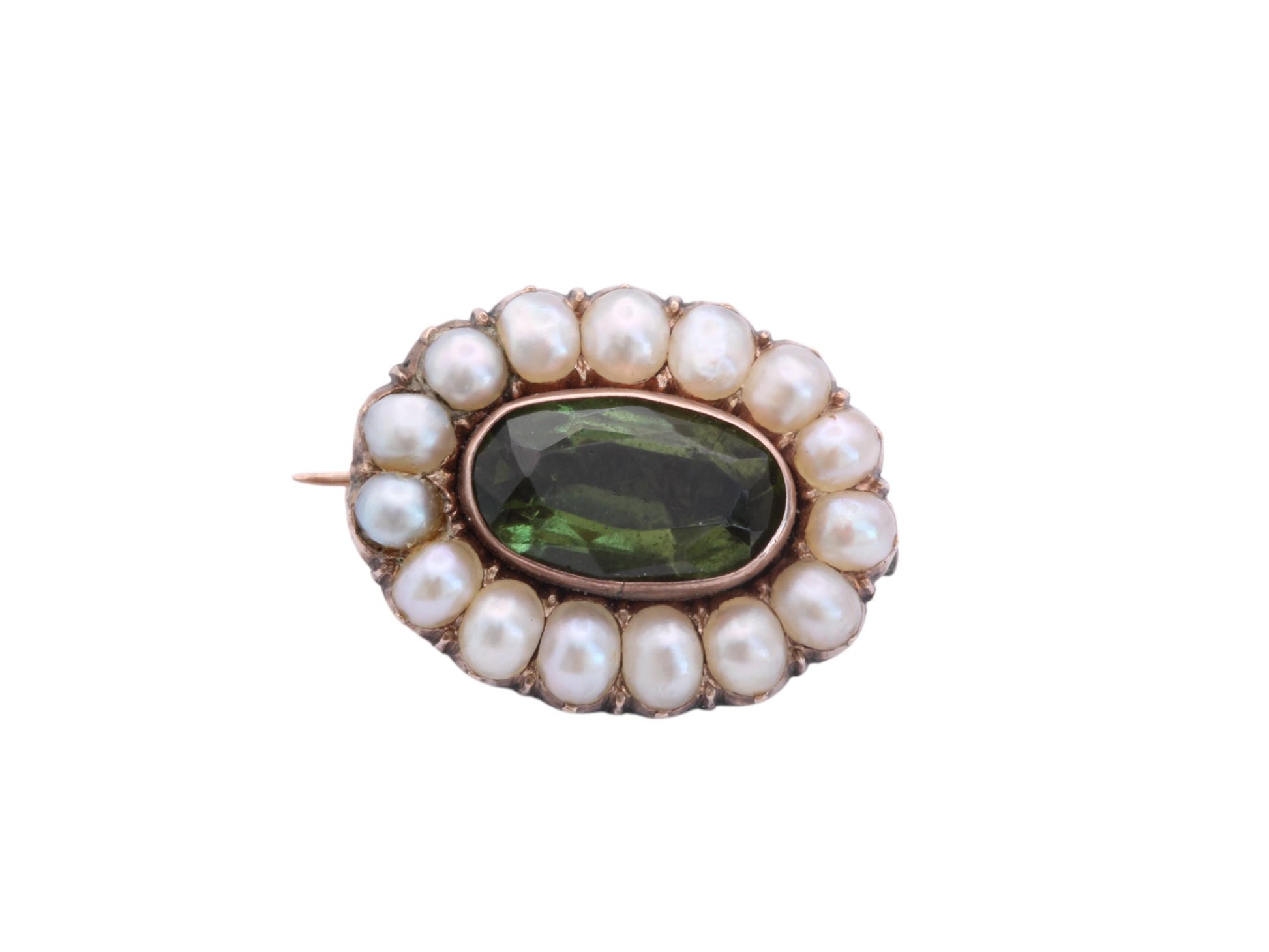 A striking antique brooch crafted in 9ct yellow gold, dating to the Victorian era, c.1860. At its centre sits a vibrant oval-cut peridot, encircled by a delicate halo of creamy seed pearls—a classic combination adored in Victorian jewellery for its symbolic beauty and colour harmony. The brooch is fitted with a strong pin and a secure safety catch, locking it firmly in place when worn. An elegant and timeless piece, perfect for lovers of antique gemstone jewellery.