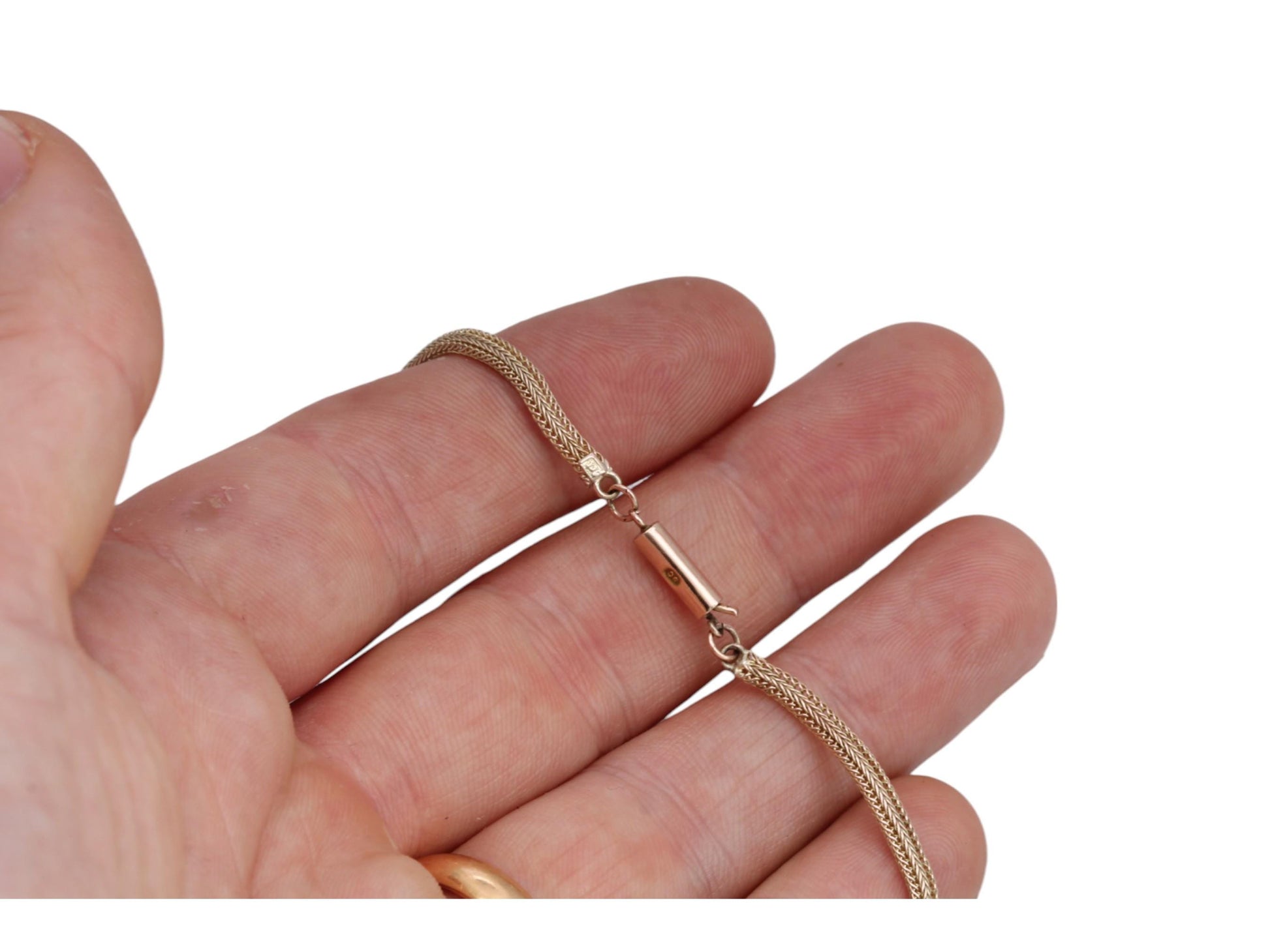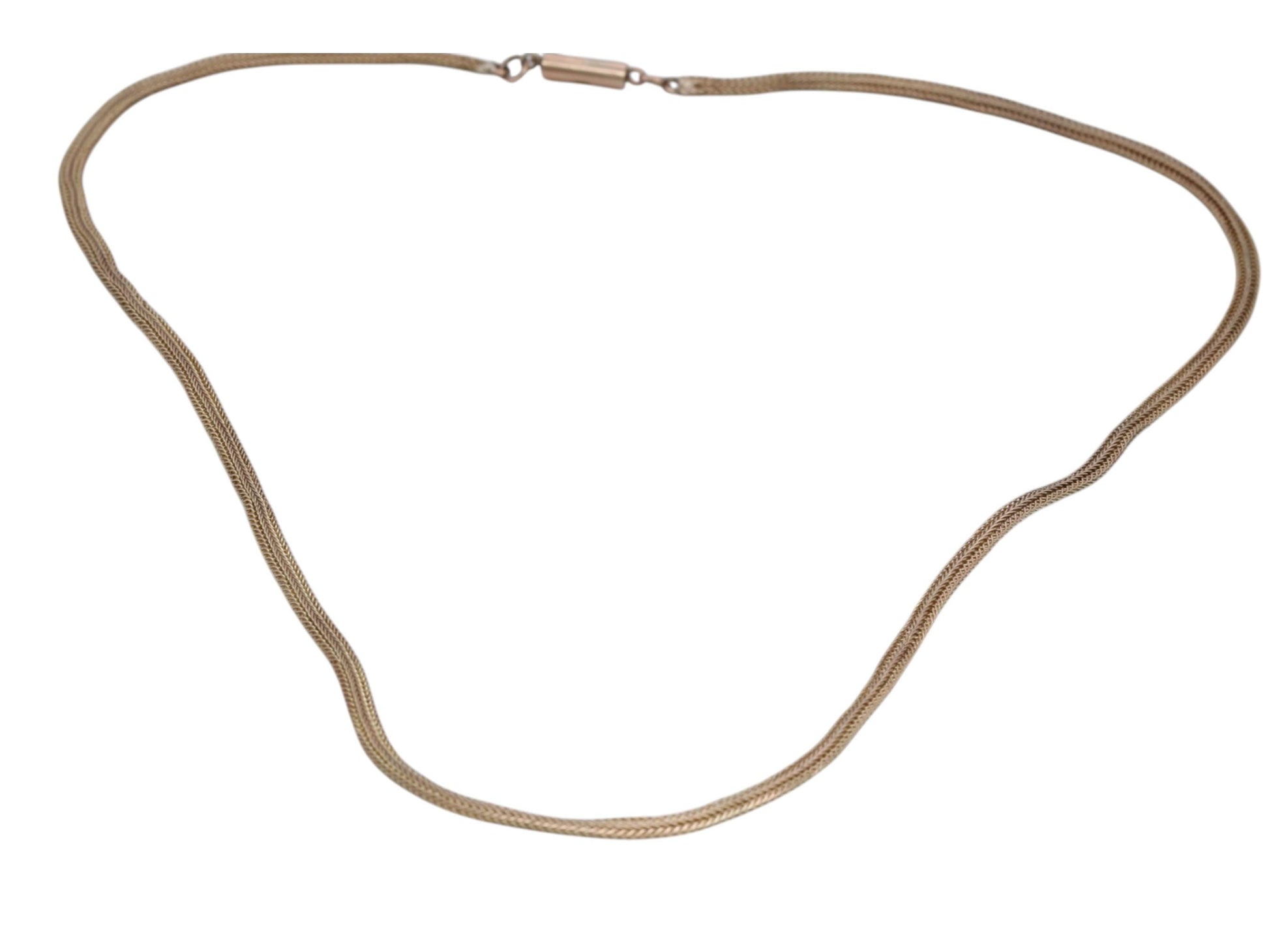 A finely crafted antique 9ct yellow gold foxtail link chain dating to the Edwardian era. This elegant piece showcases intricate craftsmanship, with beautifully woven foxtail links that reflect the quality of Edwardian-era jewellery. It features its original barrel clasp, adding to its authenticity and charm. In lovely condition, this is a timeless and versatile gold chain that pairs perfectly with pendants or can be worn alone as a refined statement.