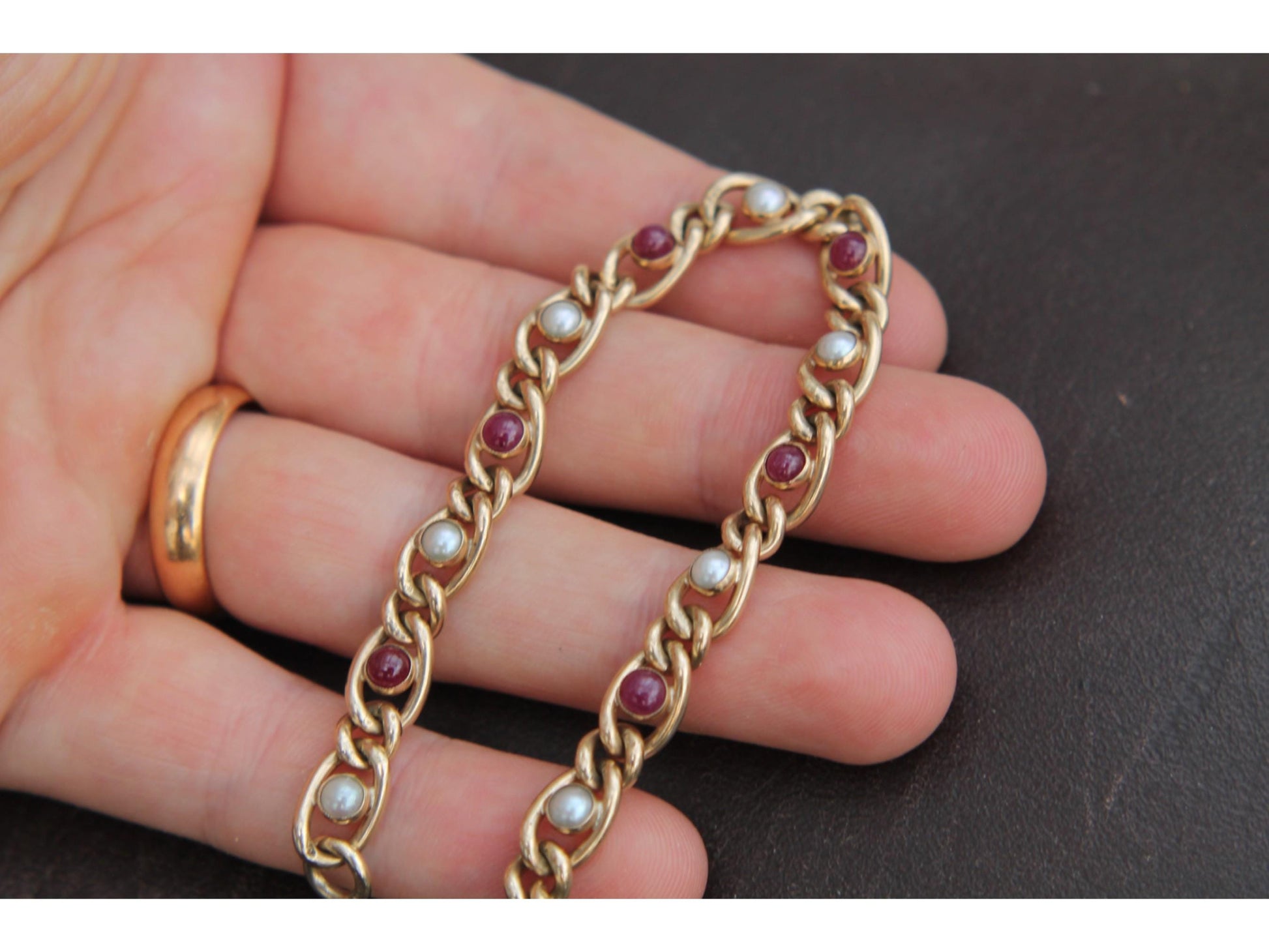 Antique 9ct Yellow Gold Ruby Cabochon Pearl Bracelet 1.75ct, 7.5"
