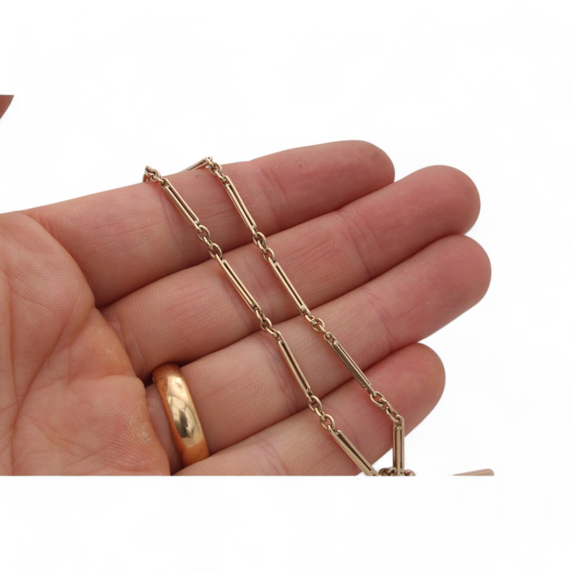 Perfect for pairing with a pocket watch or doubled as a bracelet, this chain is a versatile addition to any antique jewellry collection. Its warm yellow gold tone and distinctive design make it a standout piece for antique lovers.