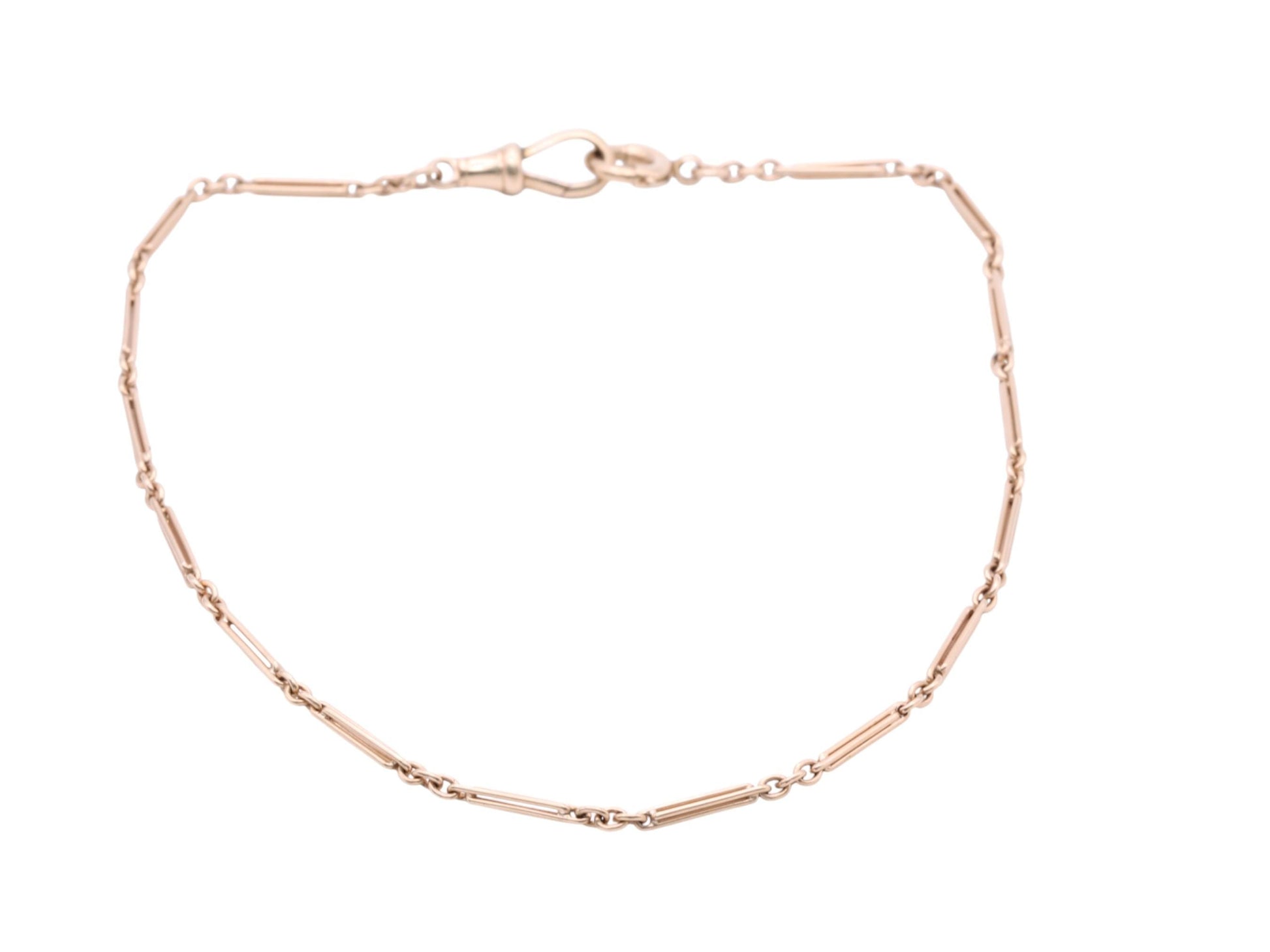 Measuring 13.25 inches in length, it is fitted with a dog clip at one end and a bolt ring clasp at the other, both in excellent working order. A beautifully made and versatile piece that carries the quiet sophistication of its era.