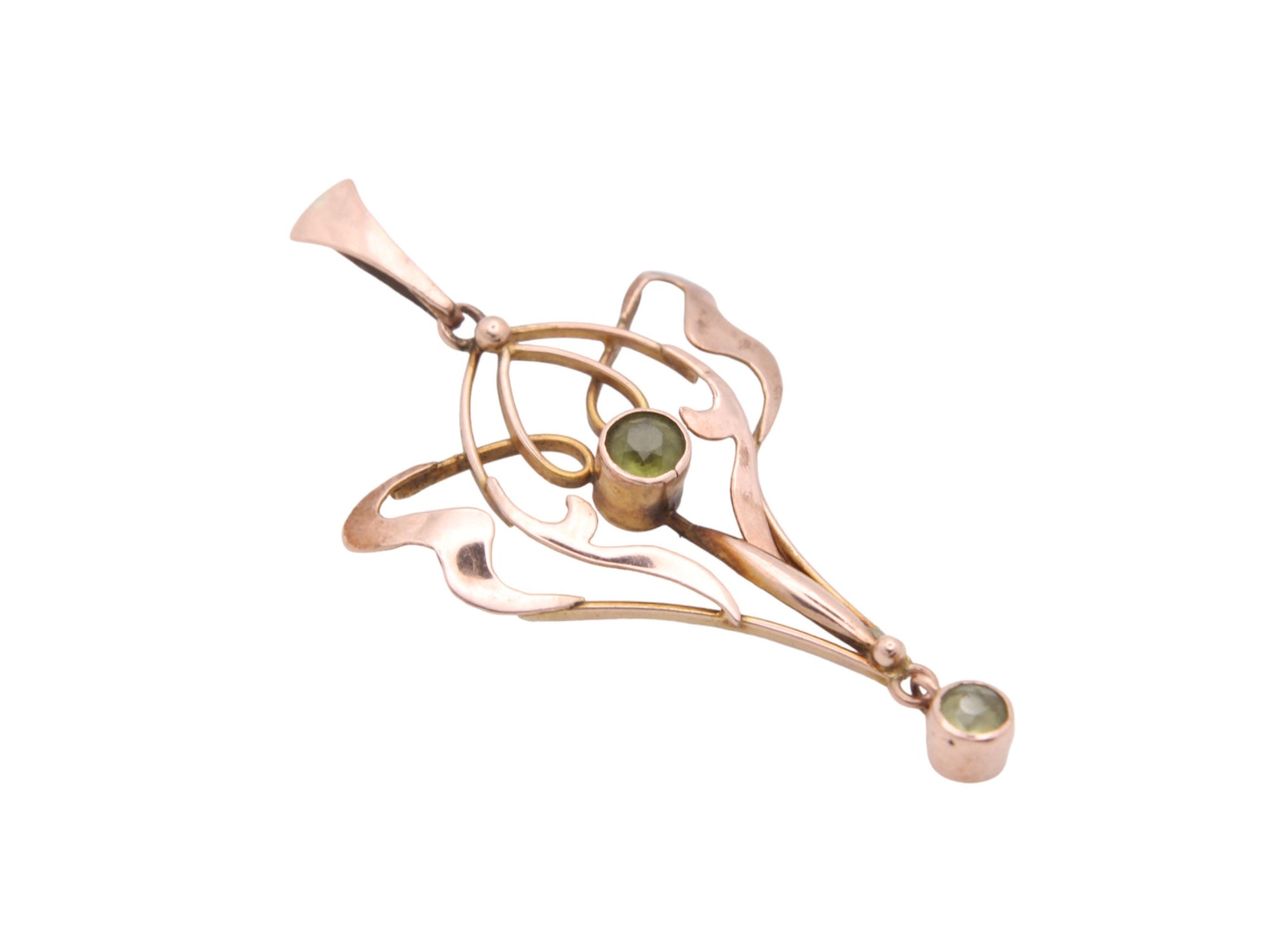 A captivating antique 9ct gold pendant adorned with two mesmerizing peridot gems. The graceful curves and intricate detailing characteristic of the Art Nouveau style are showcased in this exquisite piece. The vibrant green hue of the peridot gems adds a pop of colour and vitality to the rosy glow of the 9ct gold.