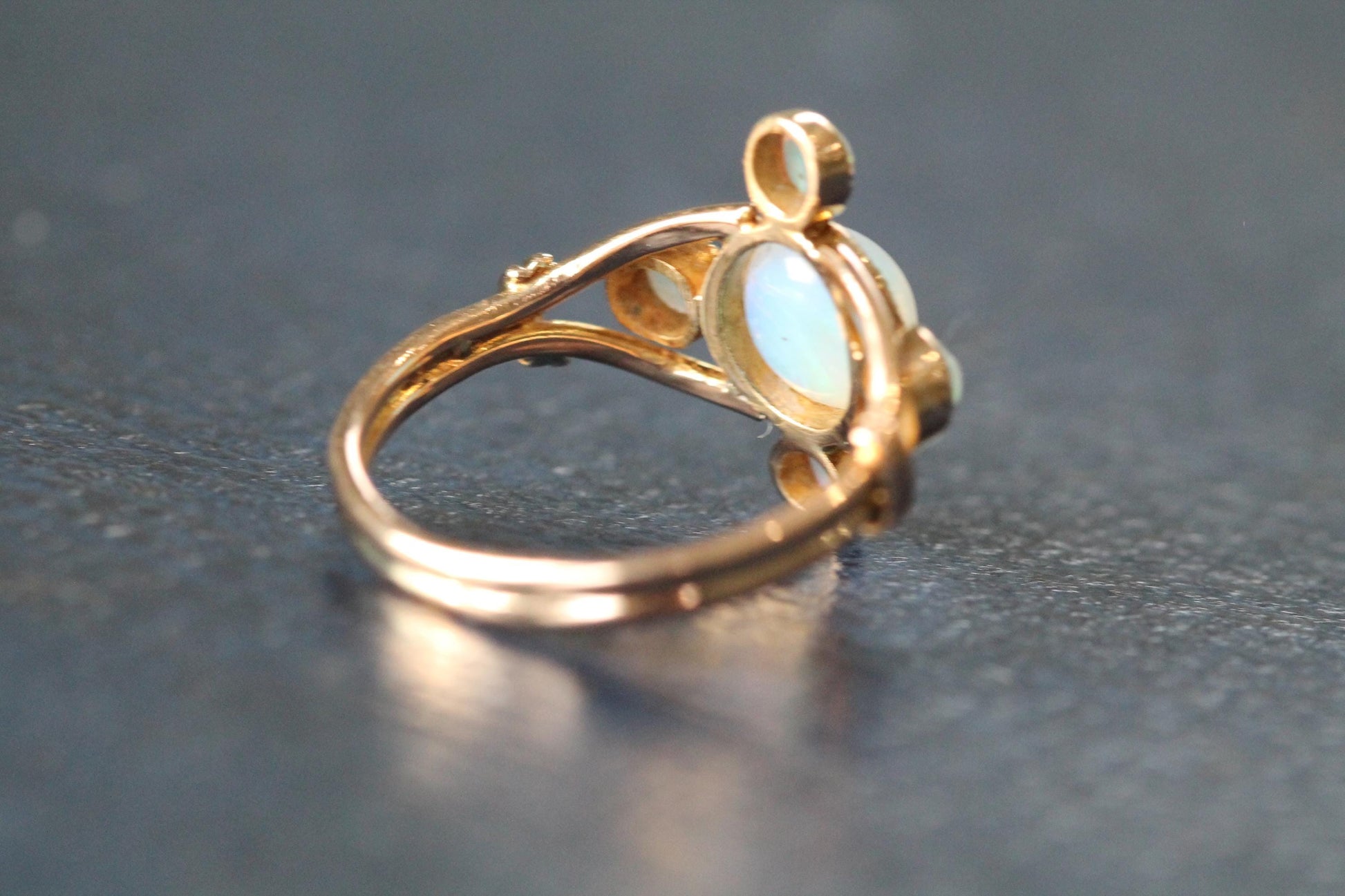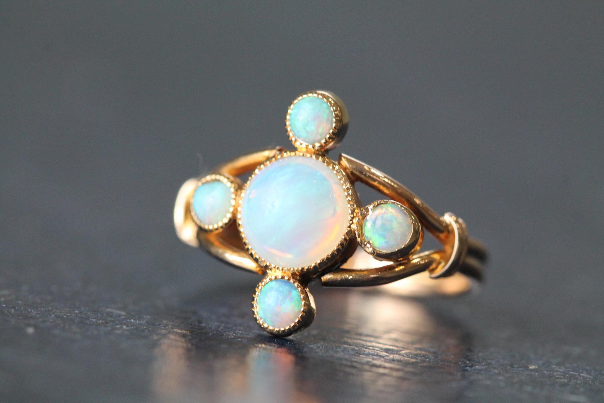 A stunning antique 15ct gold opal ring, beautifully crafted and dating to the Edwardian era. At its centre sits a glowing opal cabochon, alive with shifting colour and light. It is framed by four smaller opal cabochons — positioned at the top, bottom, left, and right — creating a wonderfully balanced and decorative cluster.